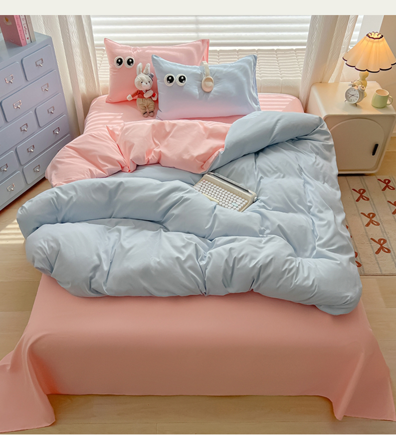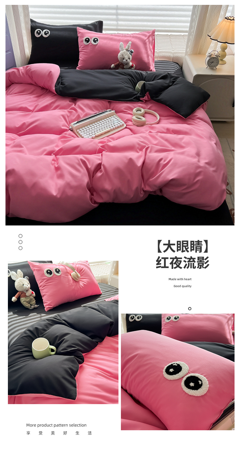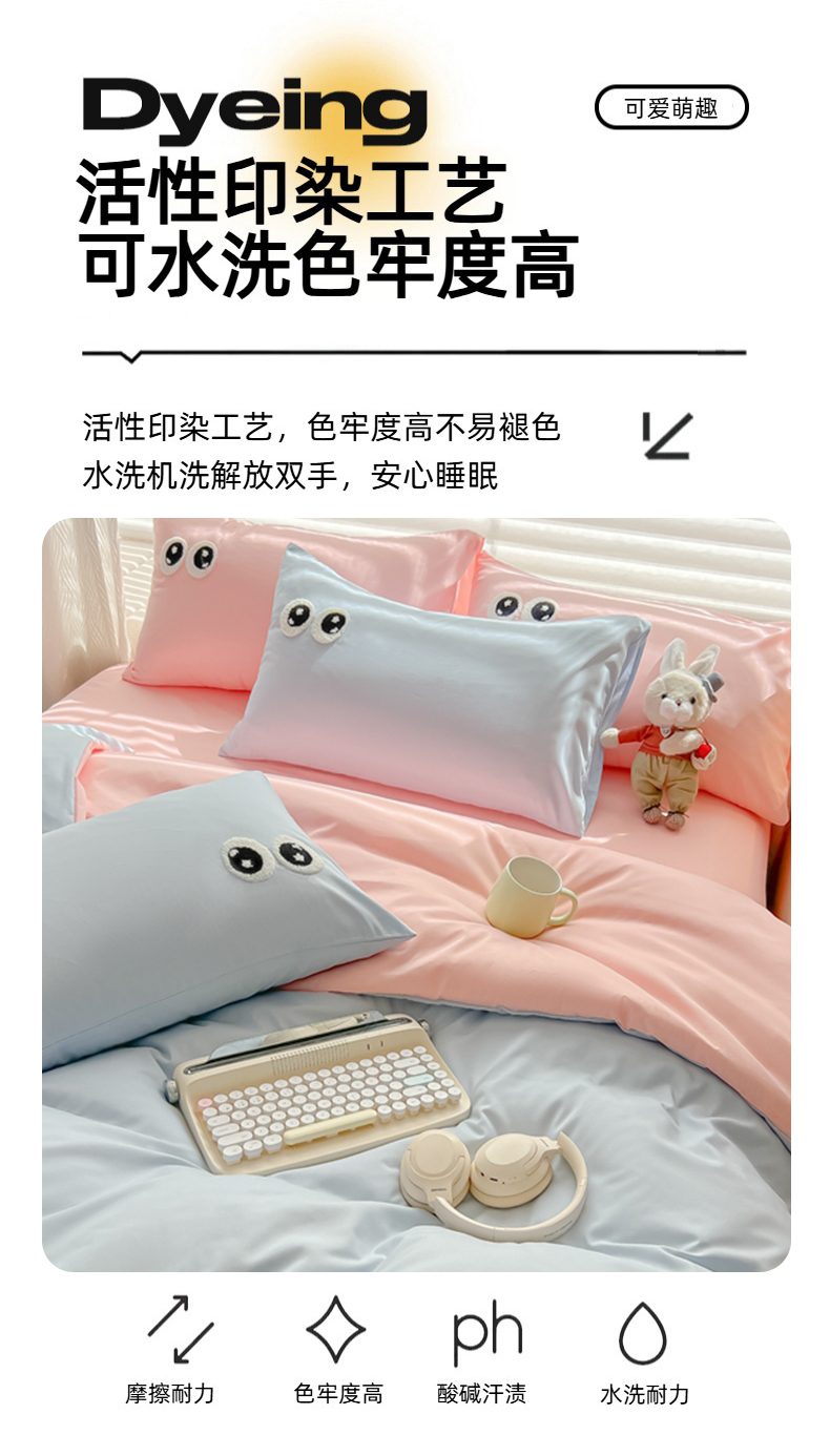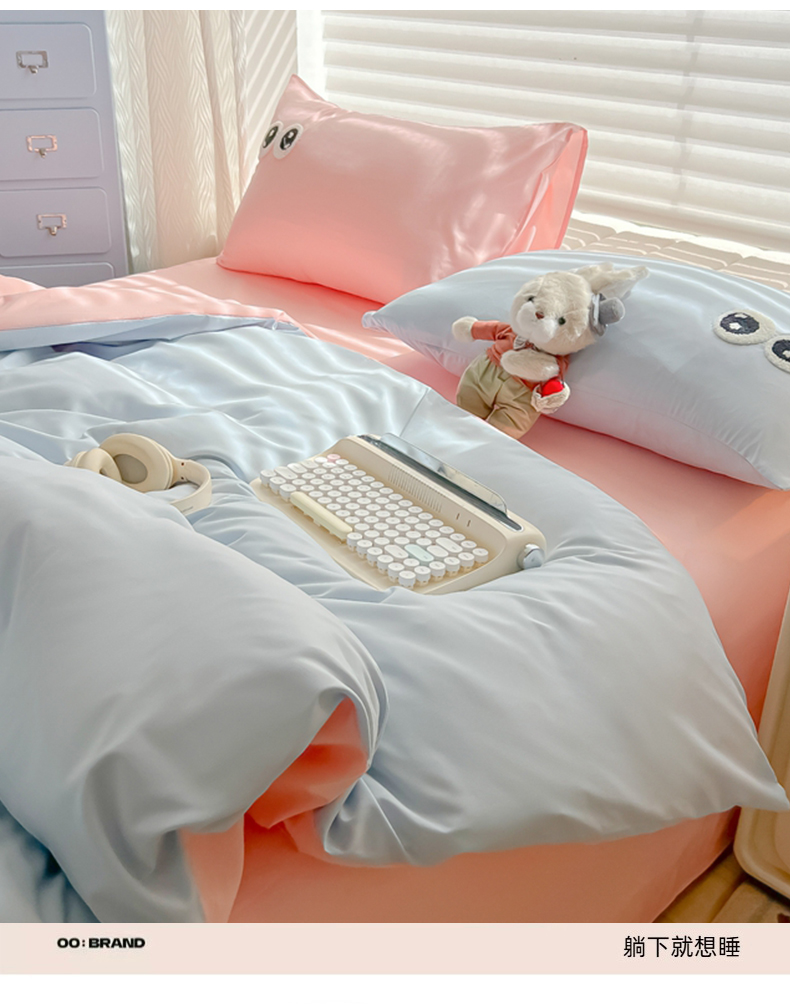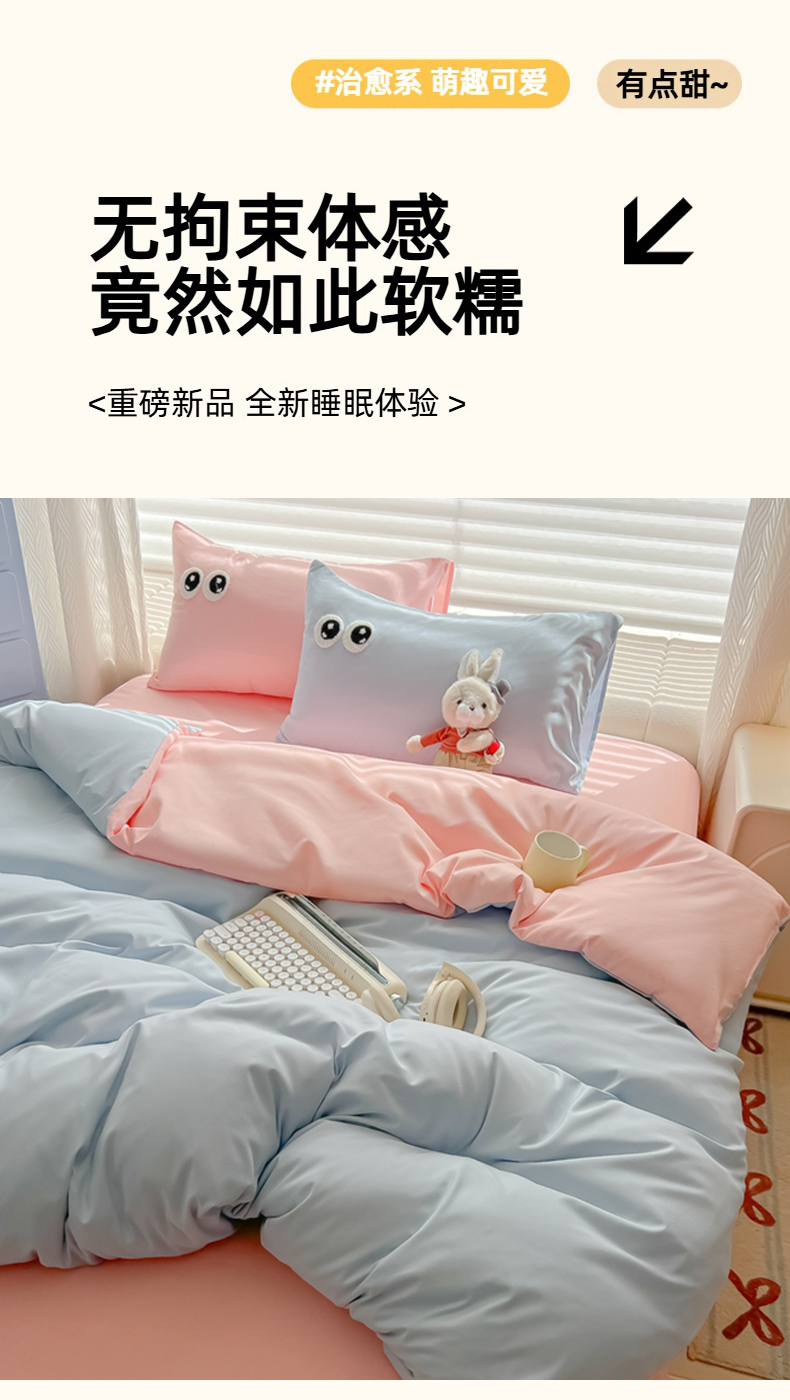 商品名称:(总)(有买家秀)2025新款大眼睛毛巾绣水洗棉纯色双拼四件套简约高级治愈风超柔舒适床上用品