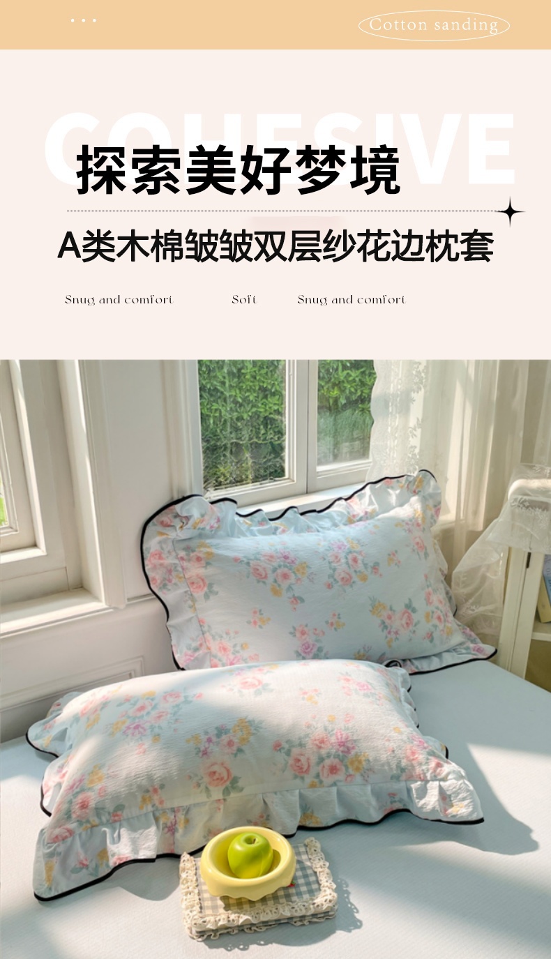 商品名称:梦舒羽 2025新款皱皱双层纱花边枕套宿舍情侣枕芯套单人枕头套 繁花入梦