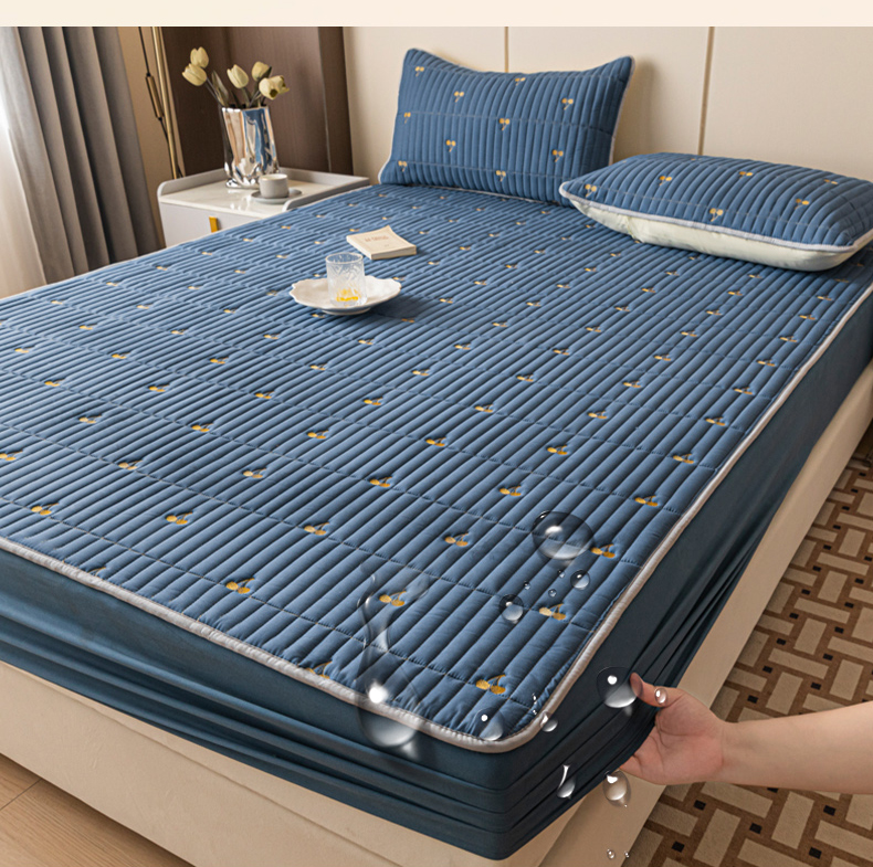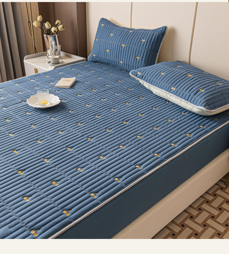 • 91家纺网 家纺一手货源 找家纺 暖季家纺 2025新款A类亲肤面料夹棉绣花床笠-不防水款 小樱桃-宾利蓝-普通款
