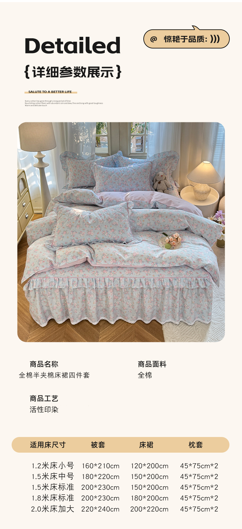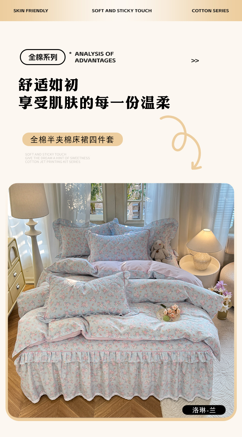 商品名称:美达家纺2025全棉蕾丝小花边夹棉床裙四件套 洛琳-兰