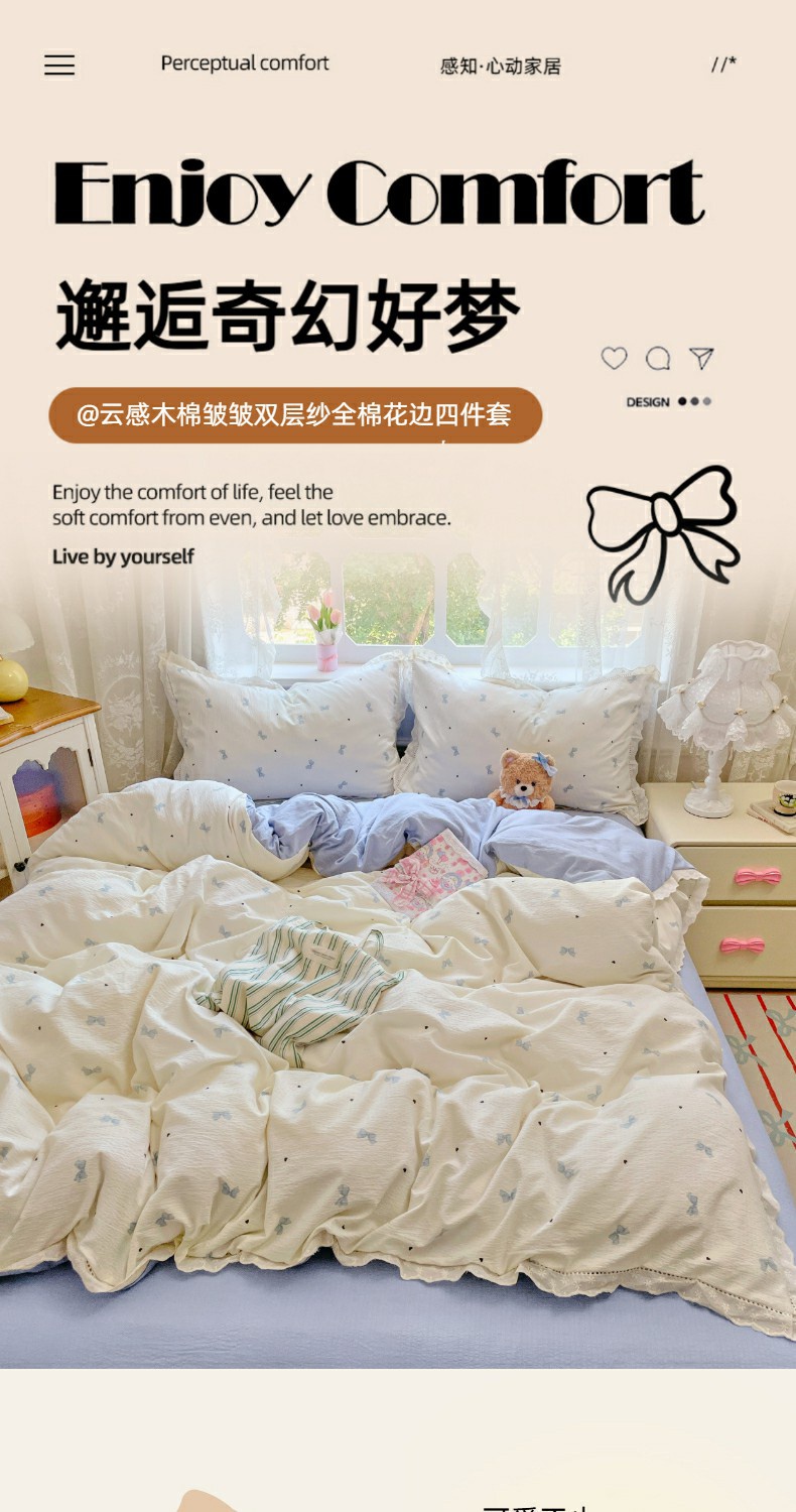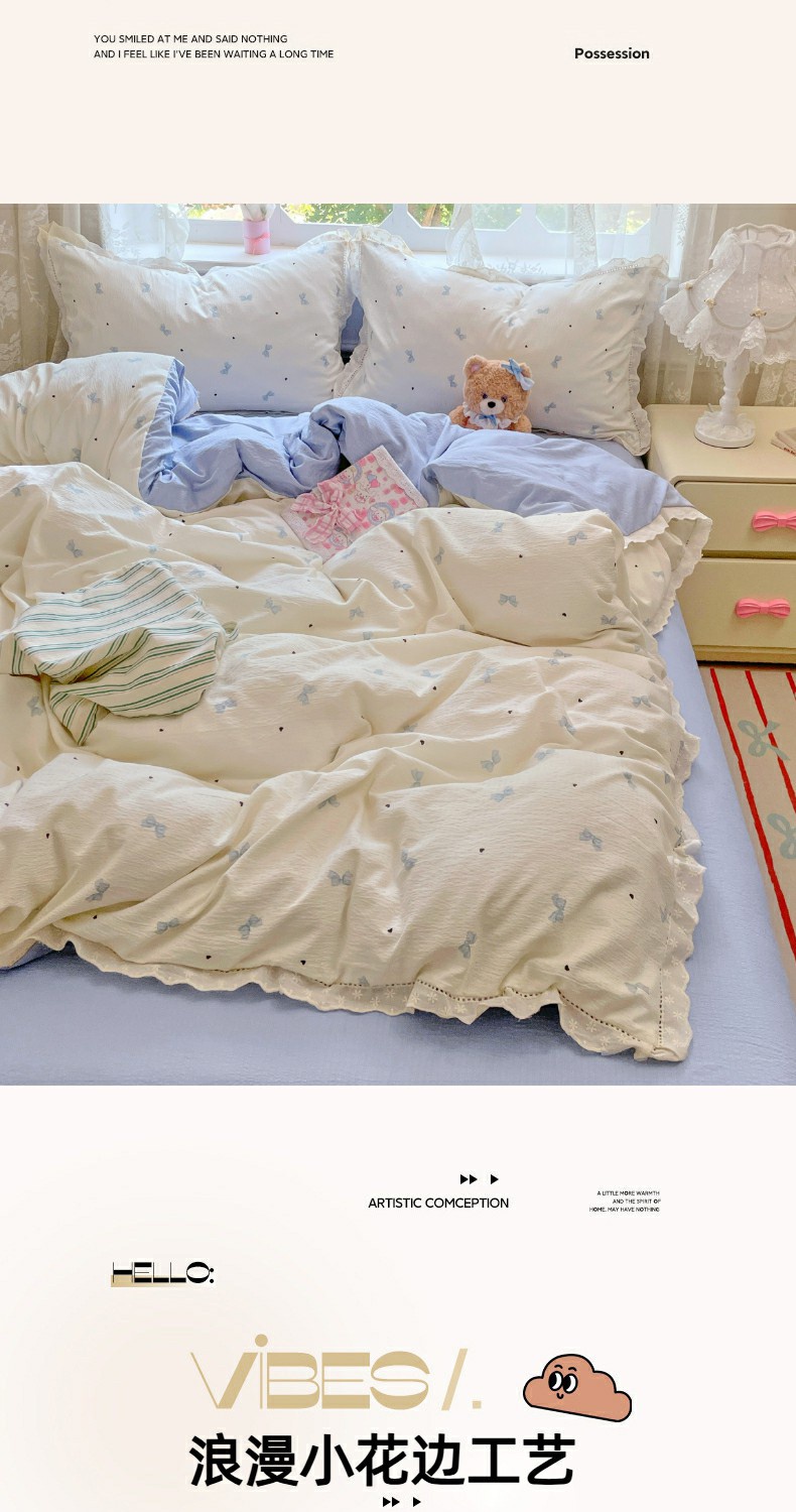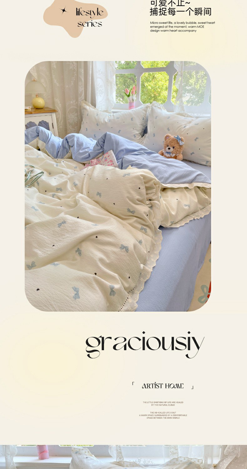 当前位置: 91家纺网 > 商品网购 > 床品套件 > 四件套 > 其它四件套 > 优尚佳生活馆 2025新款云感木棉皱皱双层纱全棉镂空花边四件套(提供买家秀) 蝴蝶蓝