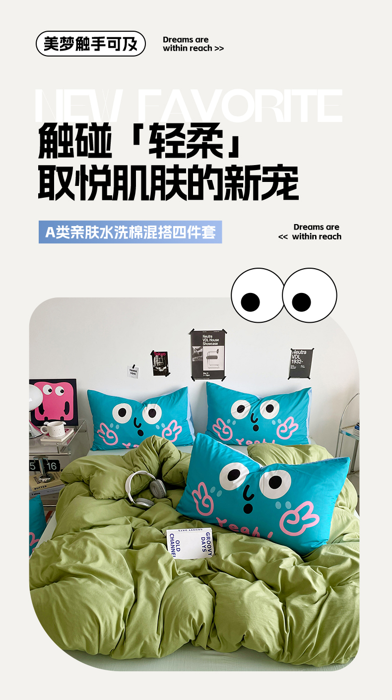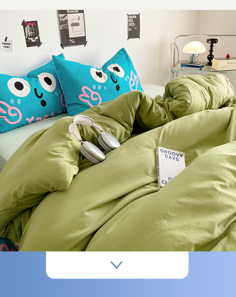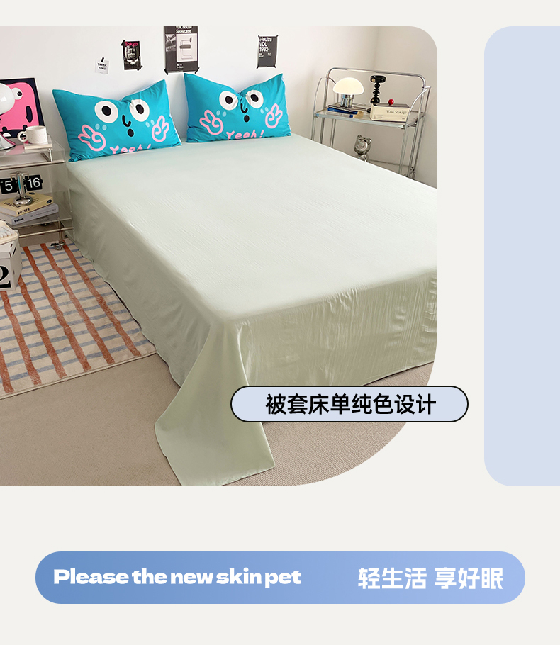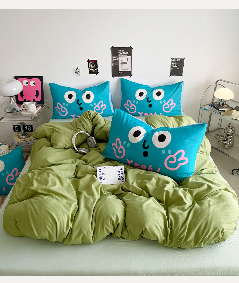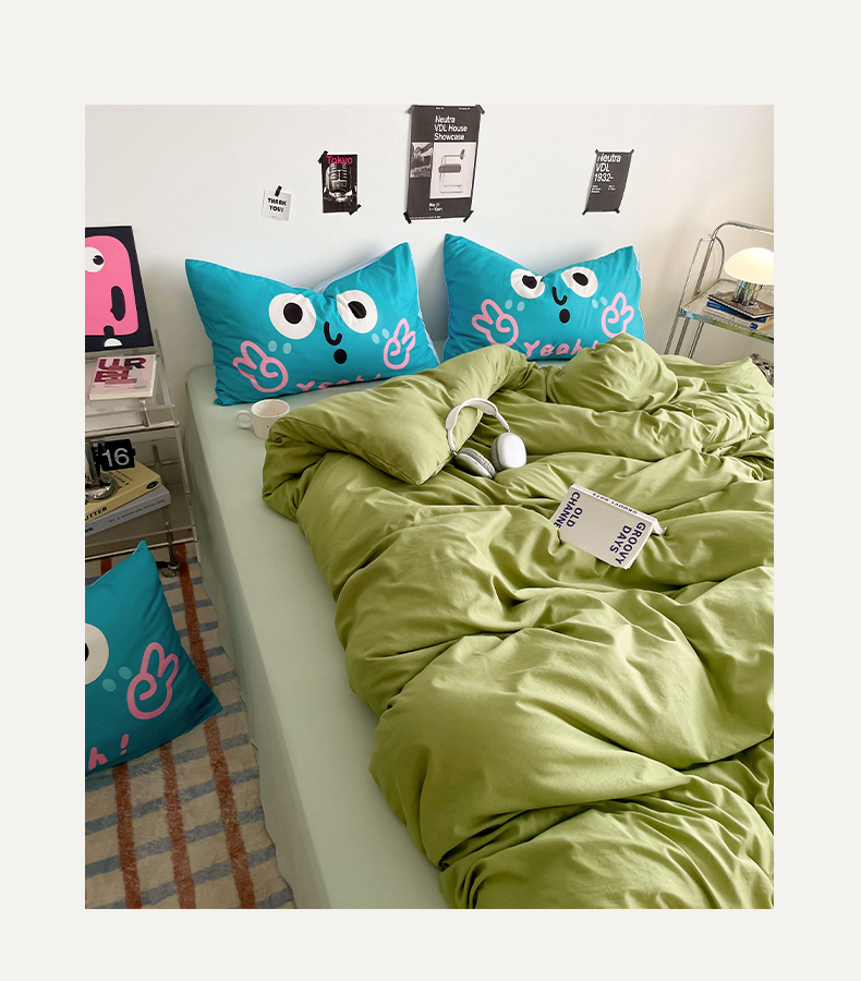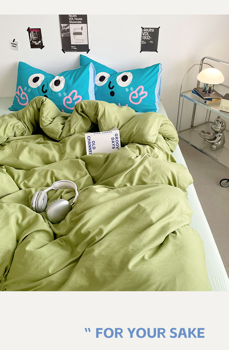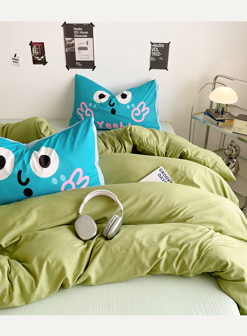 当前位置: 91家纺网 > 商品网购 > 床品套件 > 四件套 > 水洗棉四件套 > 优卡迪家纺馆 2025新款A类亲肤水洗棉大眼萌纯色混搭四件套 大眼萌-浅绿茶