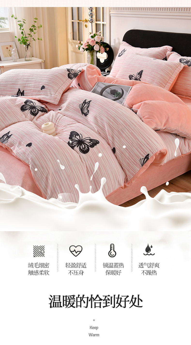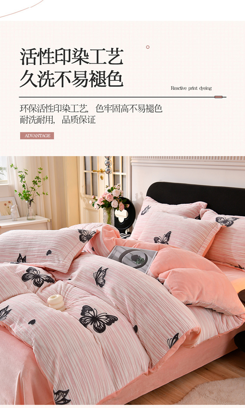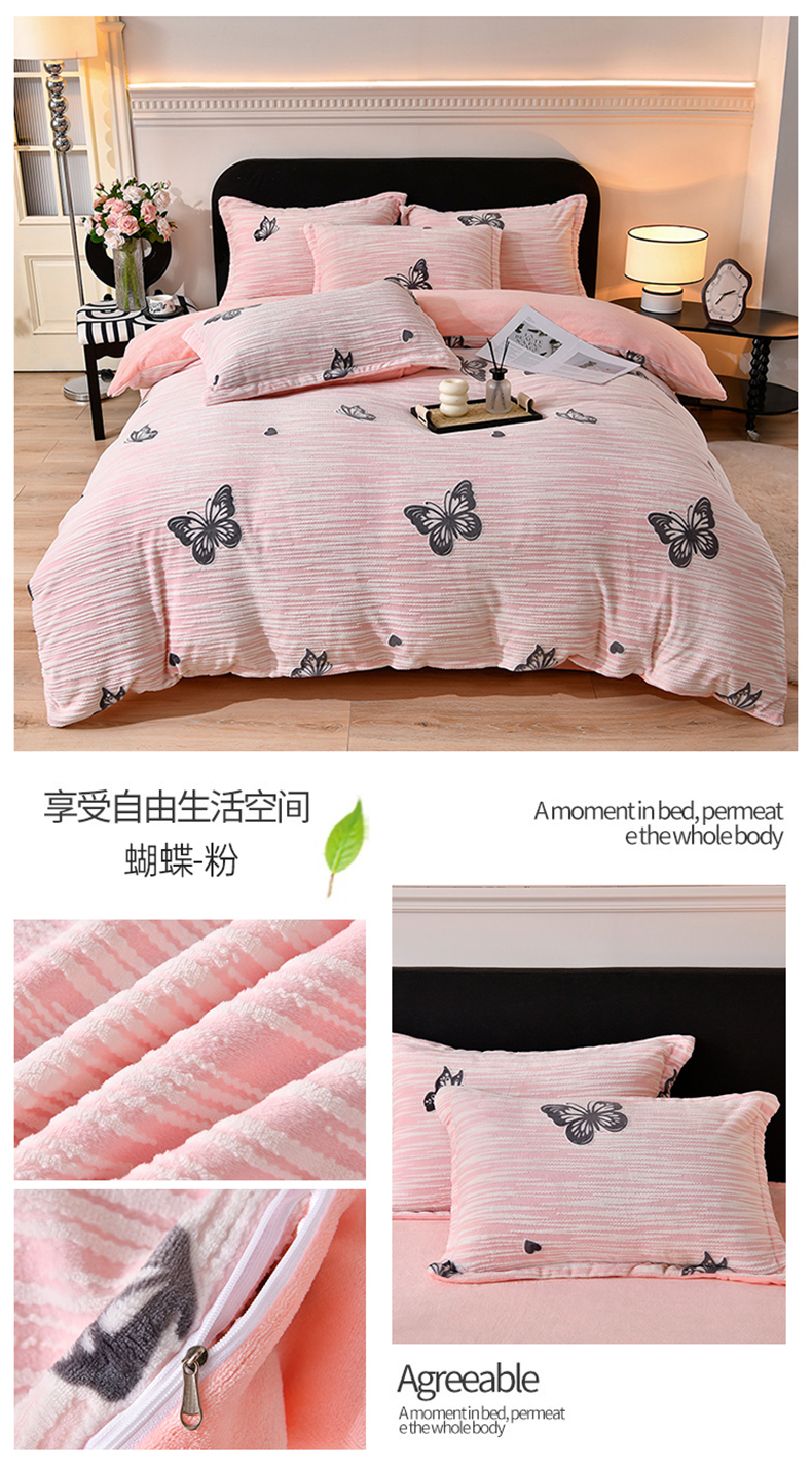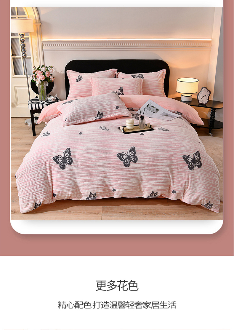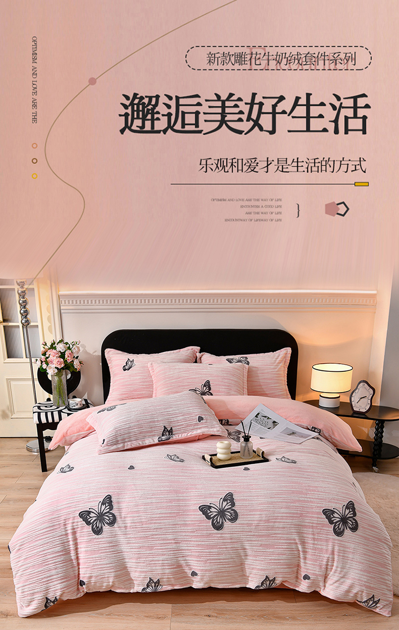 商品名称:梦之星 2025新款8斤重牛奶绒6D雕花绒四件套法莱水晶金貂 蝴蝶-粉