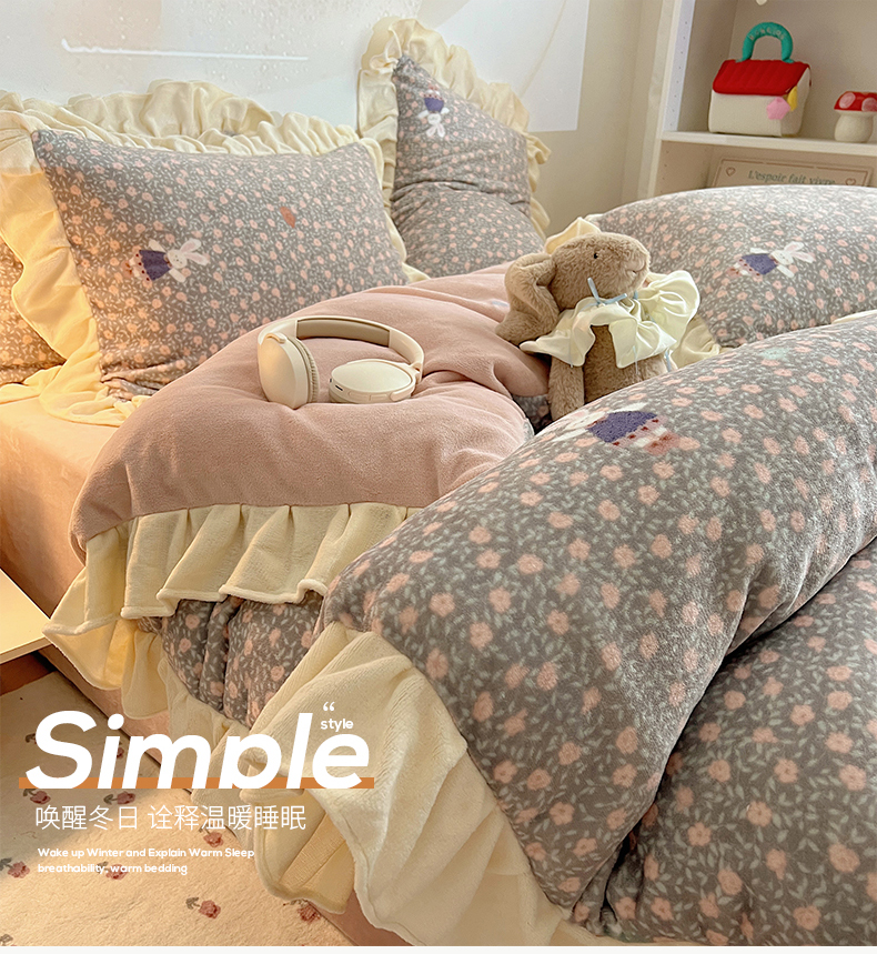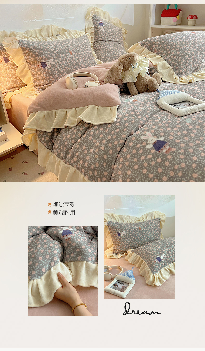 当前位置: 91家纺网 > 商品网购 > 床品套件 > 四件套 > 牛奶绒四件套 > 桃子家居 2025新款A类ins韩版花边少女心可爱卡通碎花加厚牛奶绒四件套 绒-花边甜甜小兔