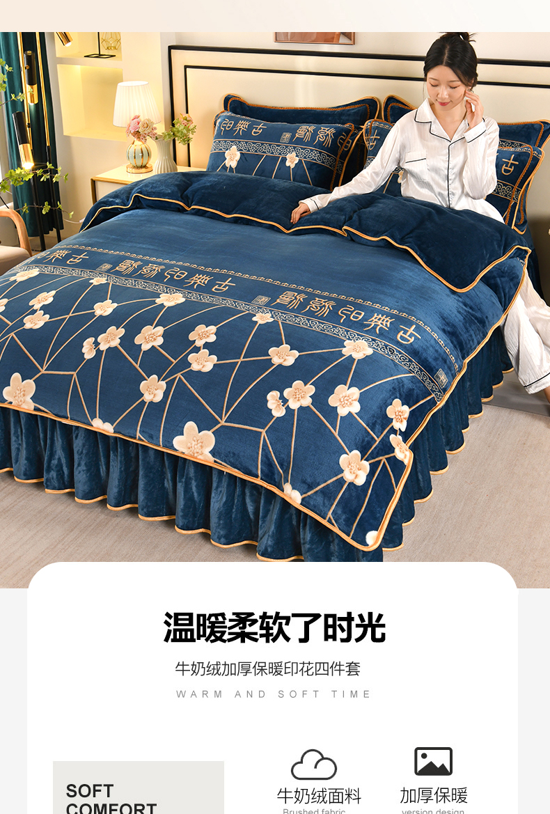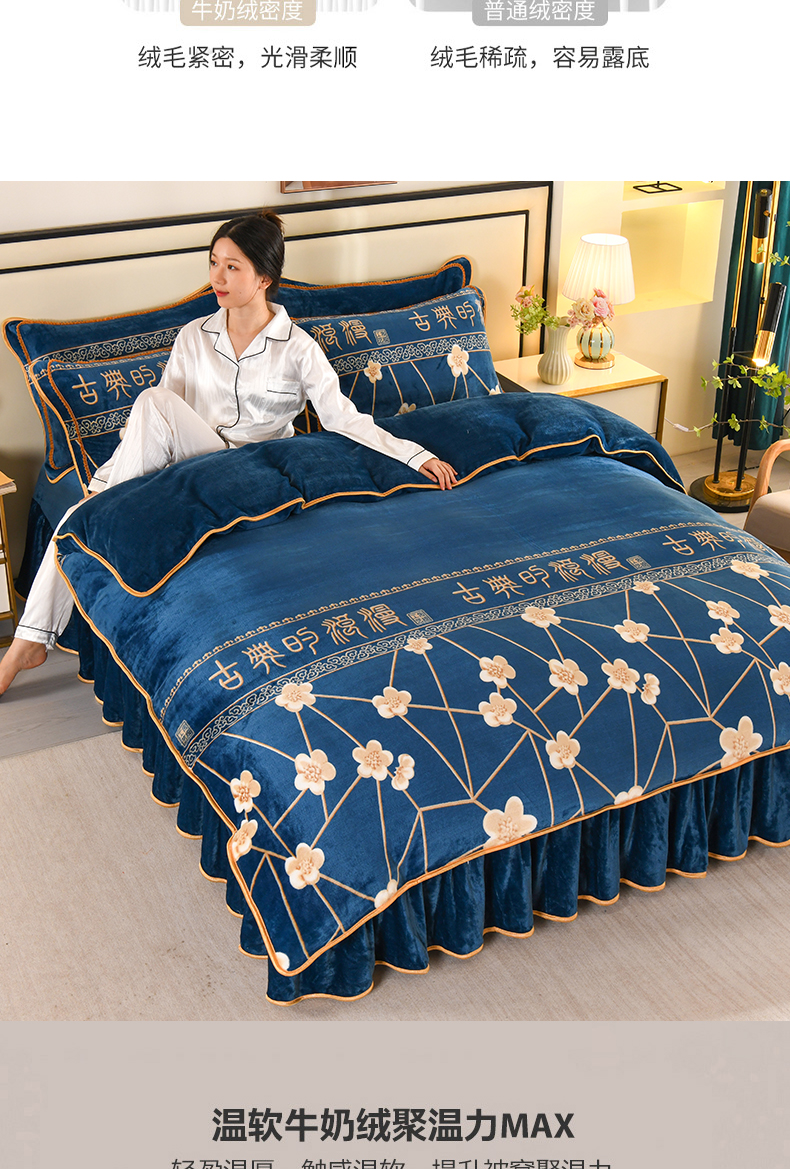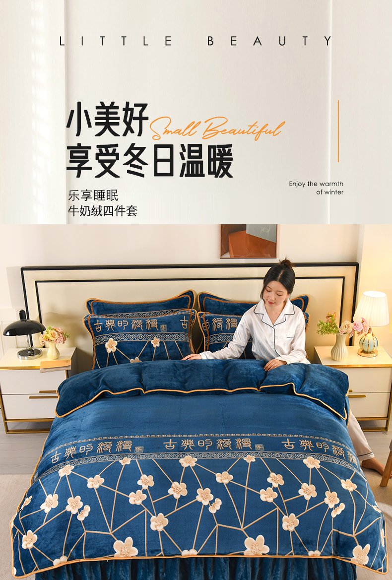 当前位置: 91家纺网 > 商品网购 > 床品套件 > 四件套 > 牛奶绒四件套 > 莱凯家纺 2025新款牛奶绒四件套保暖加厚金貂绒套件玉魄梅香