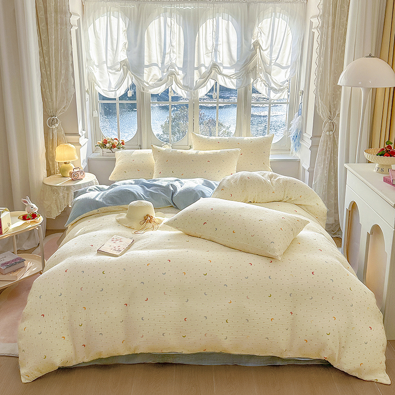 • 91家纺网 家纺一手货源 找家纺 (总)木楌家居 2025新款全棉纯棉彩点皱皱纱贝壳边四件套,夜曲