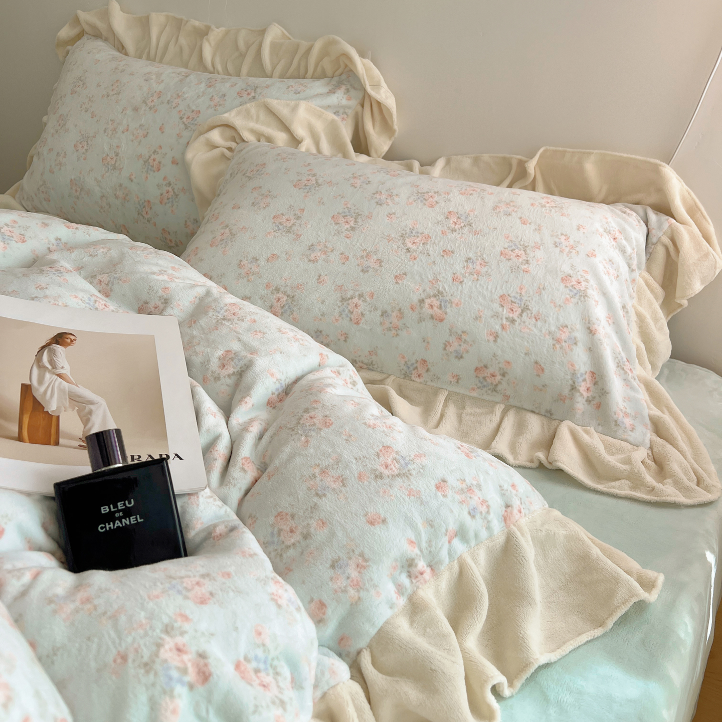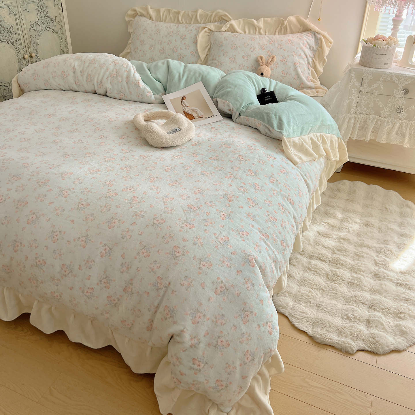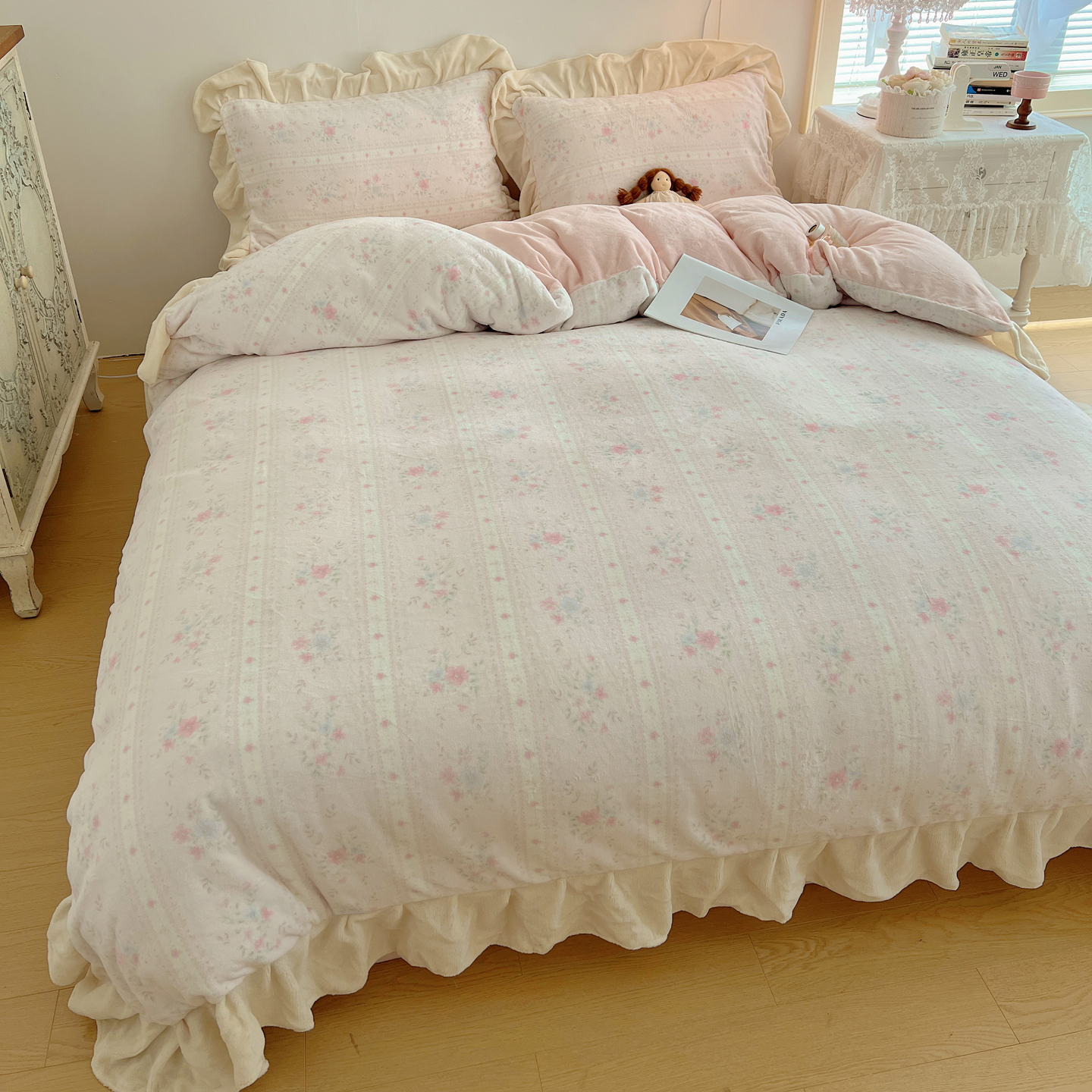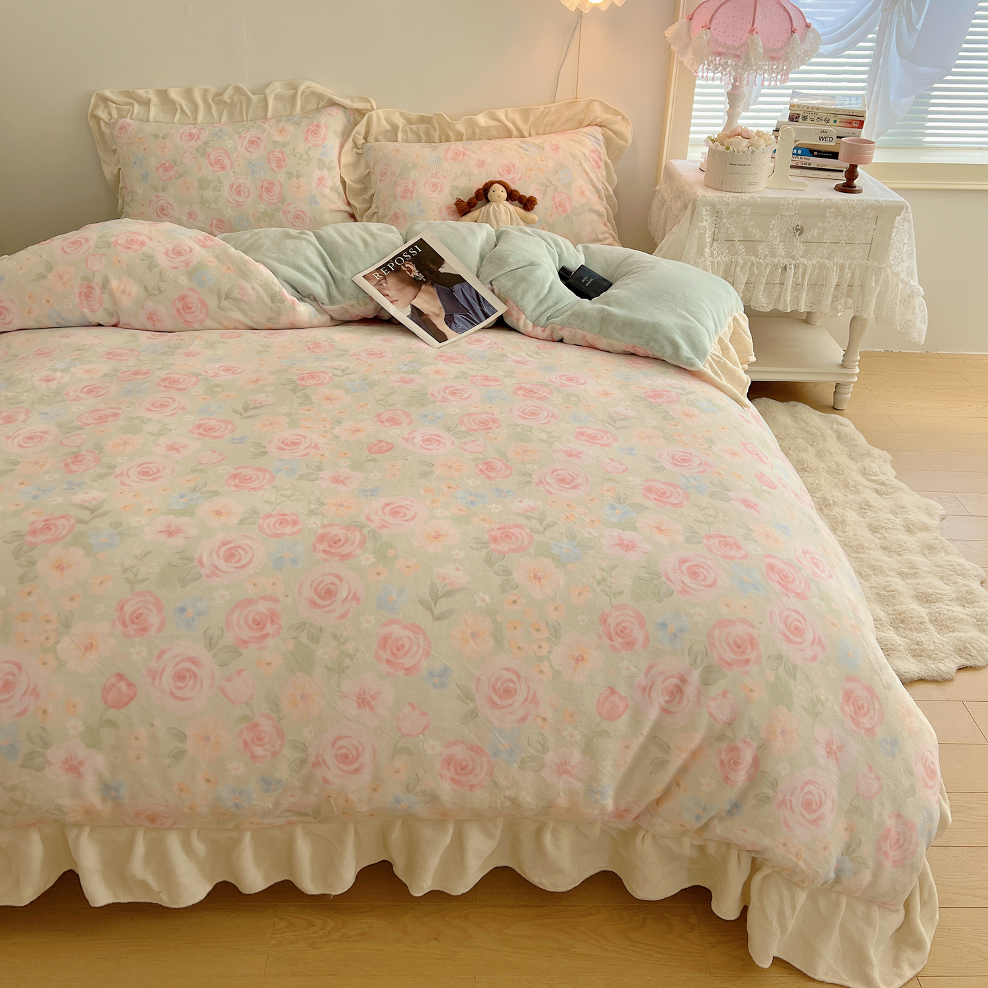 商品名称:桃喜 2025新款牛奶绒碎花花边系列四件套【会员-5】 山茶