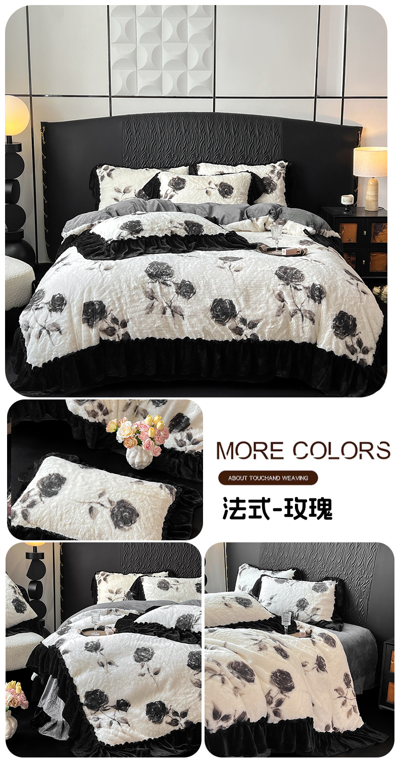 商品名称:创爱家纺 2025新款法式韩版花边兔毛绒印花四件套 法式花边-莫奈花园