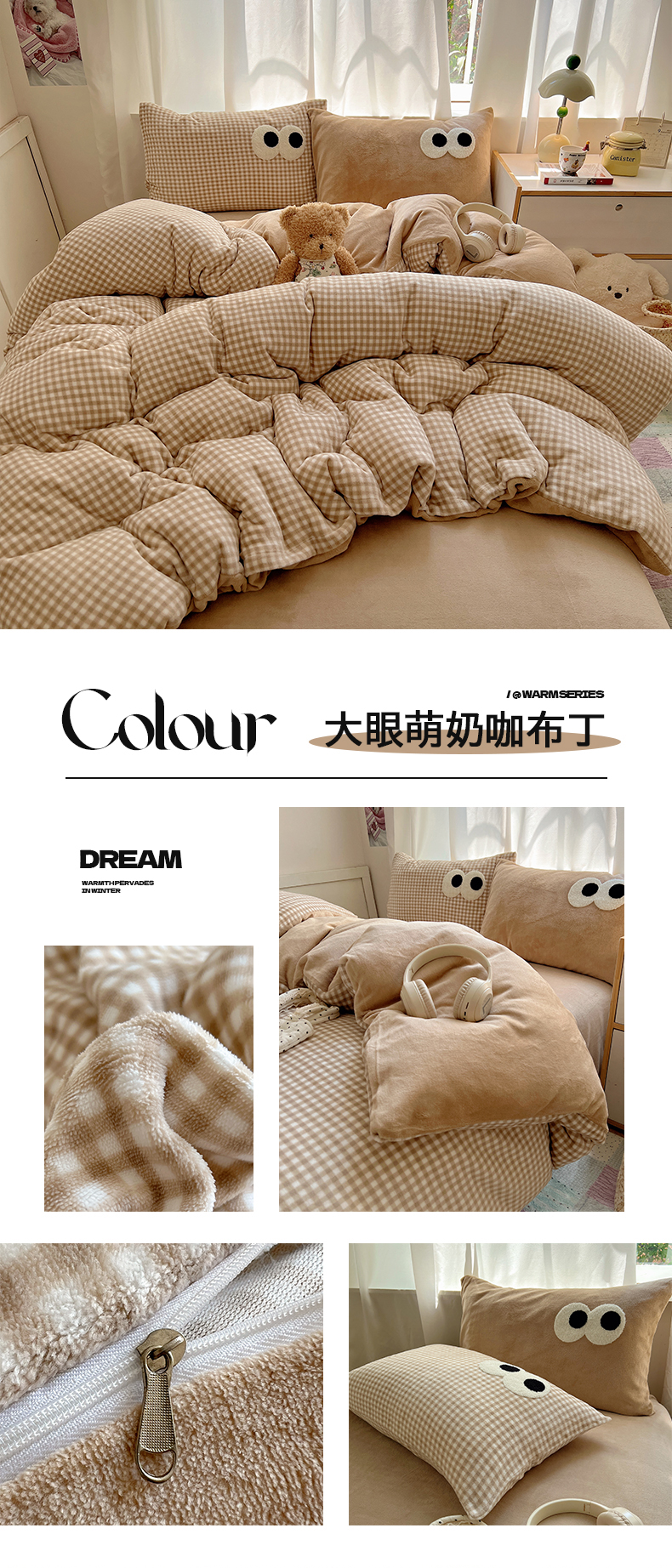 当前位置: 91家纺网 > 商品网购 > 床品套件 > 四件套 > 牛奶绒四件套 > 桃子家居 2025新款A类ins加厚毛巾绣大眼萌混搭撞色奶油格子牛奶绒系列四件套 绒毛巾绣-大眼萌葡萄奶缇