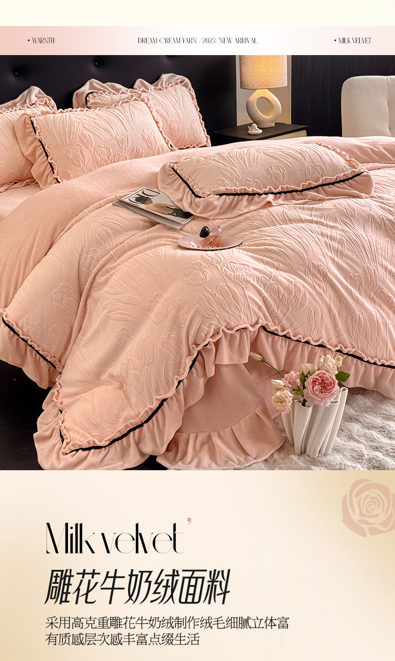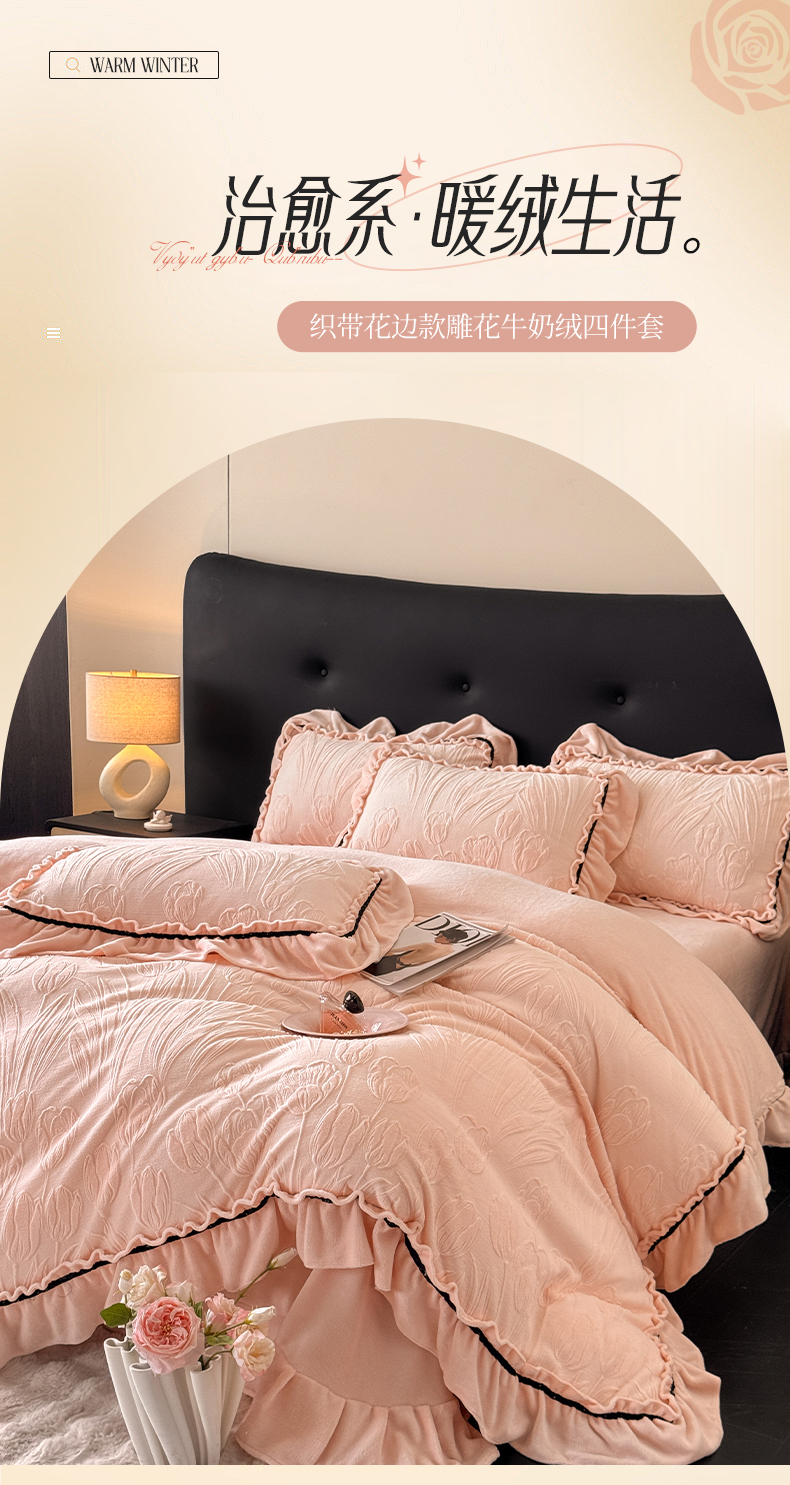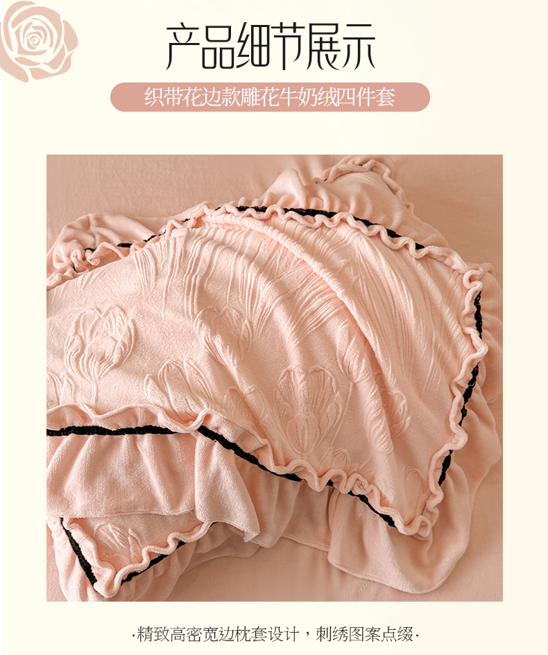 绘萱家居 2025新款新品爆款高密消光织带花边款雕花牛奶绒四件套 艾薇儿-粉