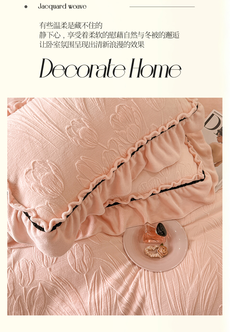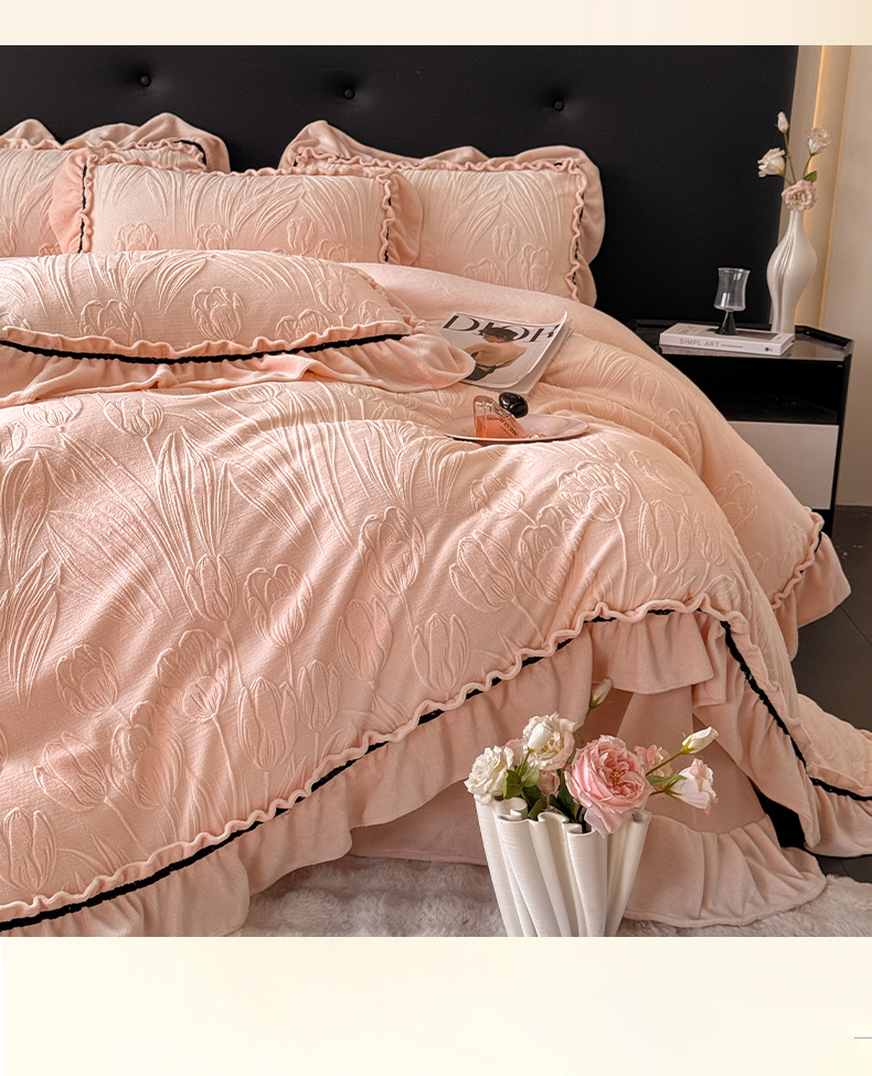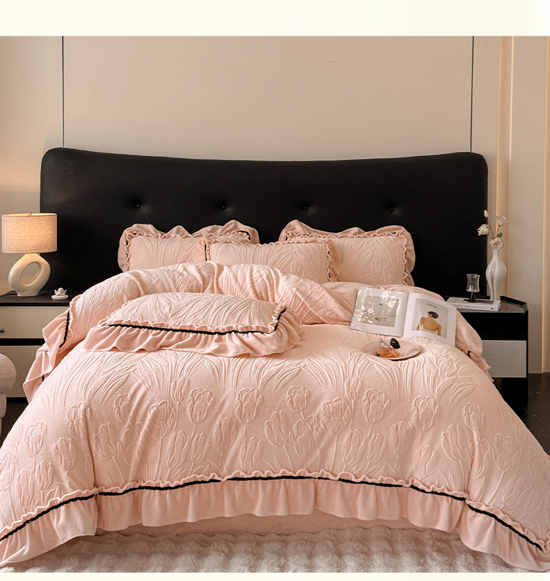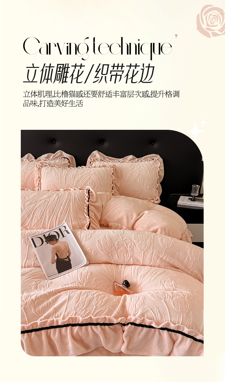 绘萱家居 2025新款新品爆款高密消光织带花边款雕花牛奶绒四件套 艾薇儿-粉