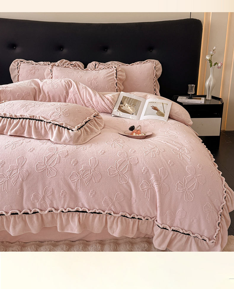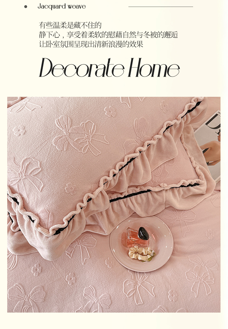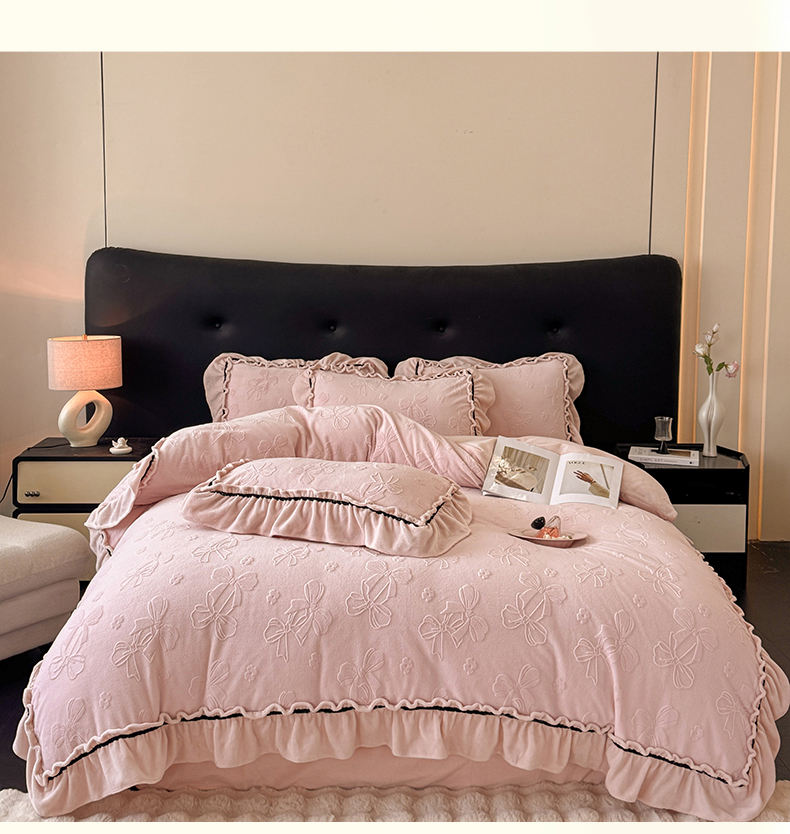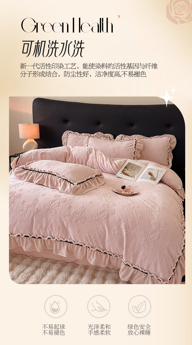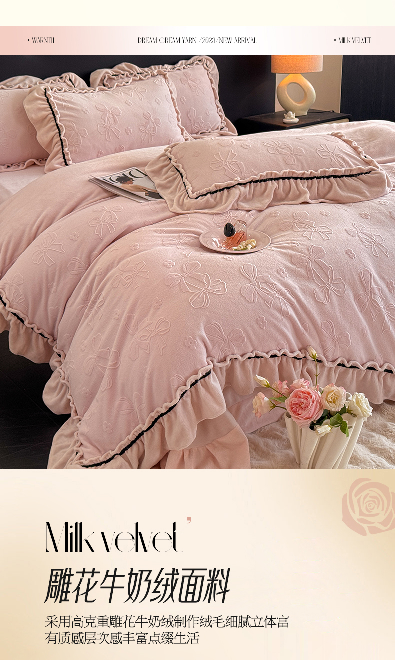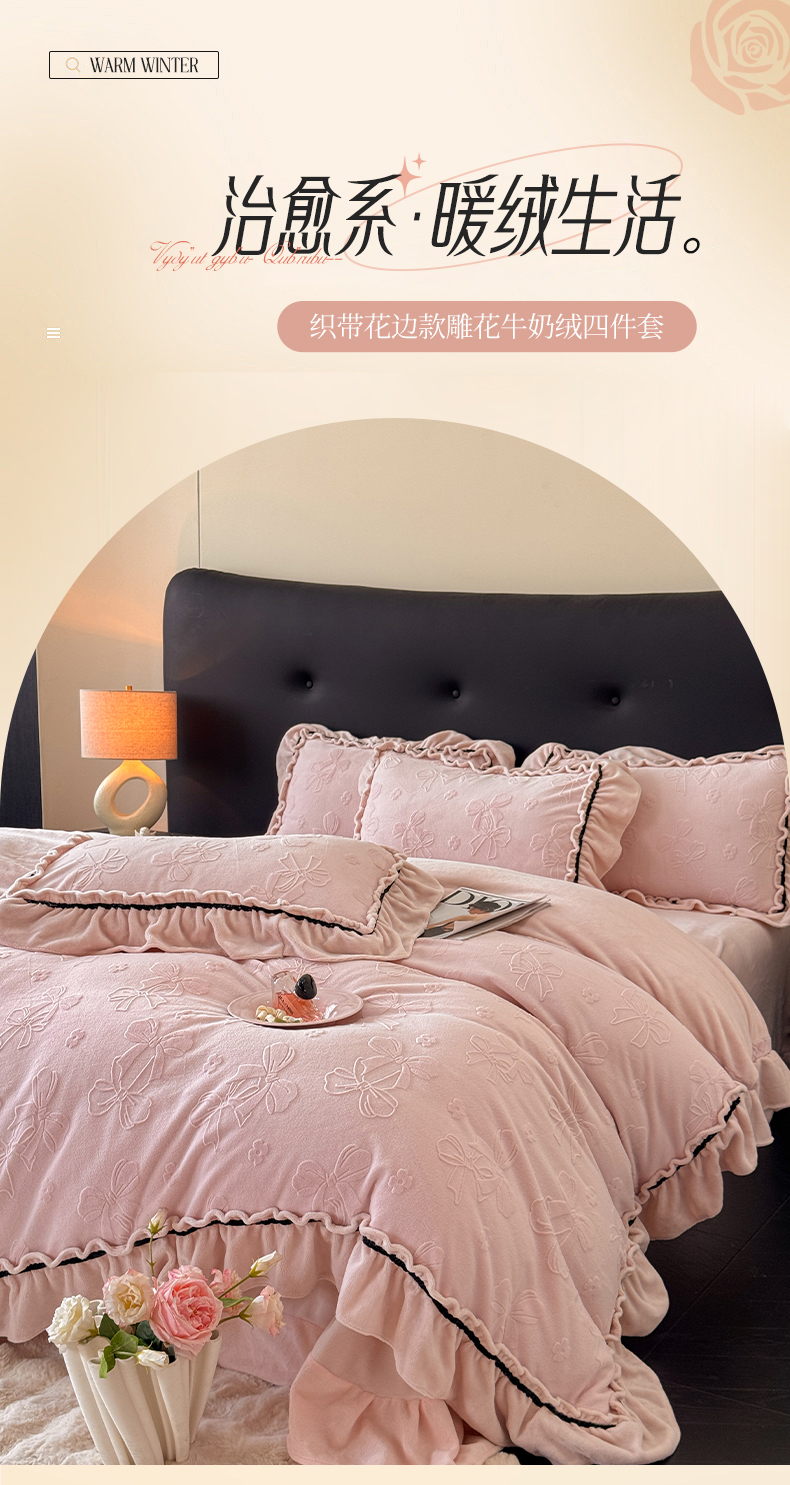 绘萱家居 2025新款新品爆款高密消光织带花边款雕花牛奶绒四件套 薇薇安-粉