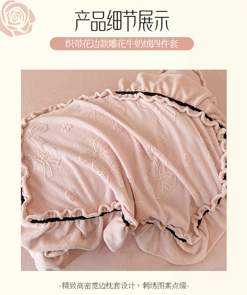 商品名称:绘萱家居 2025新款新品爆款高密消光织带花边款雕花牛奶绒四件套 薇薇安-粉