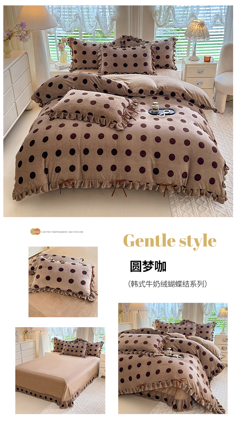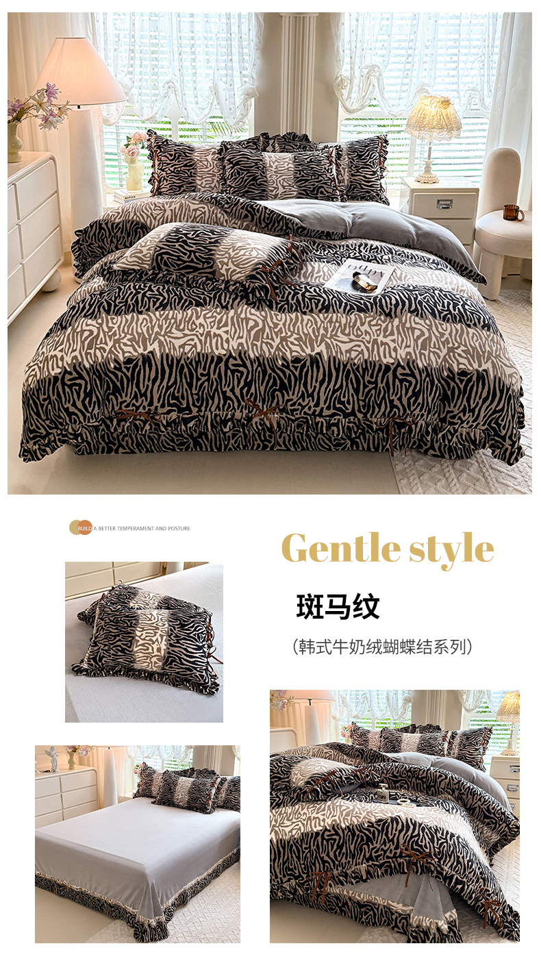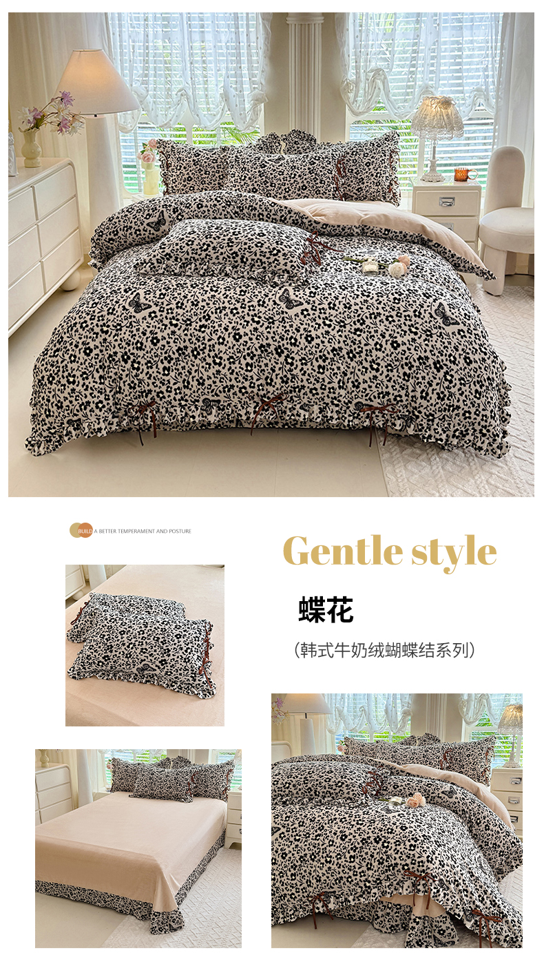 (总)韩约家纺 2025新款韩式蝴蝶结牛奶绒床盖款四件套,圆梦咖,斑马纹,豹纹小熊,彩色波点,黛香,蝶花,粉色豹纹,花枝韵,锦蝶,可心,浪漫花海,迷你字母