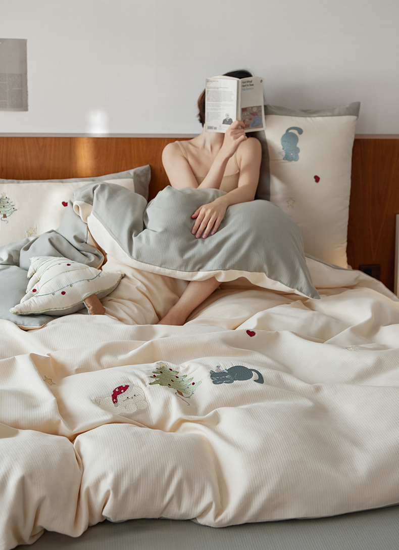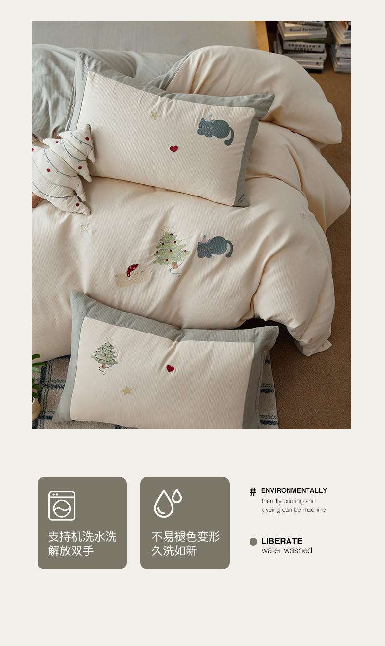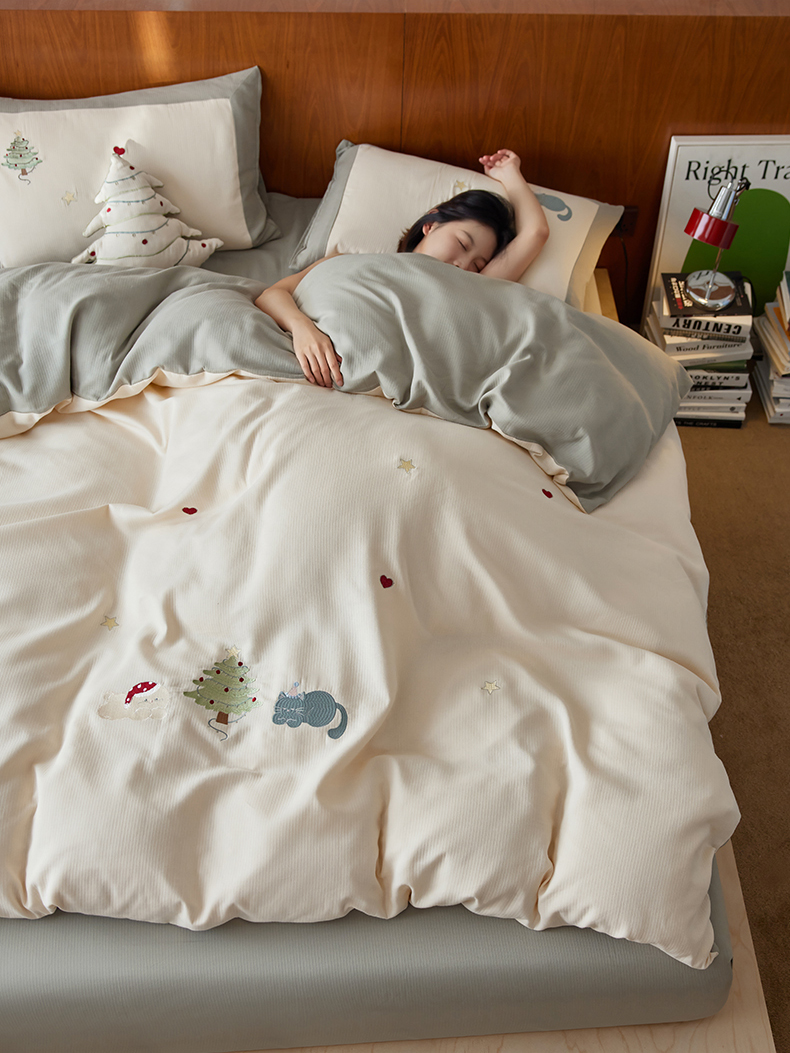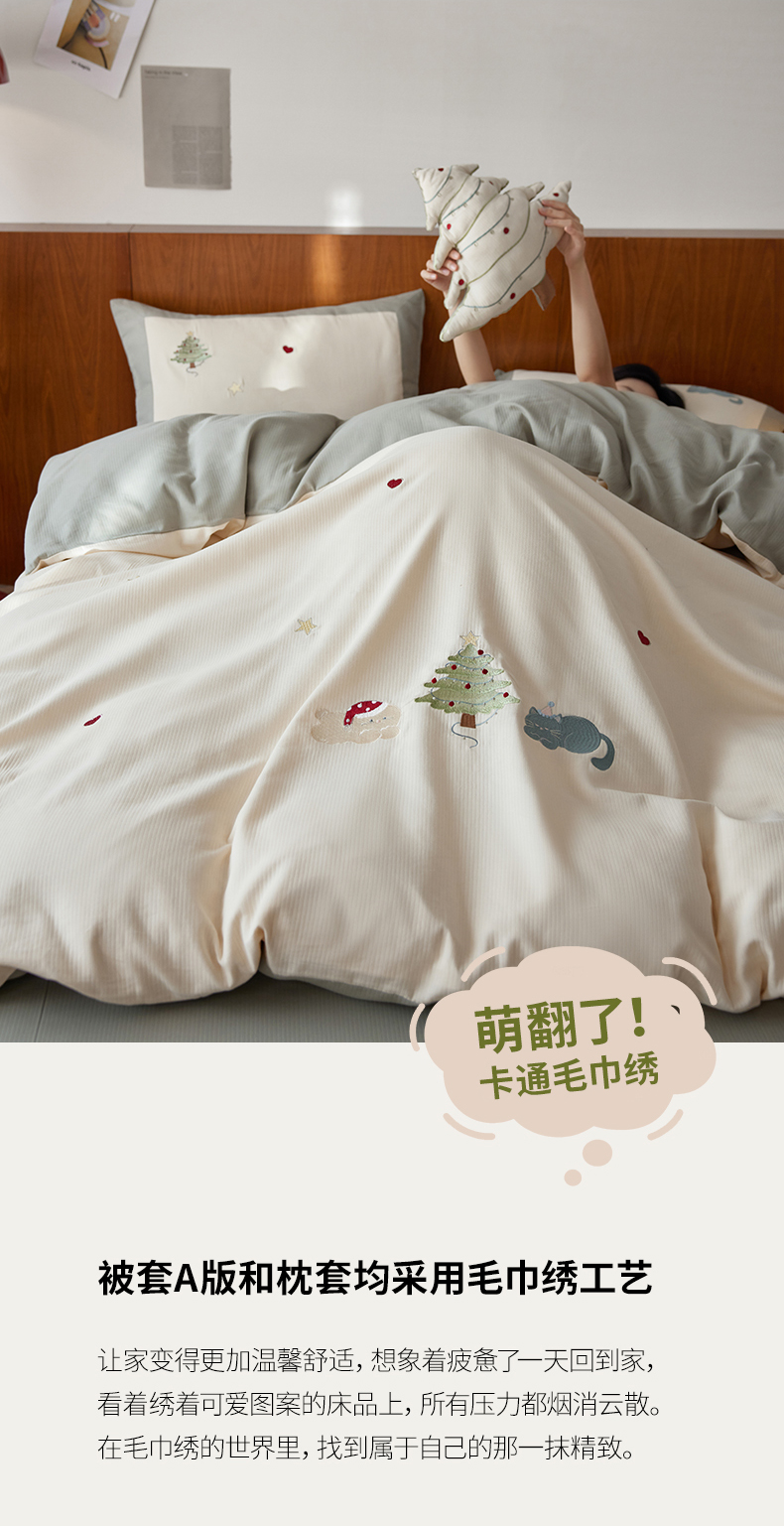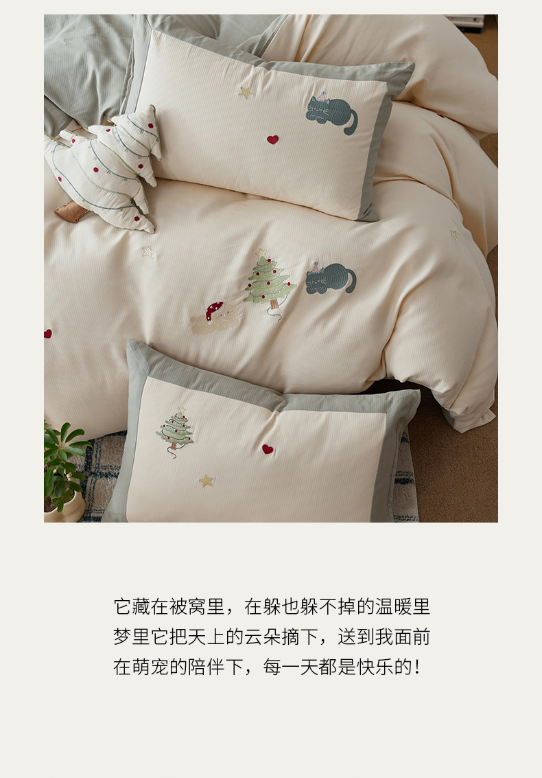 当前位置: 91家纺网 > 商品网购 > 床品套件 > 四件套 > 普通磨毛四件套 > 风向标家纺 2025新款透气软织提花磨毛卡通毛巾绣四件套-风格一 猫咪圣诞树