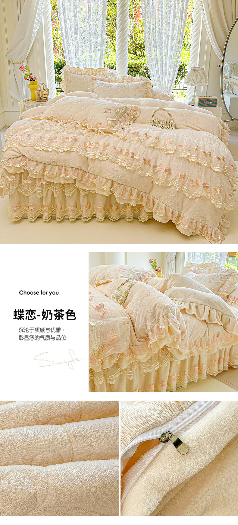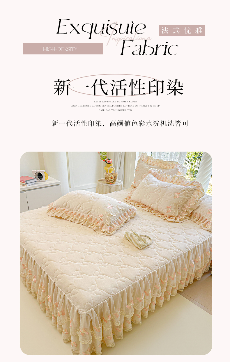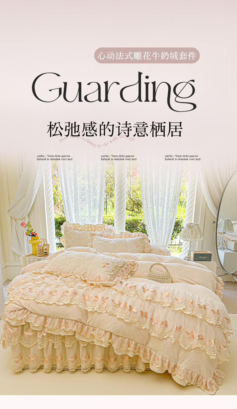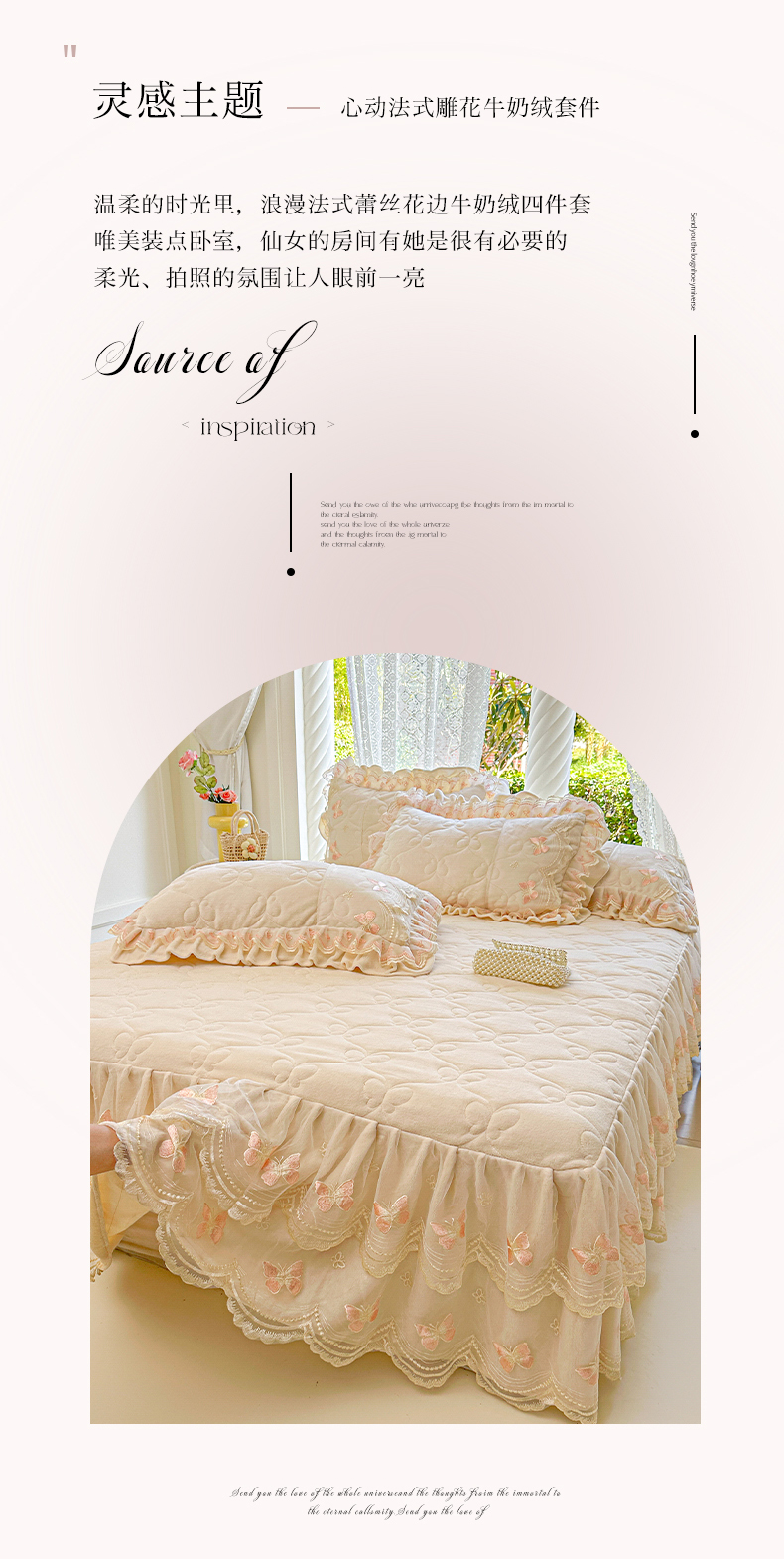 当前位置: 91家纺网 > 商品网购 > 床品套件 > 四件套 > 牛奶绒四件套 > 虹星家纺 2025新款花边牛奶绒床裙四件套系列 蝶恋-粉玉