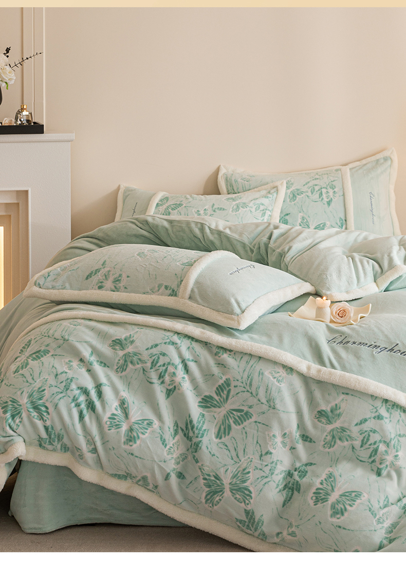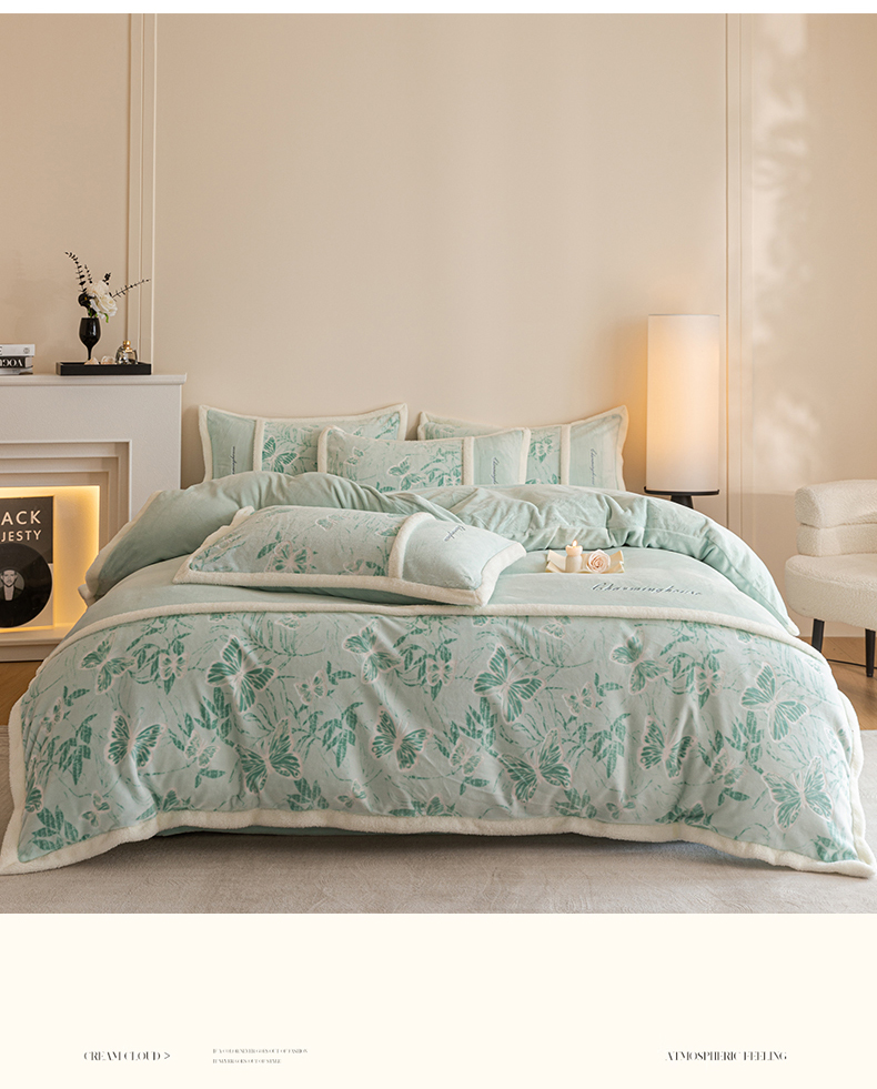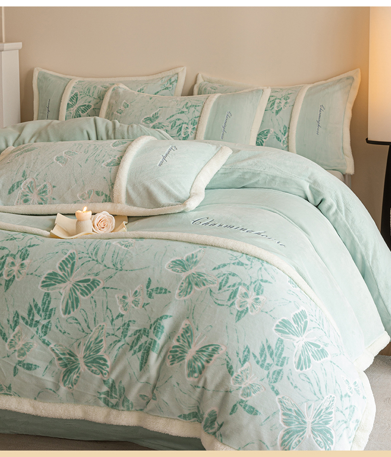 遇见家居生活馆 2025新款高克重雕花绒拼接刺绣四件套系列-艾菲妮 蝴蝶-清澈蓝