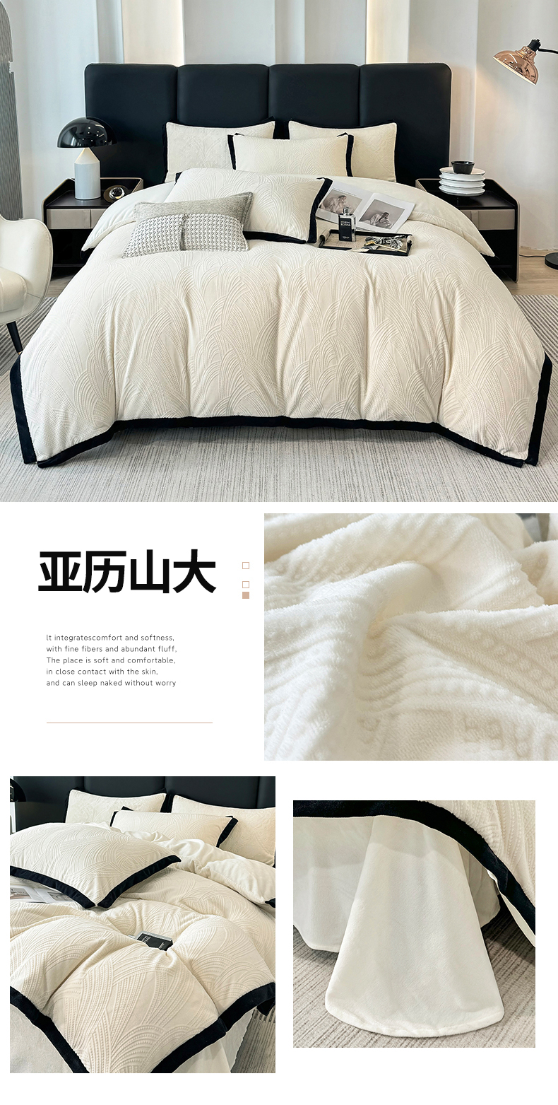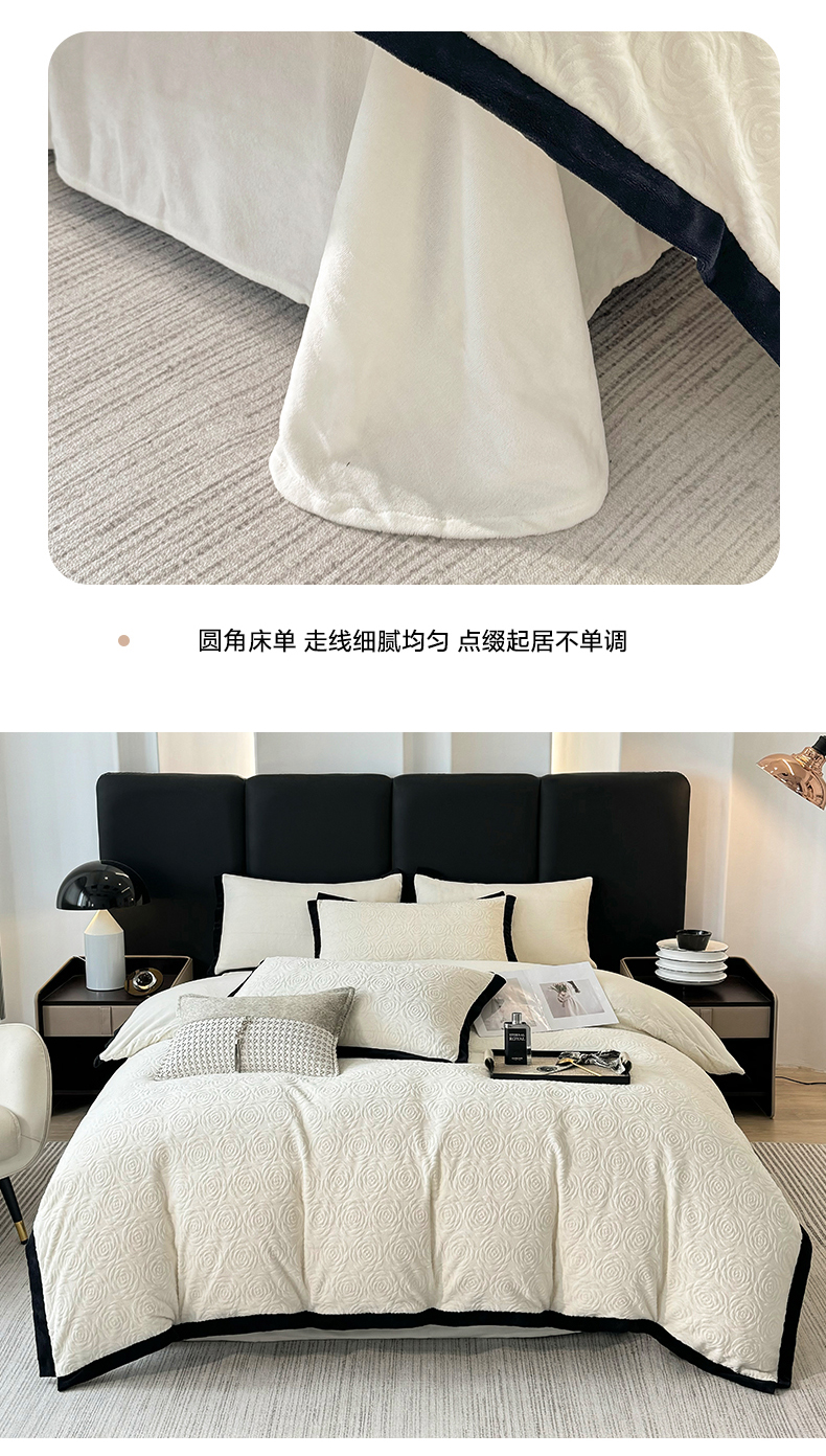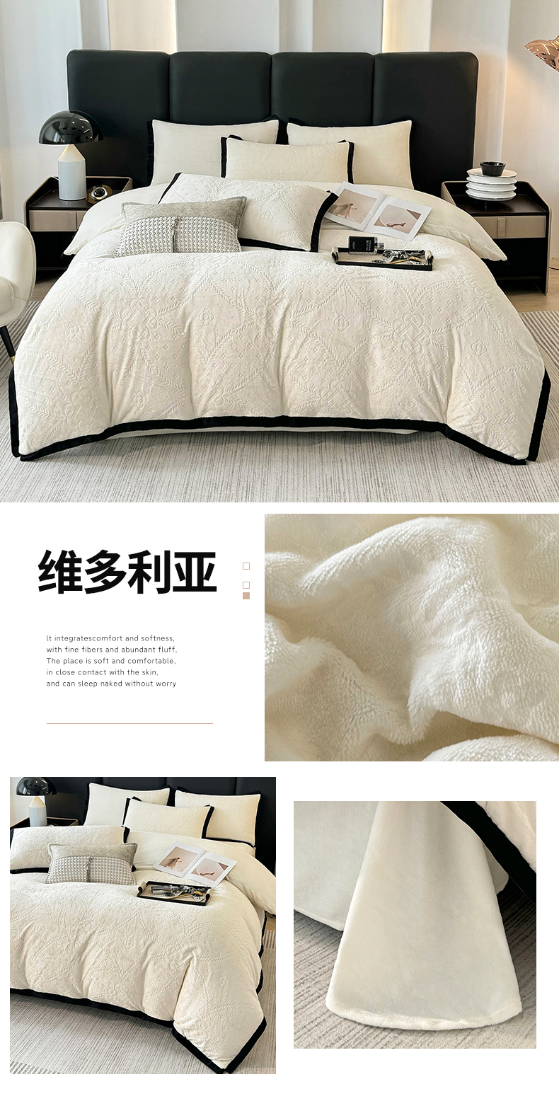 商品名称:好阁家纺 2025新款极简小香风雕花牛奶绒黑边四件套-风格二 亚历山大