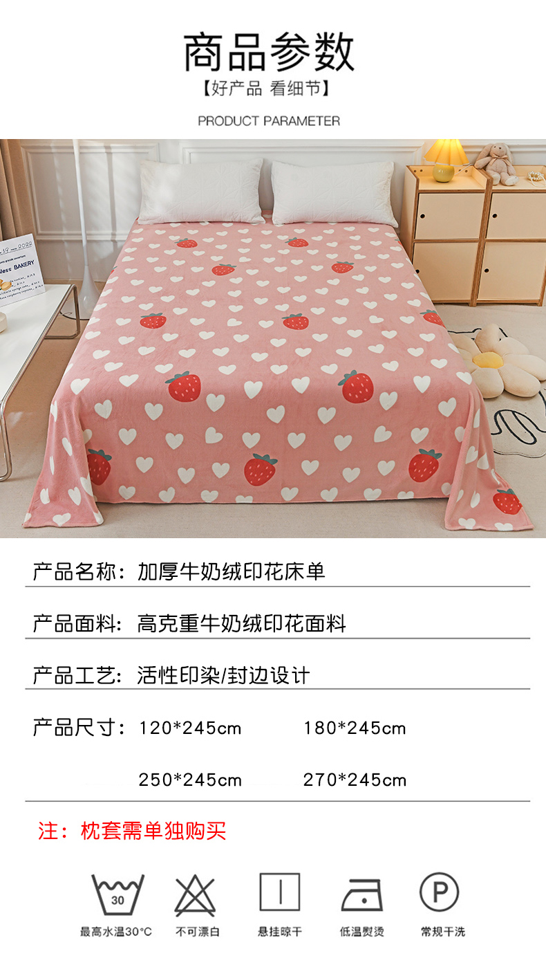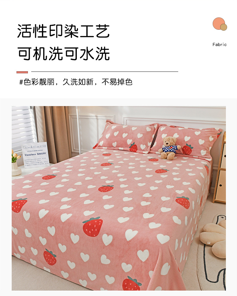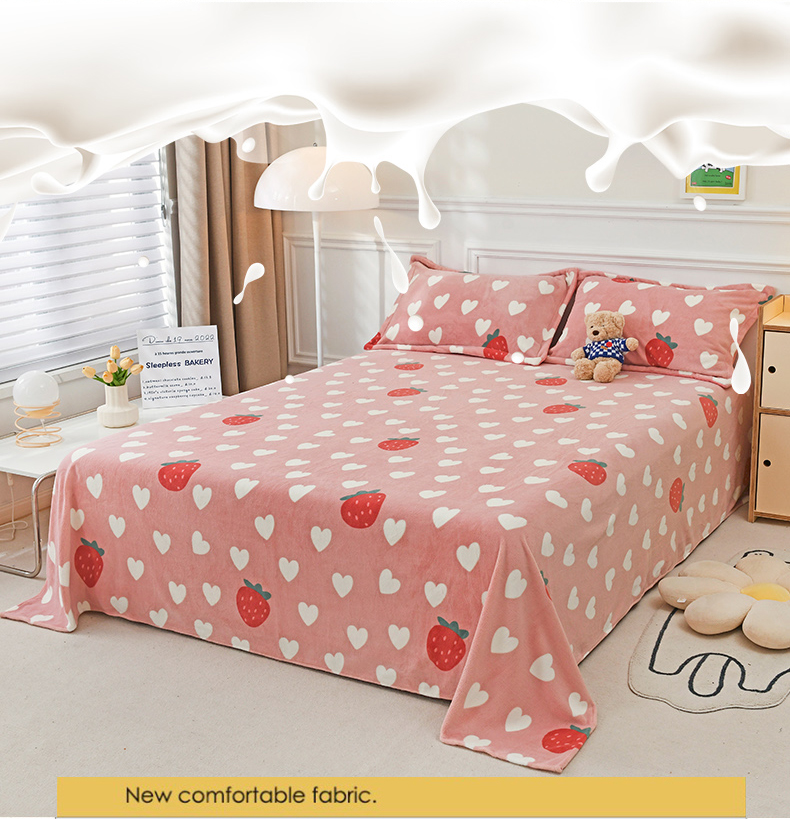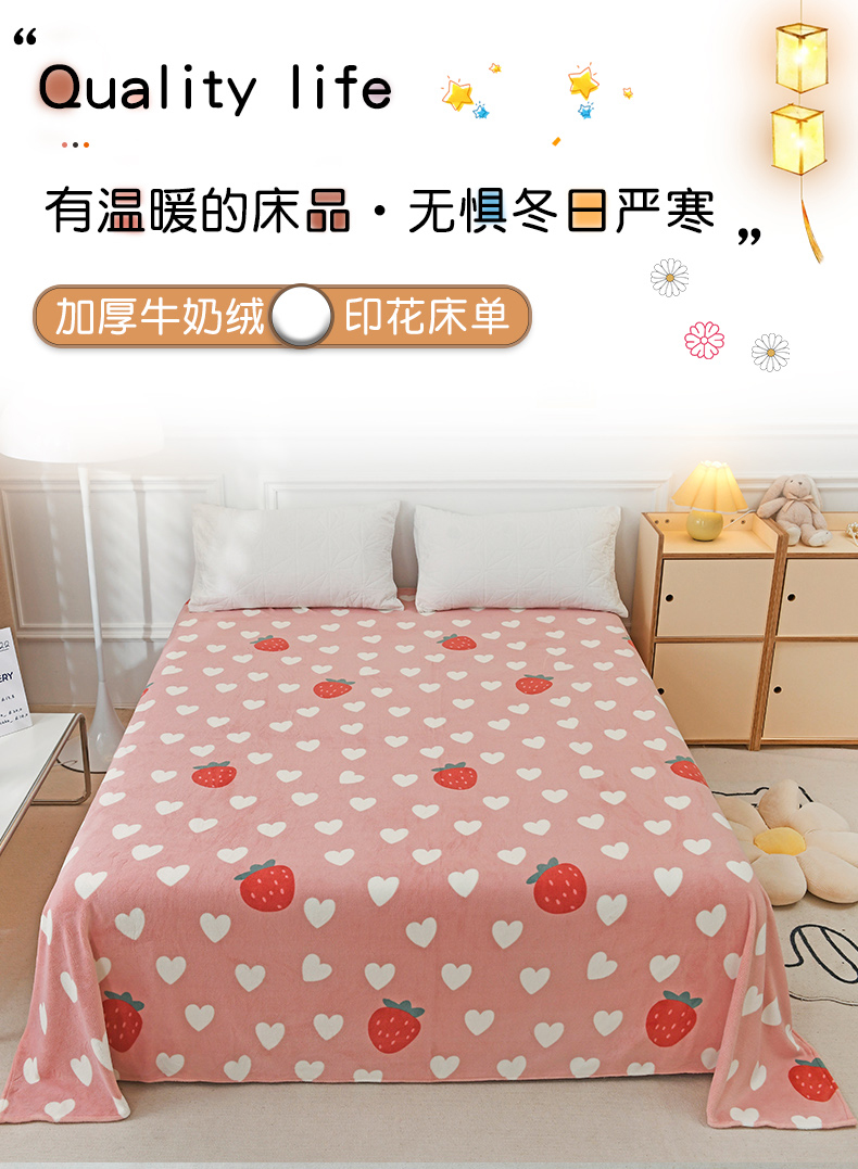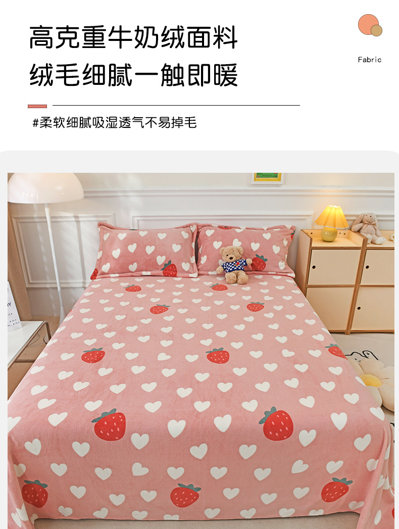 商品名称:金盛纺 2025新款高克重牛奶绒印花系列单床单(可定制) 桃心草莓