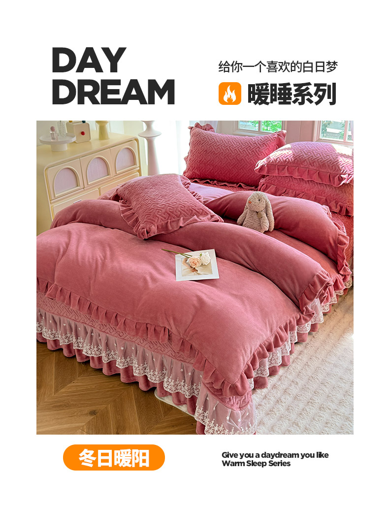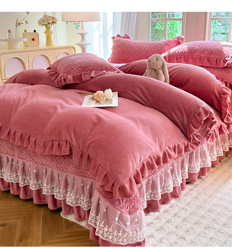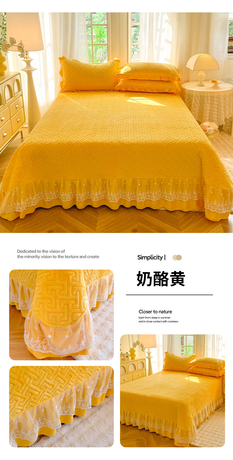 商品名称:优家居 2025秋冬高克重牛奶绒床盖夹棉床裙纯色蕾丝边花边刺绣法式公主风床罩夹棉床盖 浅豆沙