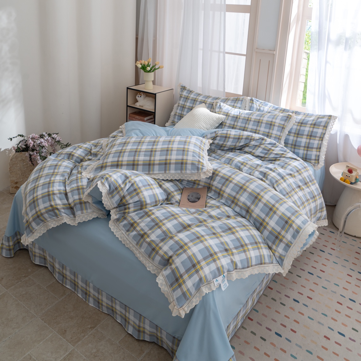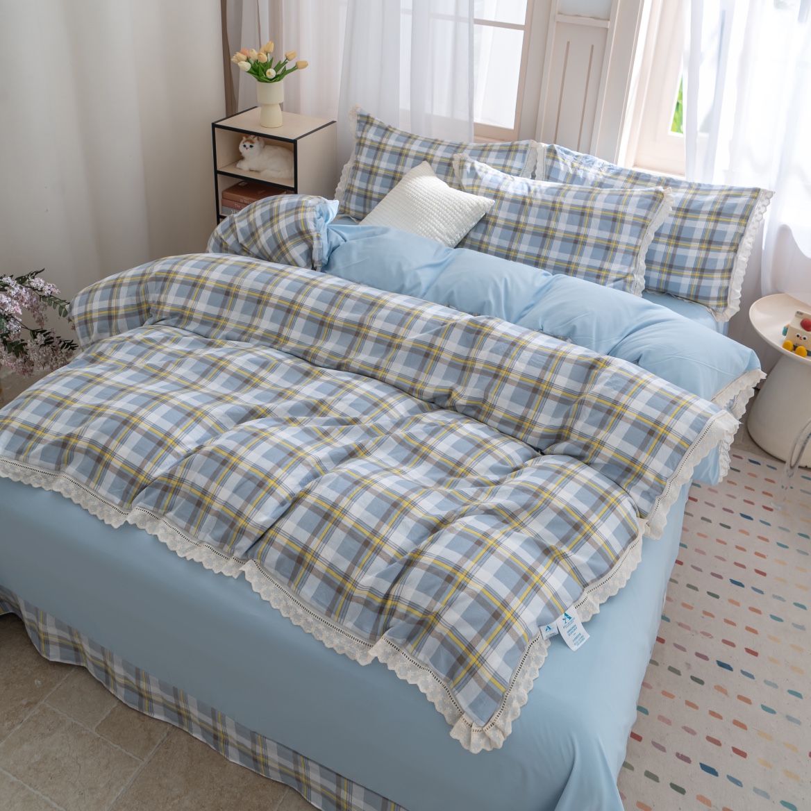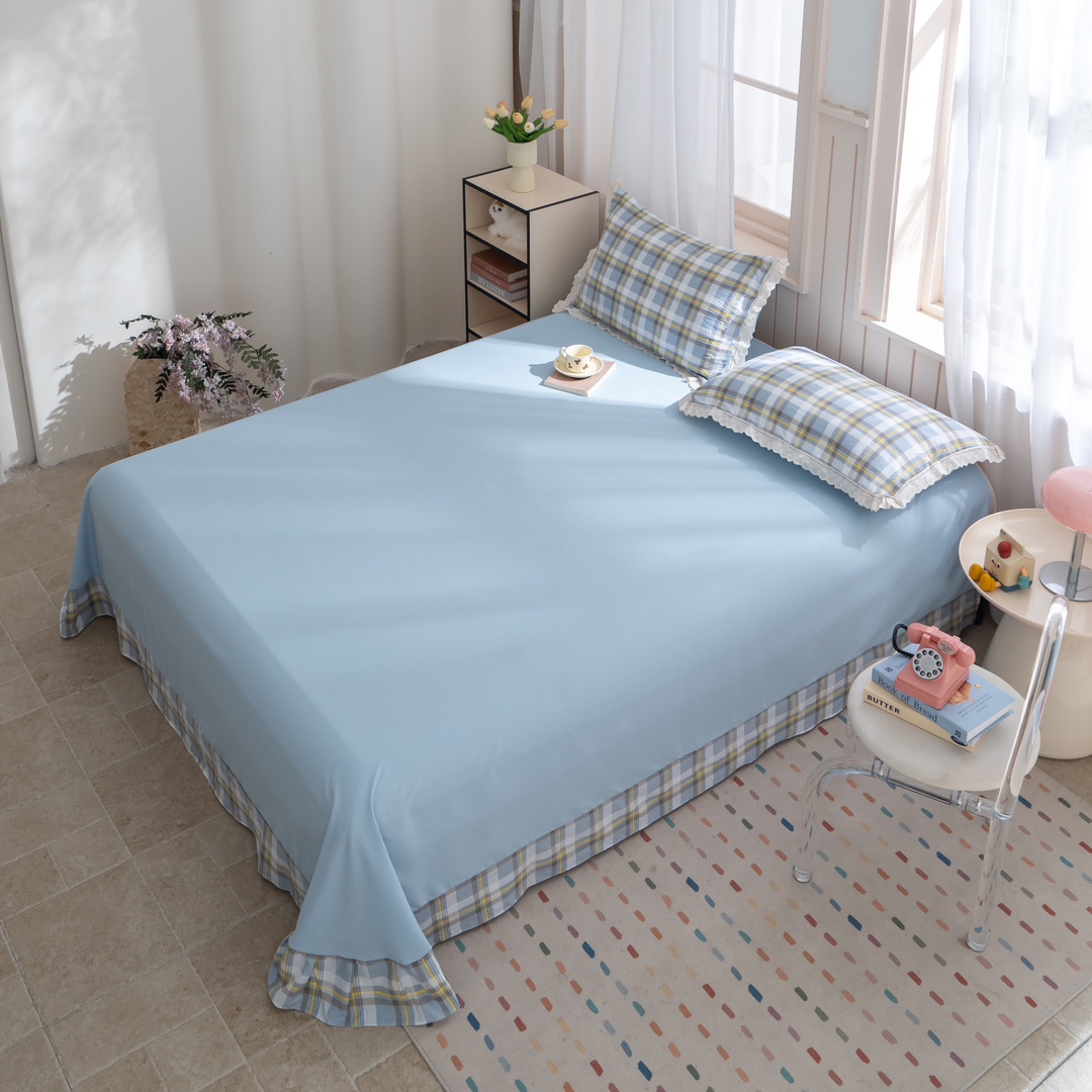 商品名称:玖琳家纺 2025新款云朵水洗棉皱皱纱精致花边款四件套 晨曦 蓝