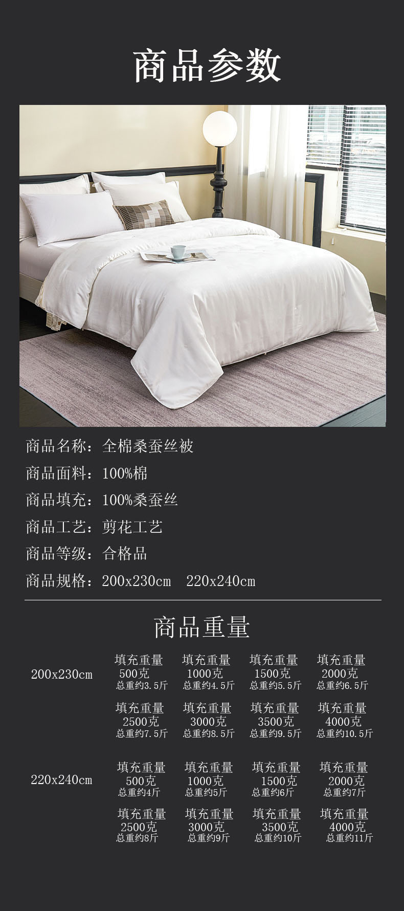 夏被2.2x2.4桑蚕丝填充1斤/总重4斤