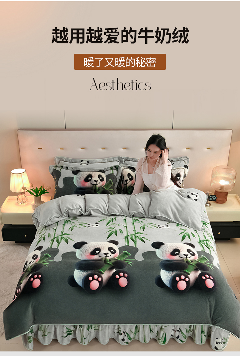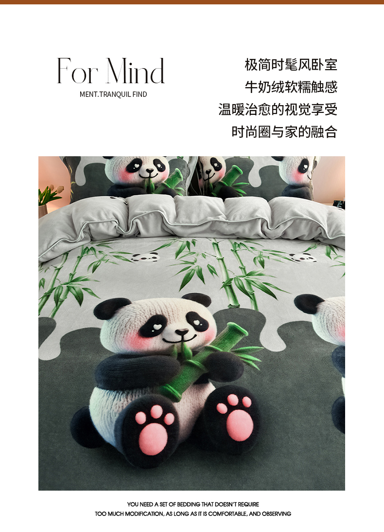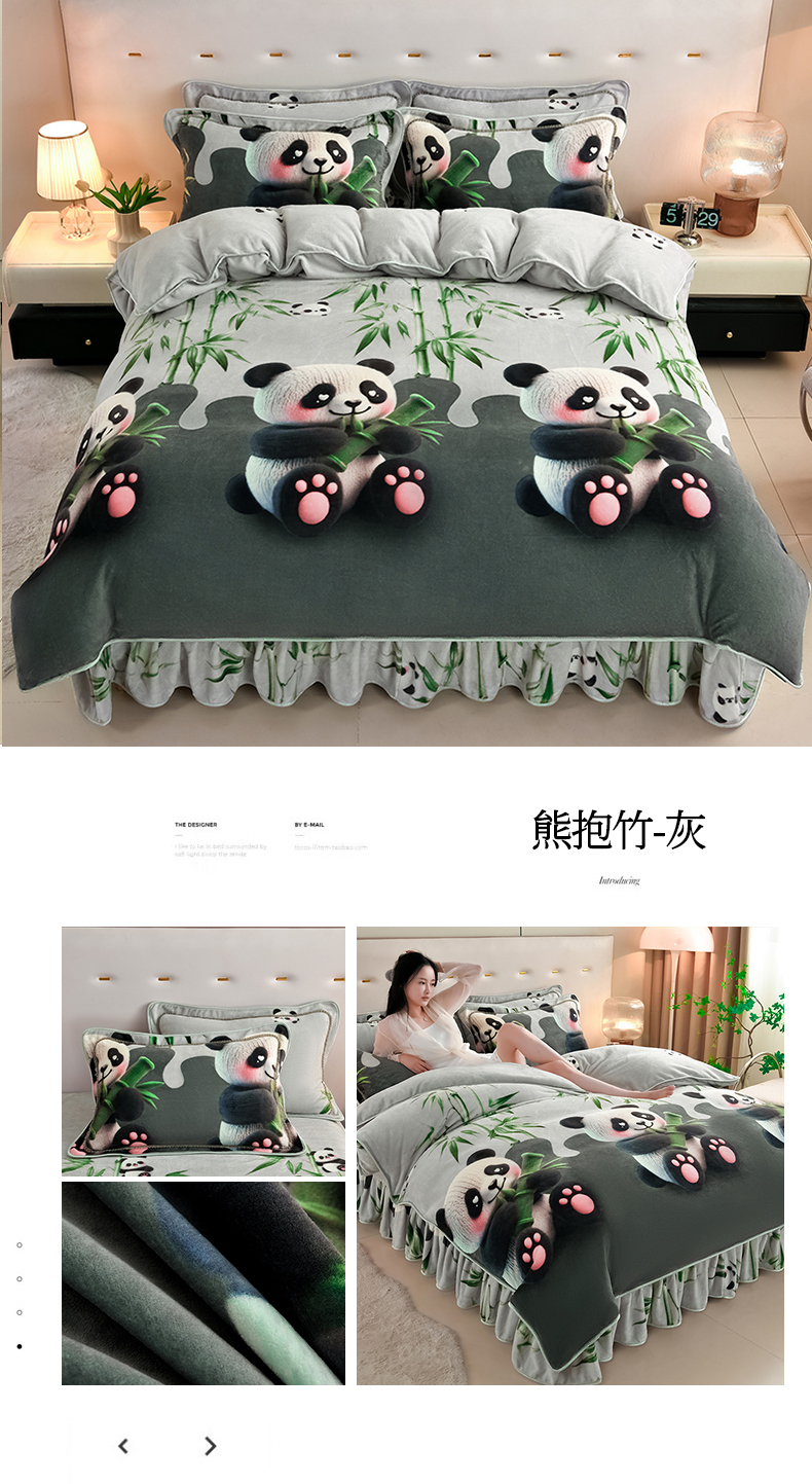 商品名称:雅芝蓝 2025新款8-9斤高克重印花牛奶绒四件套保暖绒套件直播爆款 熊抱竹-灰
