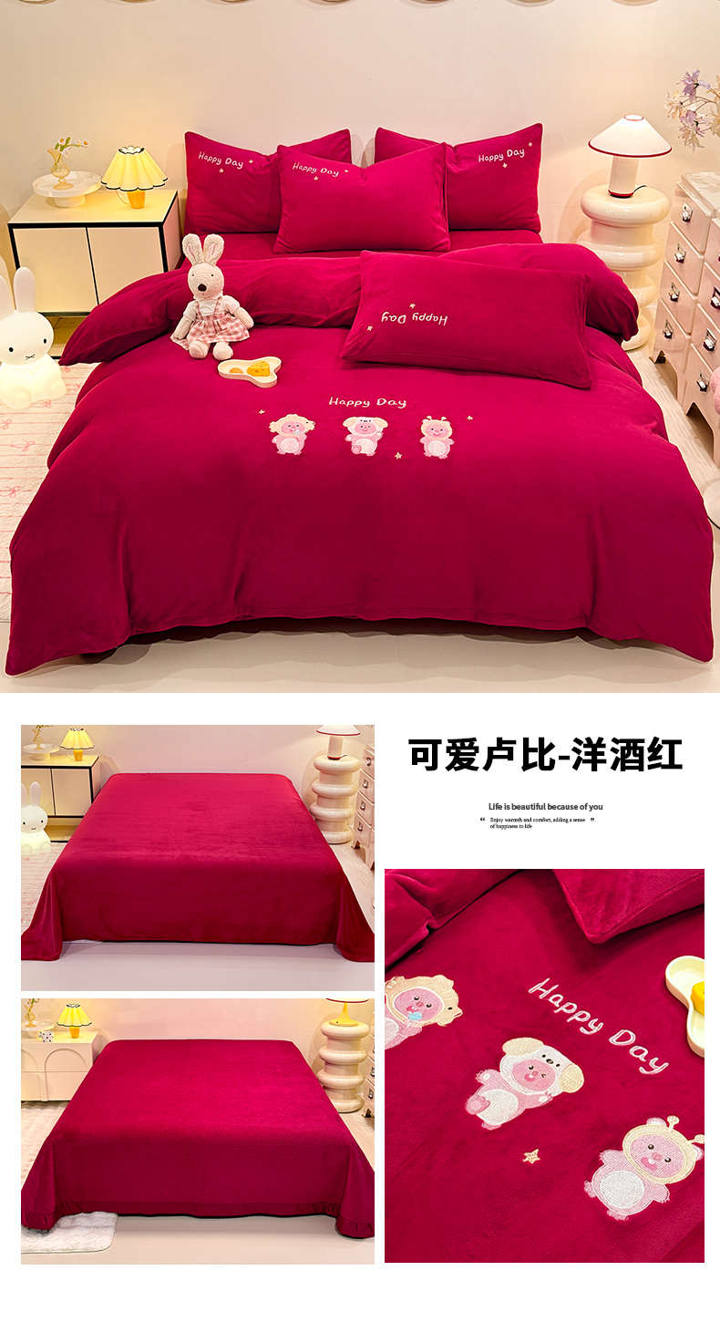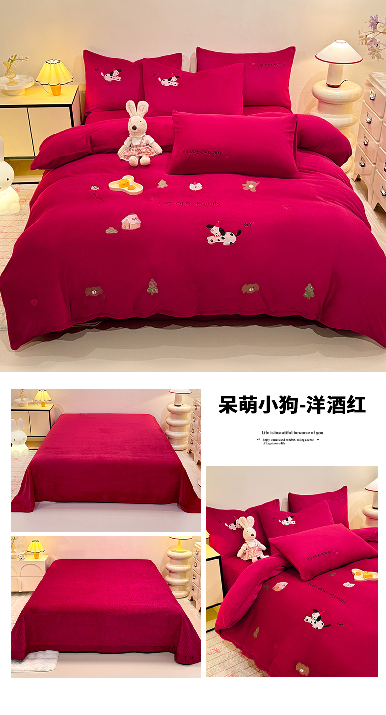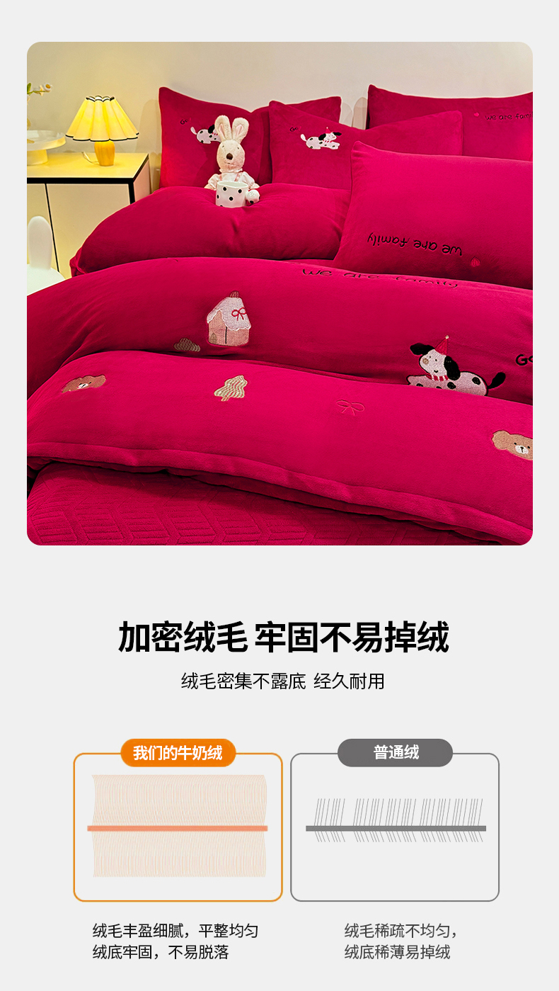 商品名称:(总)控价 新方向 2025年新款 全消光A类刺绣牛奶绒四件套-卡通红色系列