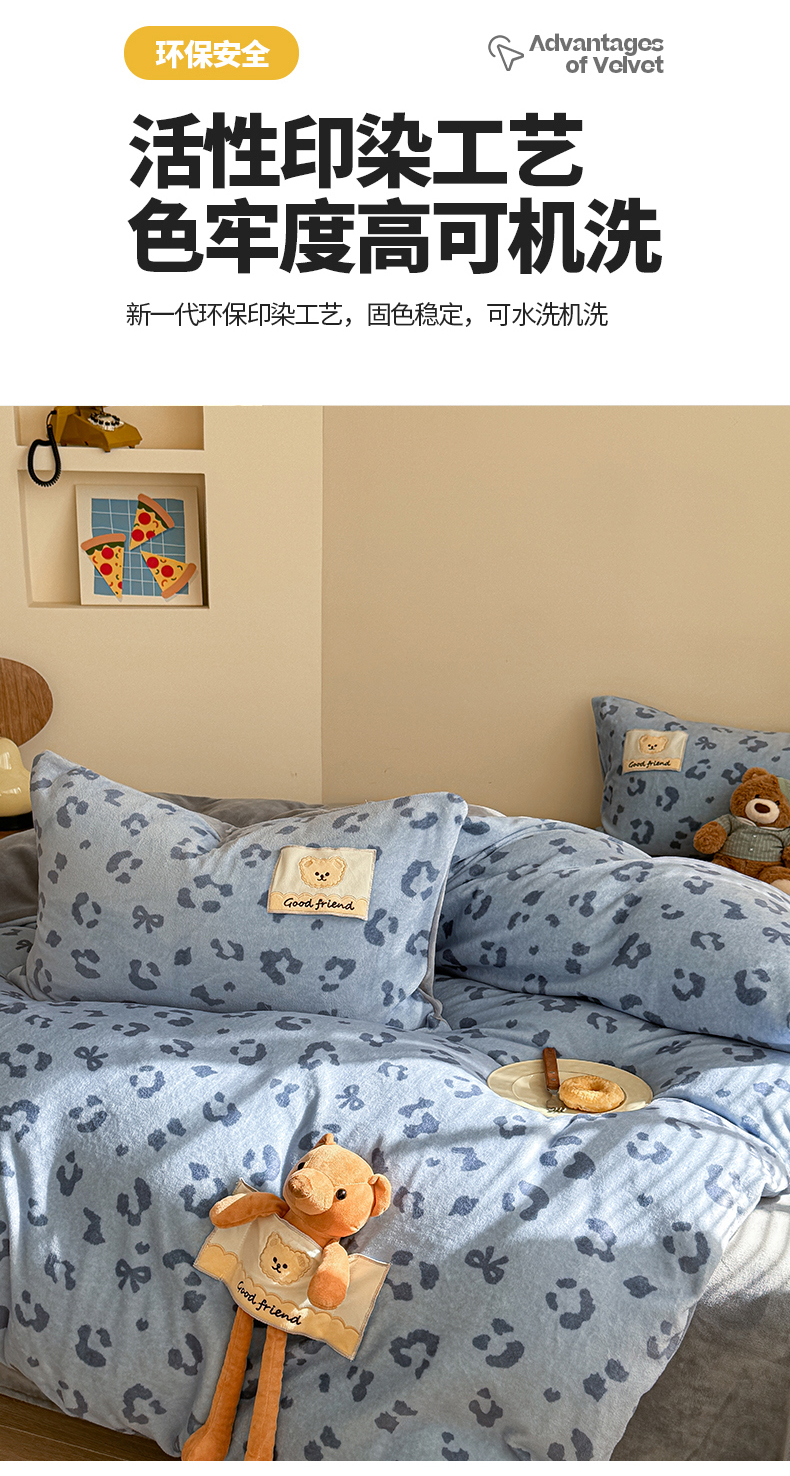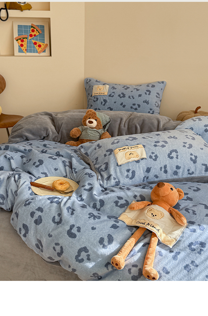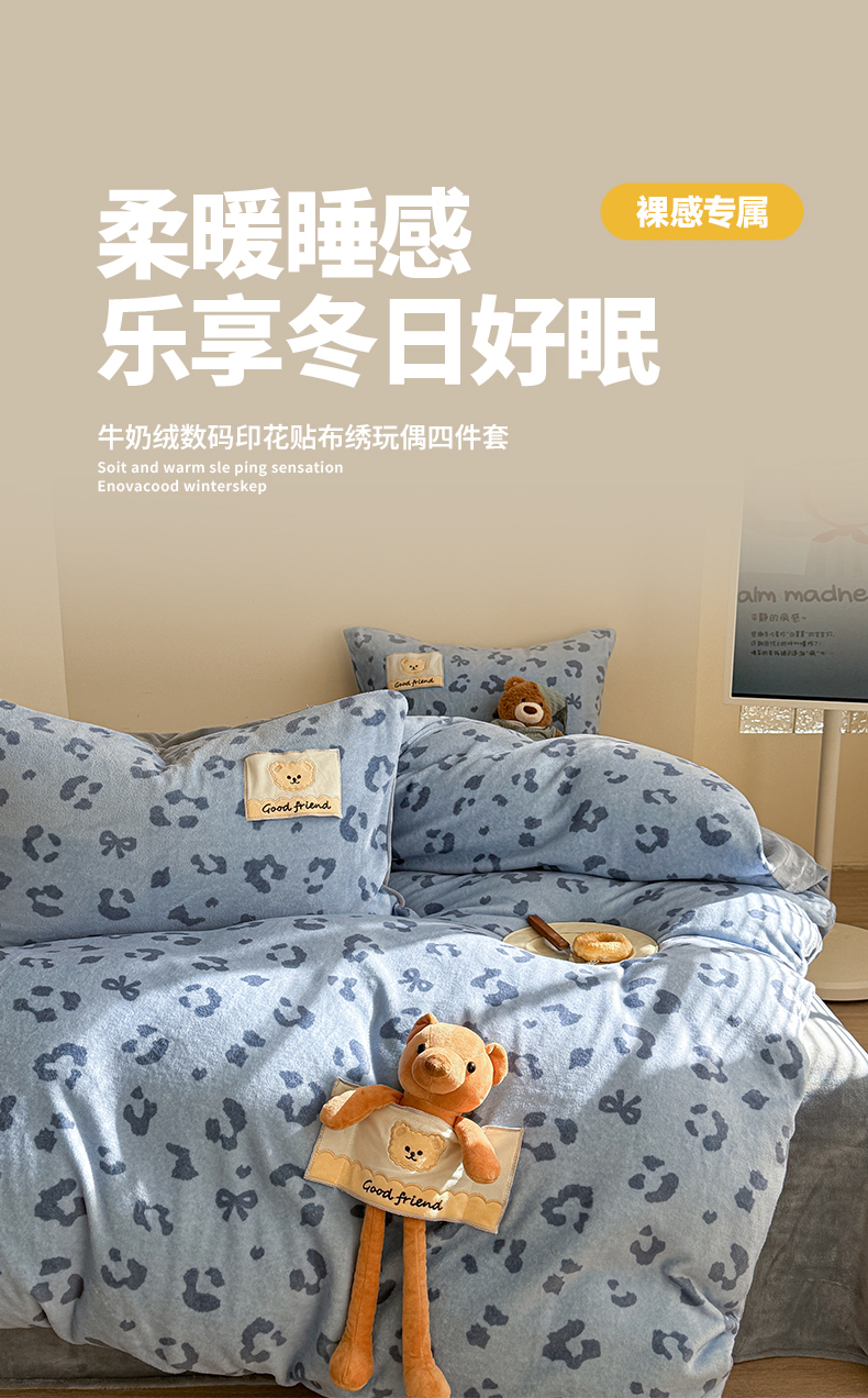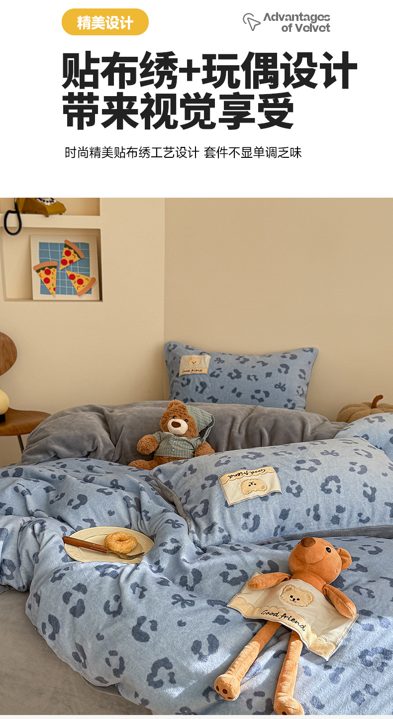 当前位置: 91家纺网 > 商品网购 > 床品套件 > 四件套 > 牛奶绒四件套 > 蜜柚 2025新款高克重牛奶绒数码印花贴布绣玩偶设计四件套 豹纹熊 蓝灰