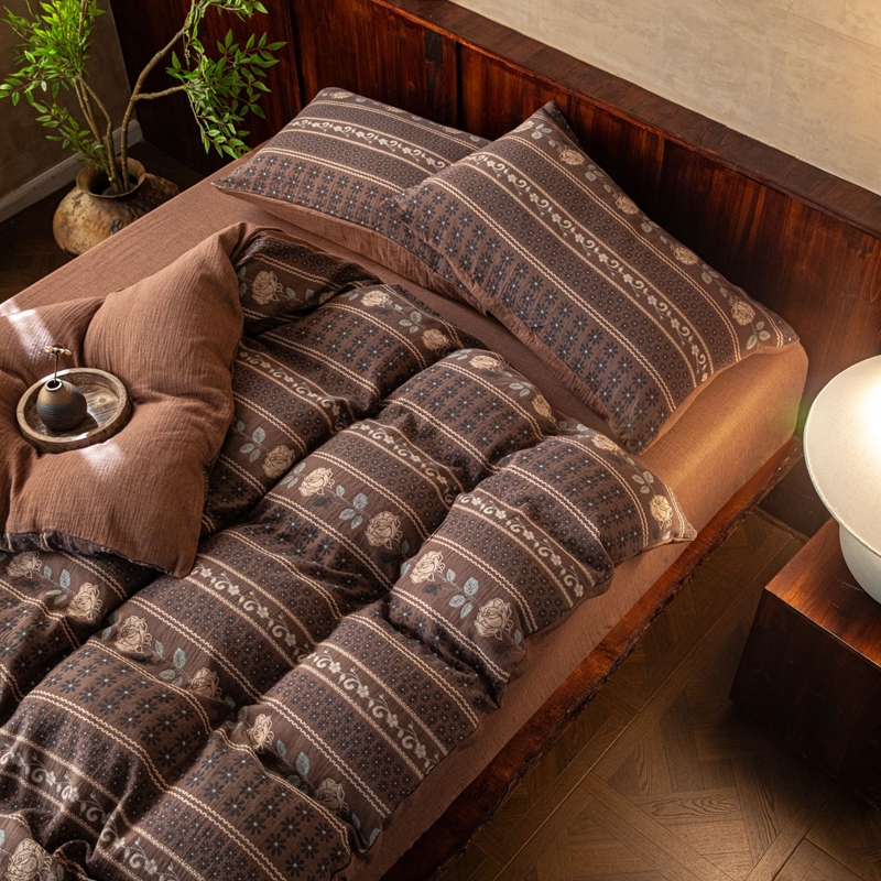 (总)仰望棉麻双层纱供应链 2025新款全棉色织提花双层纱四件套-花韵影纽扣款,花韵影