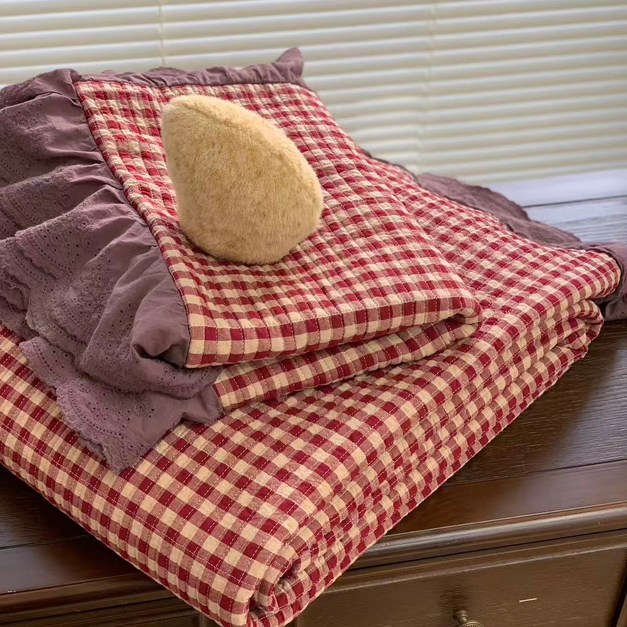 (总)床盖工厂店 2025新款双面全棉纯棉填充棉花花边款床盖三件套芸素,组合图仅供参考,芸素-红,芸素-咖,芸素-黄