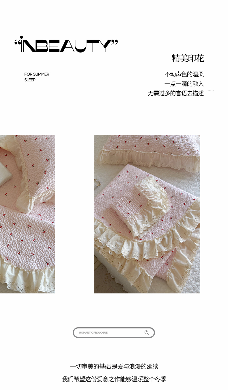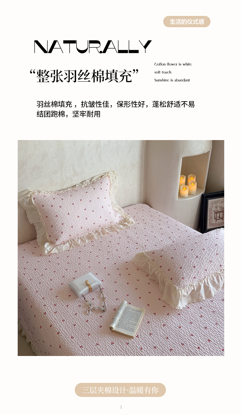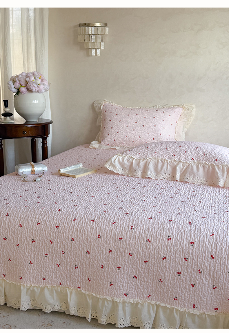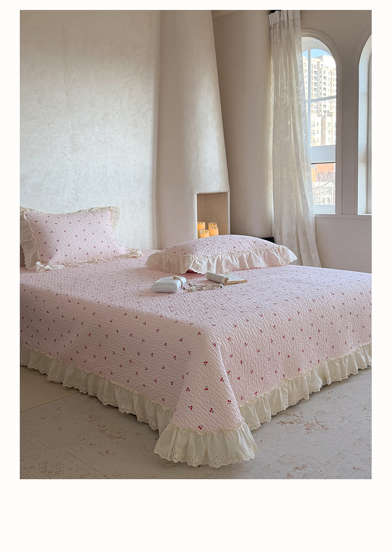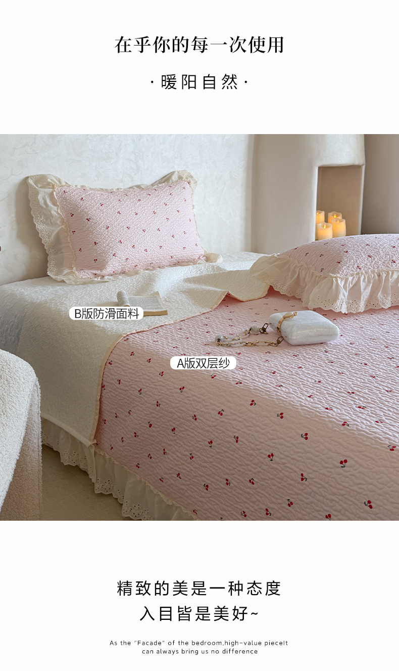 商品名称:琳可家居 2026新款印花全棉双层纱床盖棉布花边高温水洗A类标准夹棉可机洗 樱桃