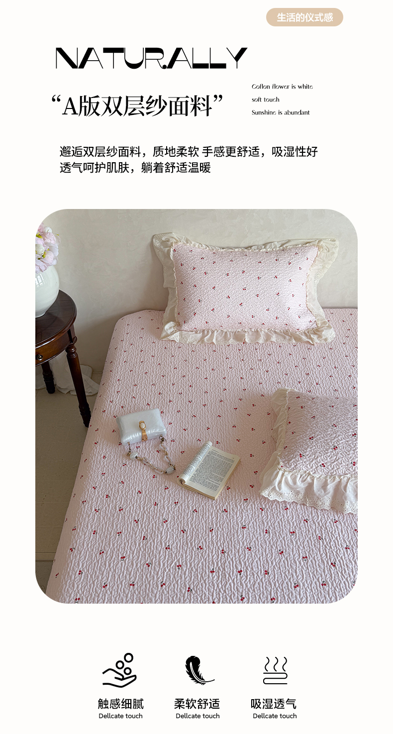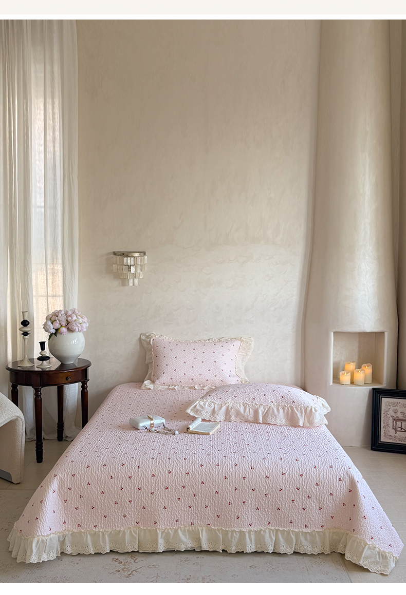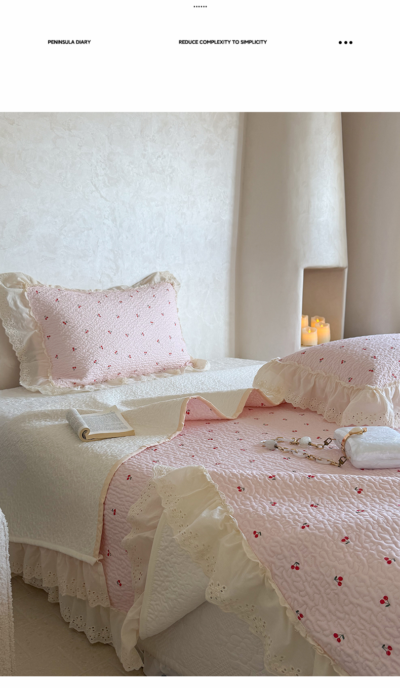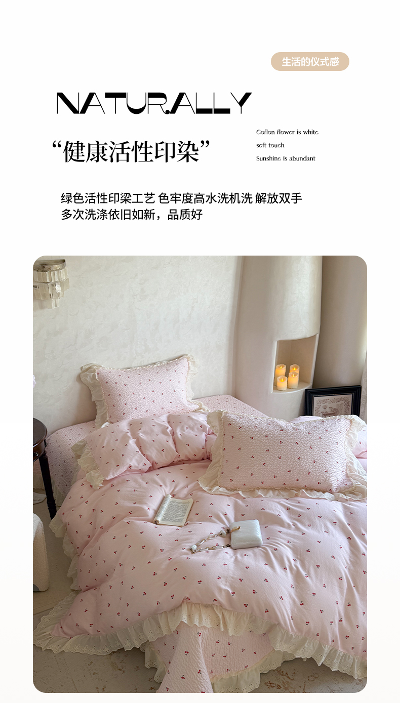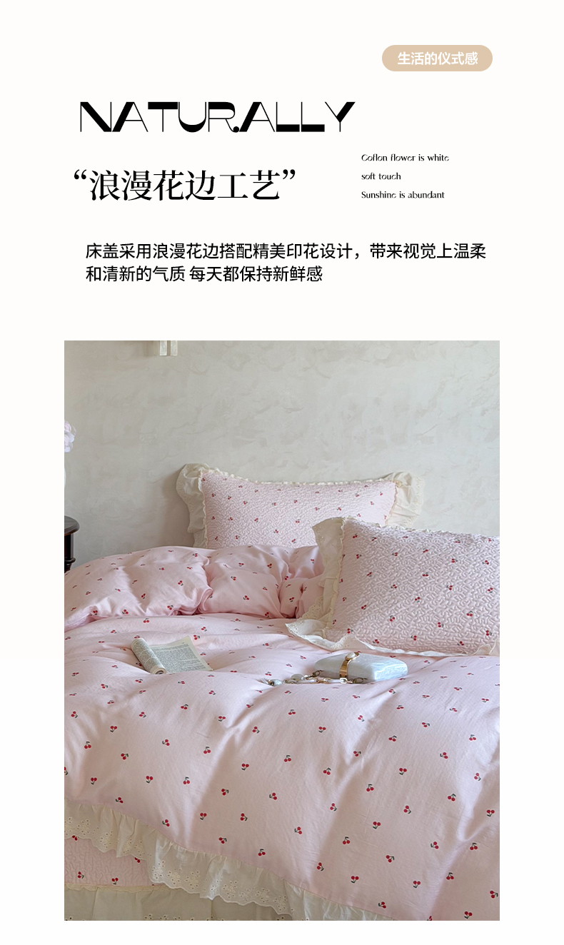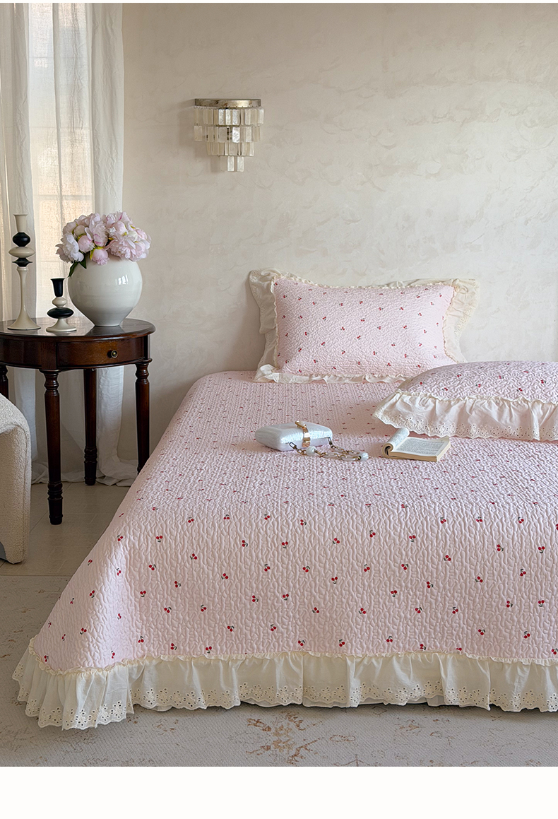 商品名称:琳可家居 2026新款印花全棉双层纱床盖棉布花边高温水洗A类标准夹棉可机洗 樱桃