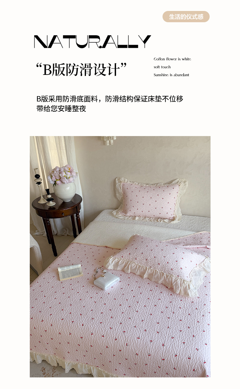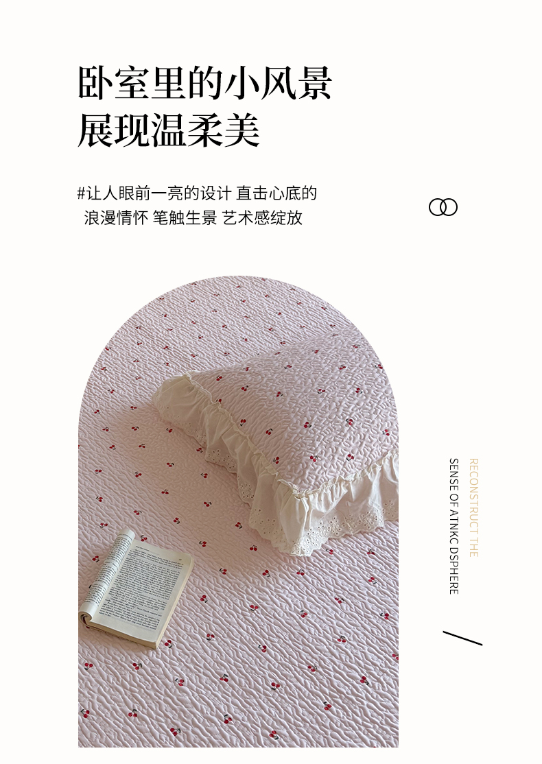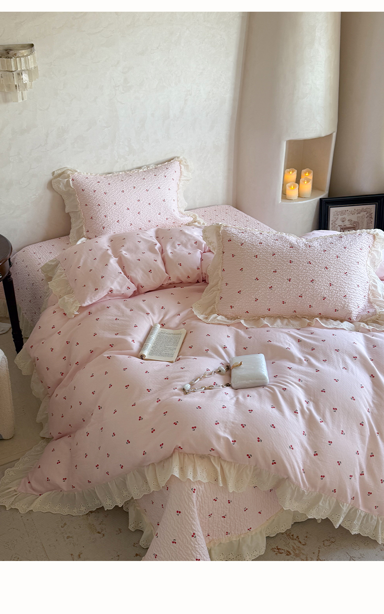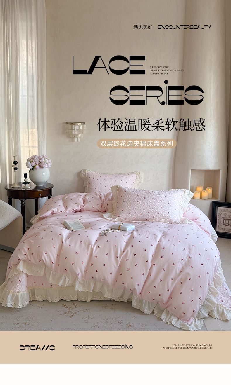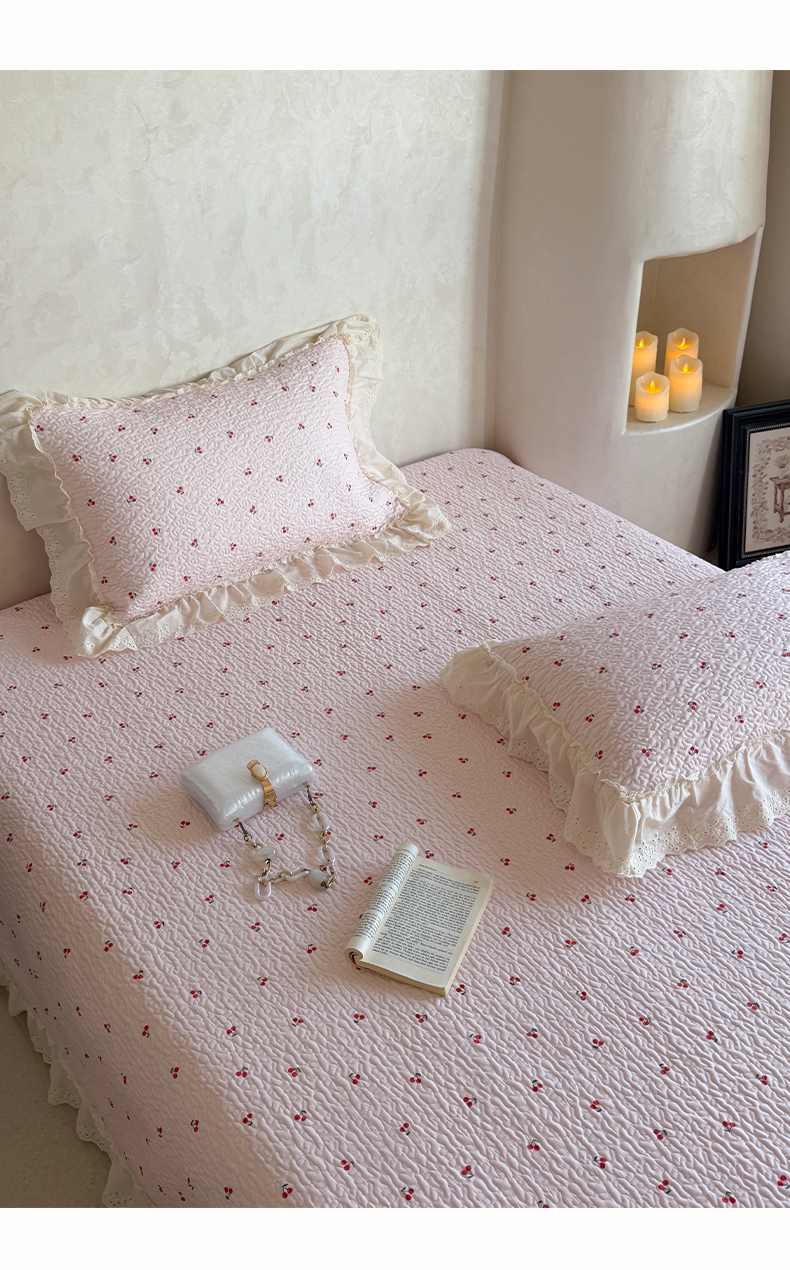 商品名称:琳可家居 2026新款印花全棉双层纱床盖棉布花边高温水洗A类标准夹棉可机洗 樱桃