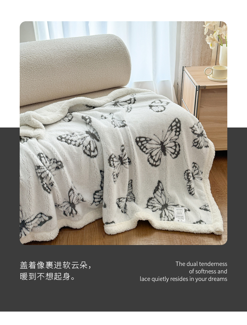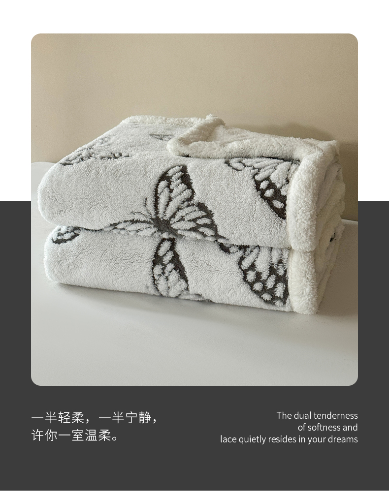 商品名称:丹本家纺 2026新款双层阳离子提花蝴蝶色织多功能盖毯塔芙绒羊羔绒毛毯毯 双层蝴蝶灰