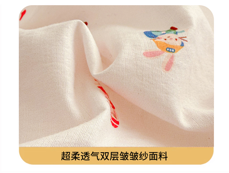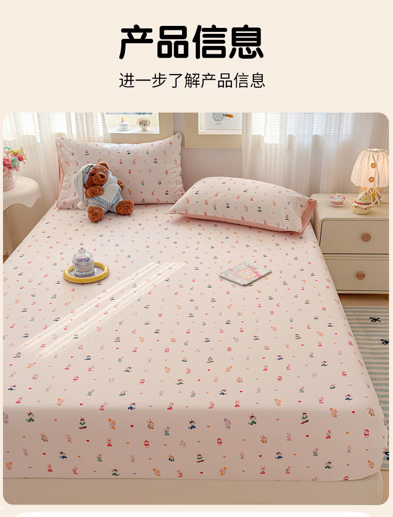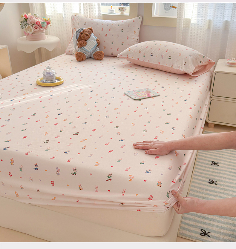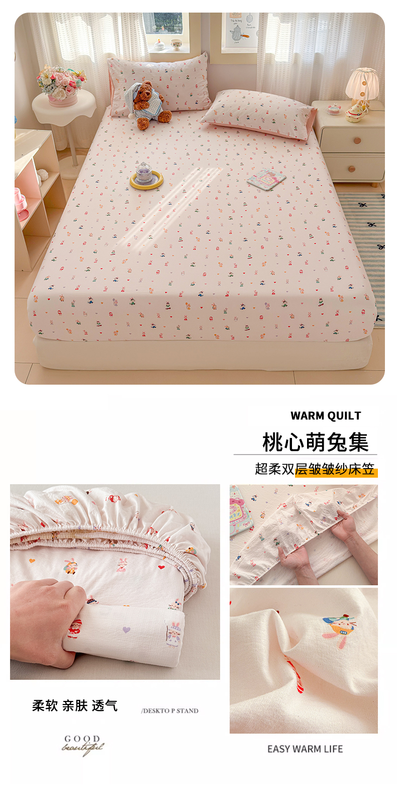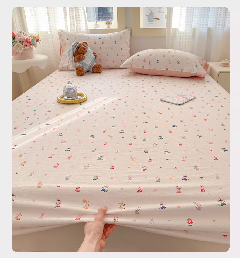 • 91家纺网 家纺一手货源 找家纺 丽美人家纺 2026新款A类柔软双层皱皱纱印花单床笠床笠单件 桃心萌兔集
