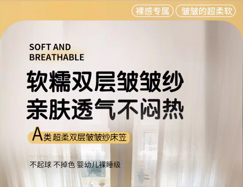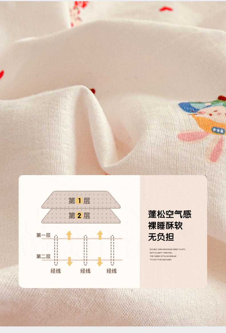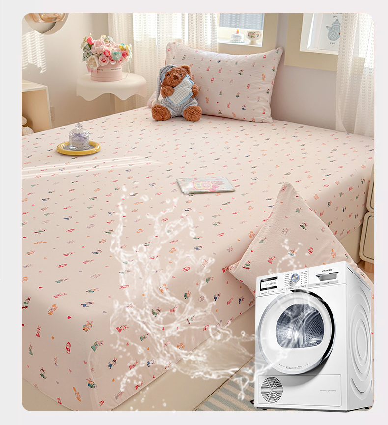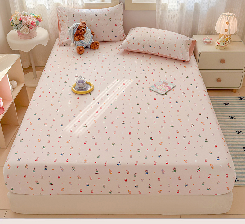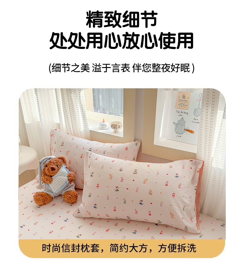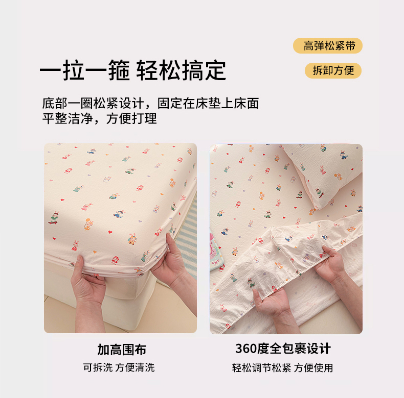 • 91家纺网 家纺一手货源 找家纺 丽美人家纺 2026新款A类柔软双层皱皱纱印花单床笠床笠单件 桃心萌兔集