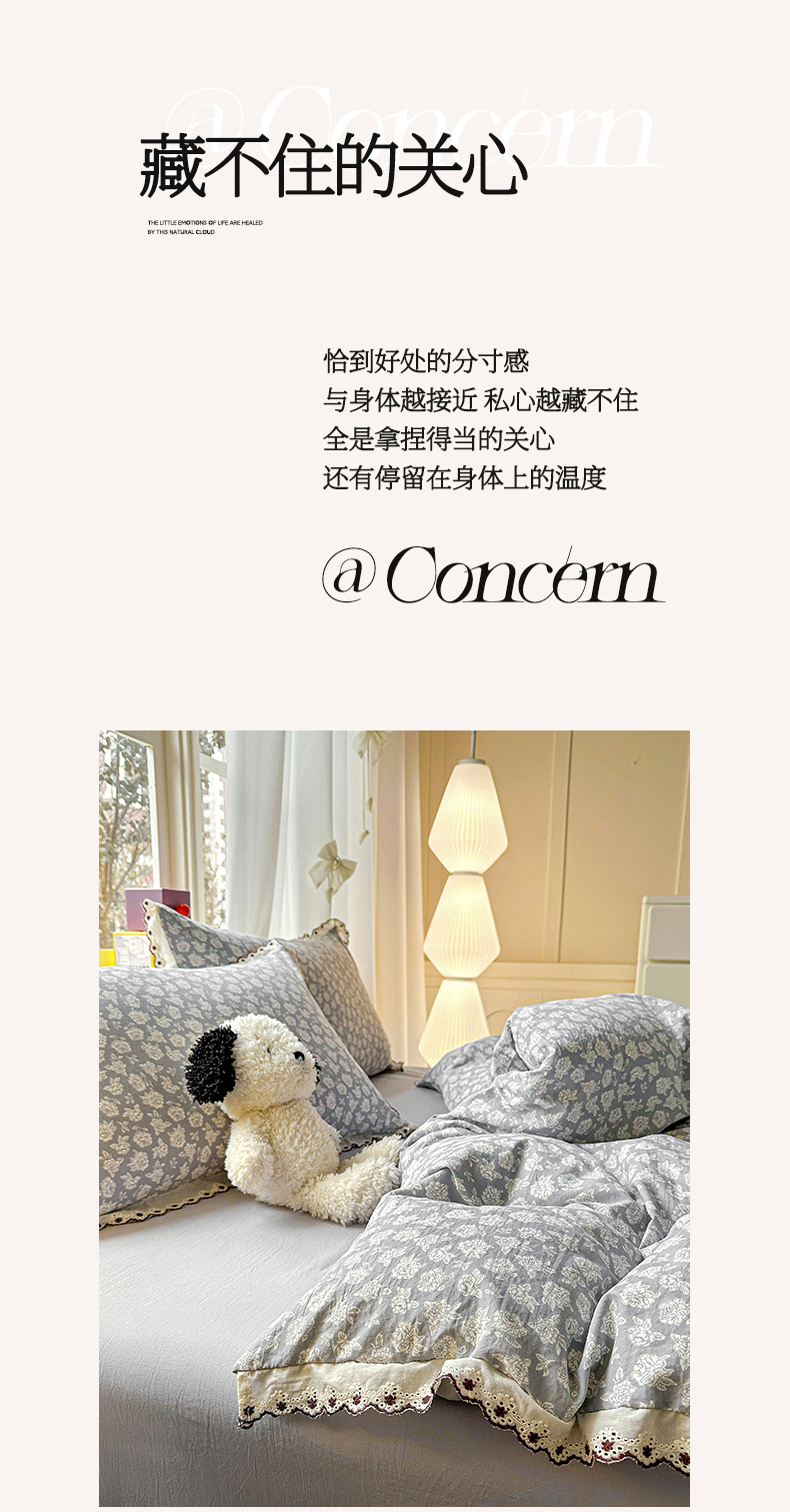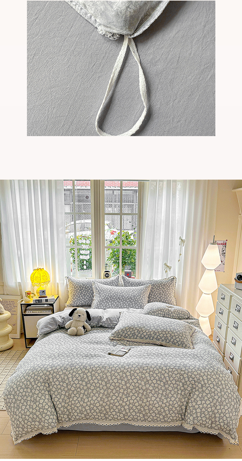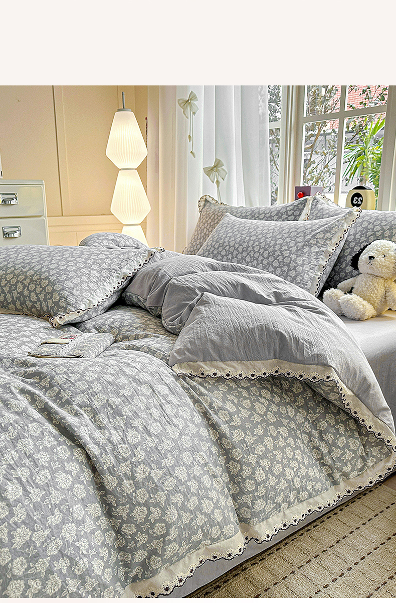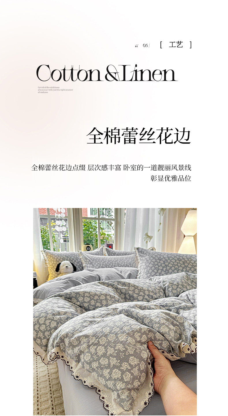 当前位置: 91家纺网 > 商品网购 > 床品套件 > 四件套 > 全棉普通四件套 > 韩秀家纺 2026新款A类纺棉四件套全棉花边古法水洗棉法式蕾丝花边四件套 怦然心动