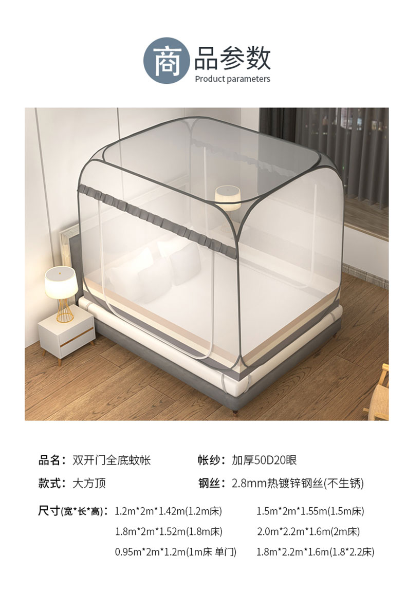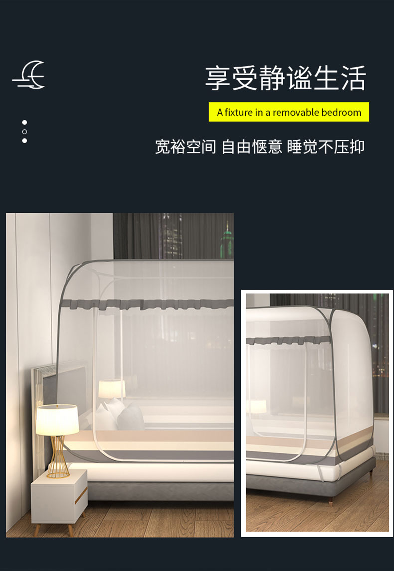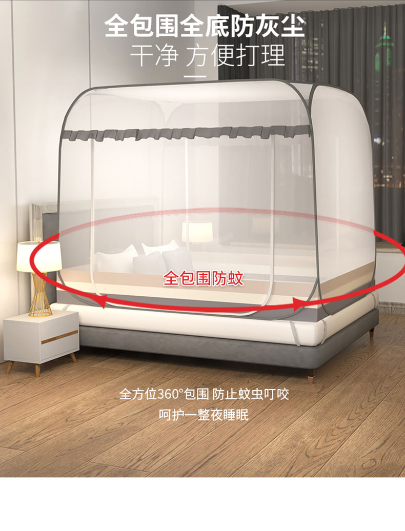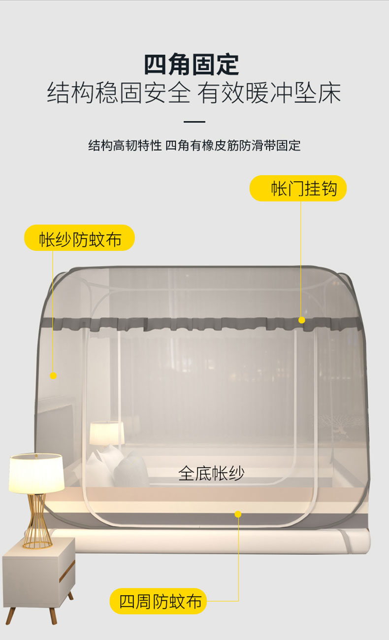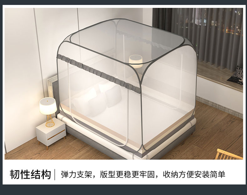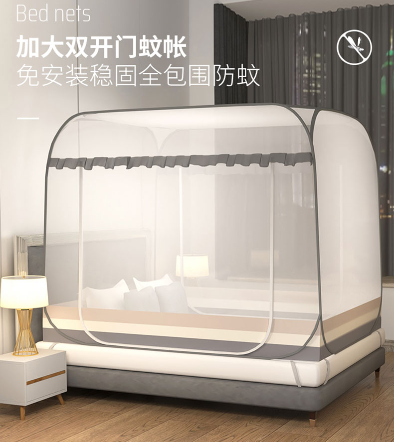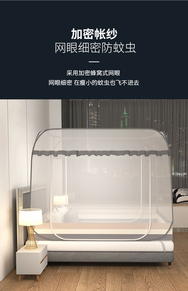 商品名称:青竹苑 2026新款免安装大顶花边款魔术蚊帐 条纹灰