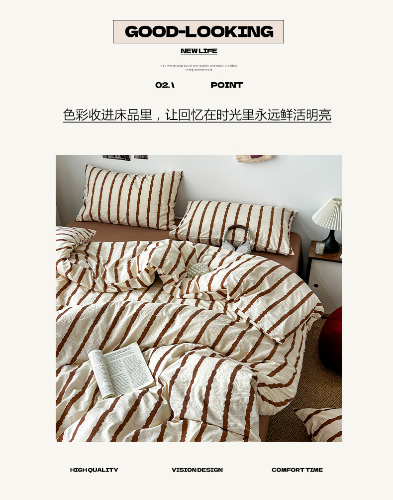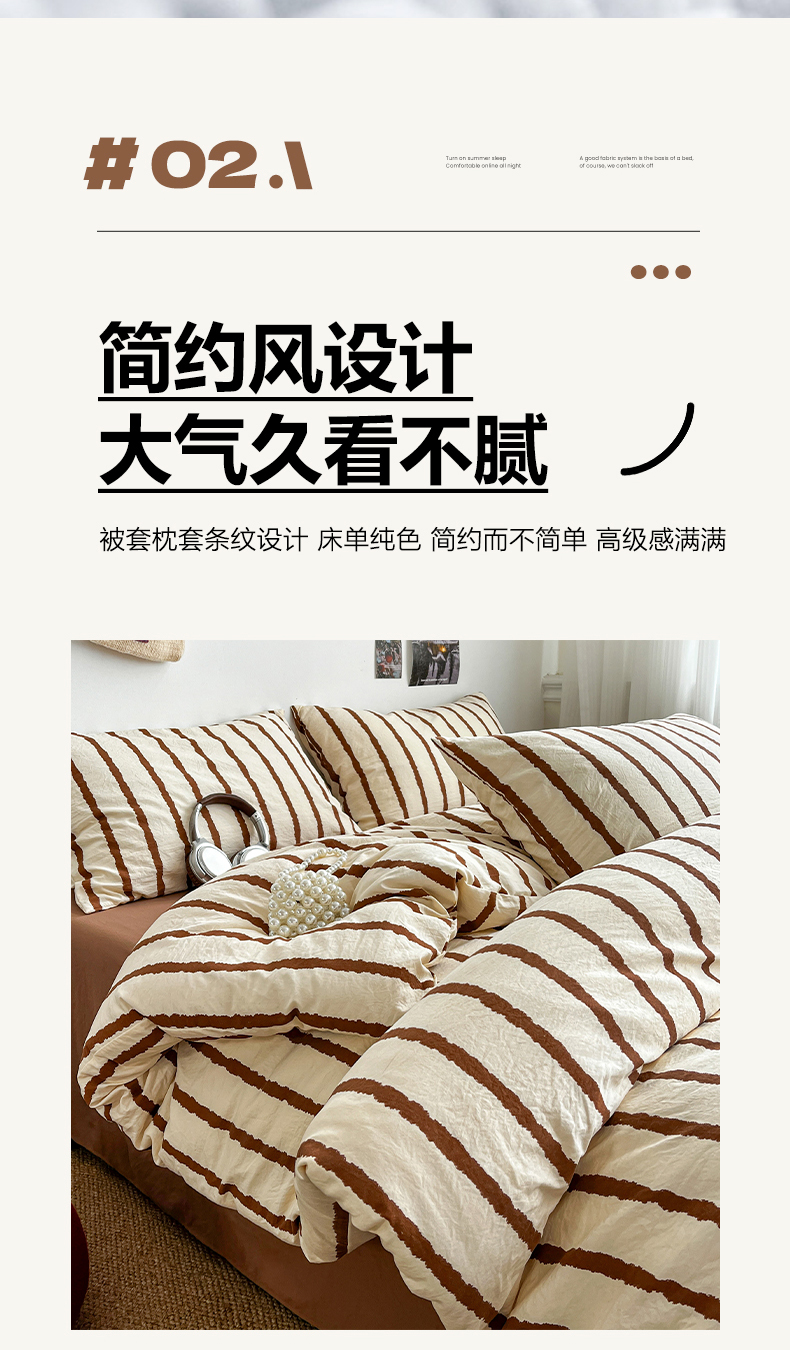 商品名称:逸林家纺《原希尔顿逸林》 2026新款简约印花古法水洗棉三件套拼色床单款学生三件套条纹被套单品三件套 墨染-咖