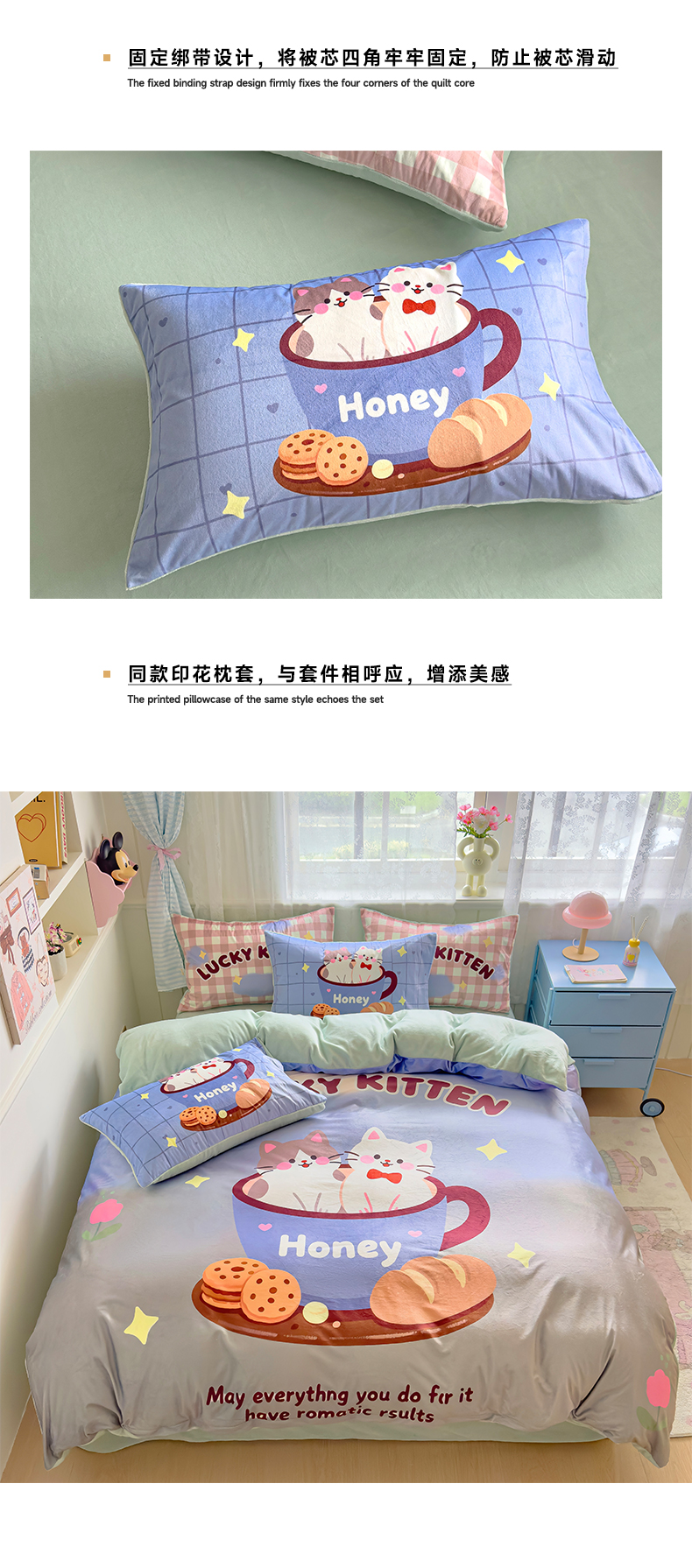 沐珩家纺 2026新款牛奶绒水晶绒卡通大版四件套 茶杯猫