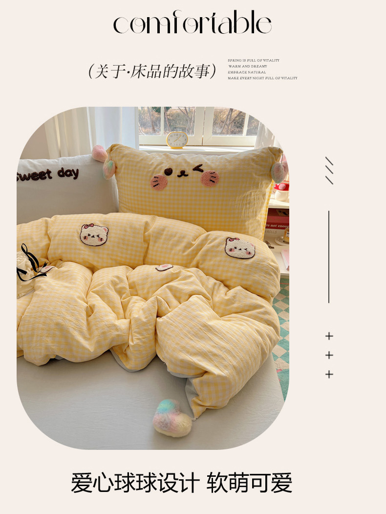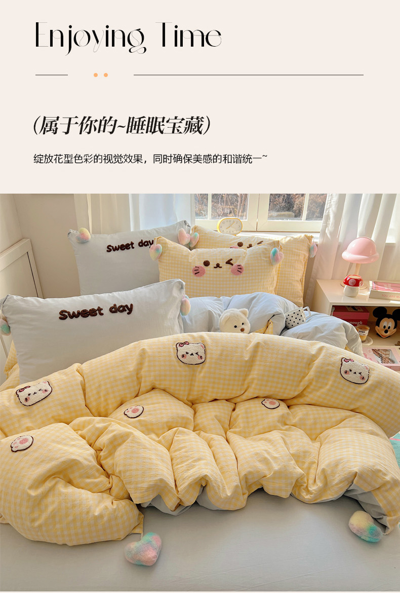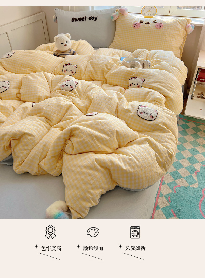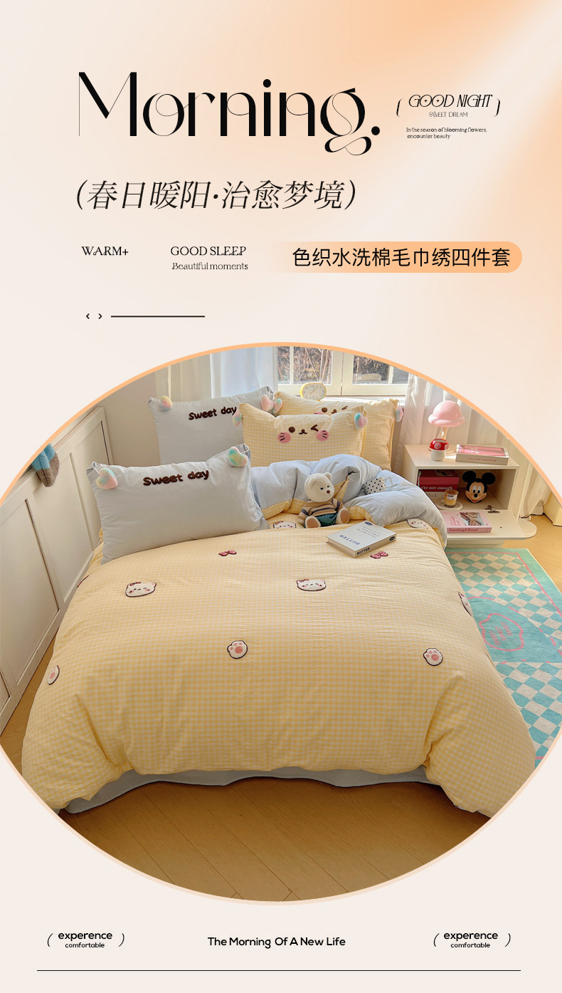 当前位置: 91家纺网 > 商品网购 > 床品套件 > 四件套 > 全棉普通四件套 > 丽涵家纺 2026新款全棉色织水洗棉毛巾绣四件套-甜心小猫 甜心小猫-黄格-简单款