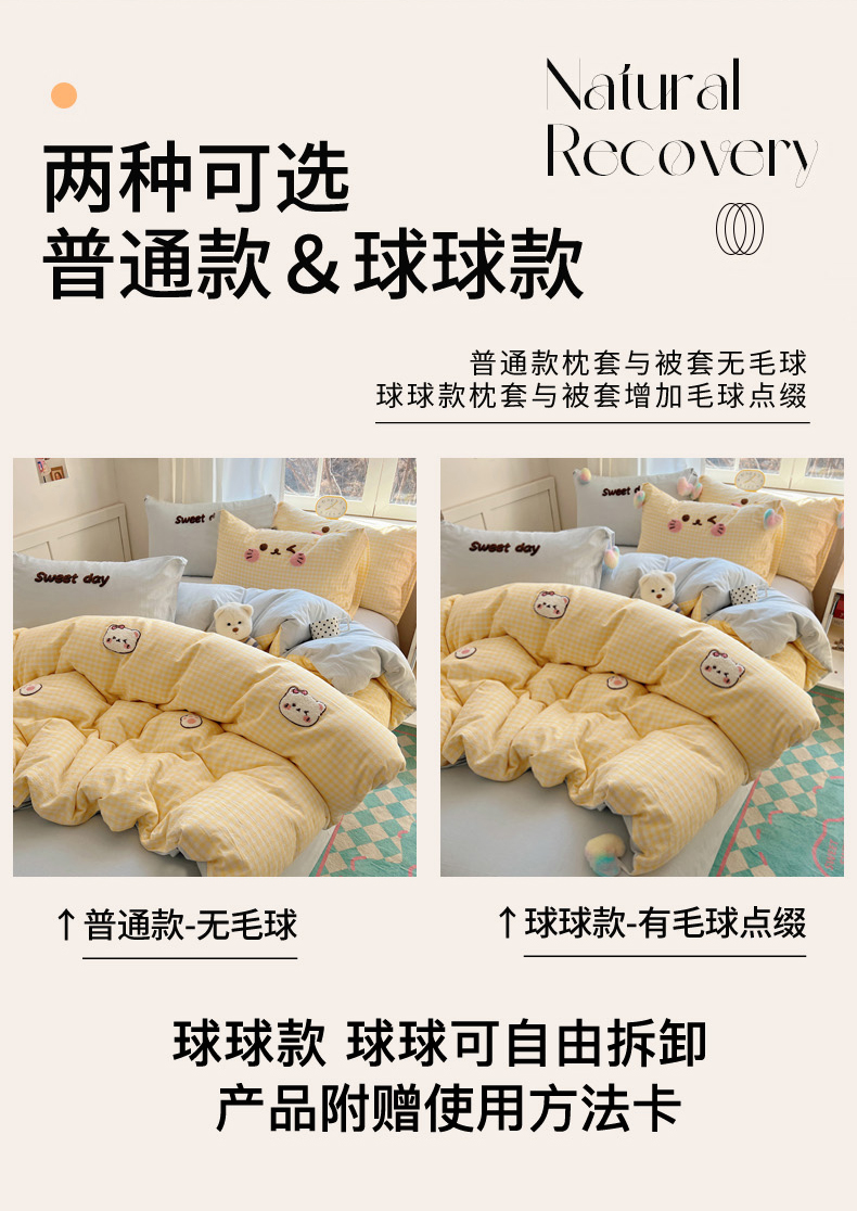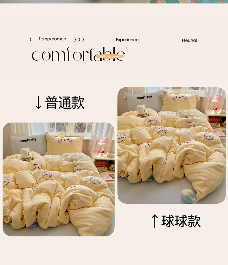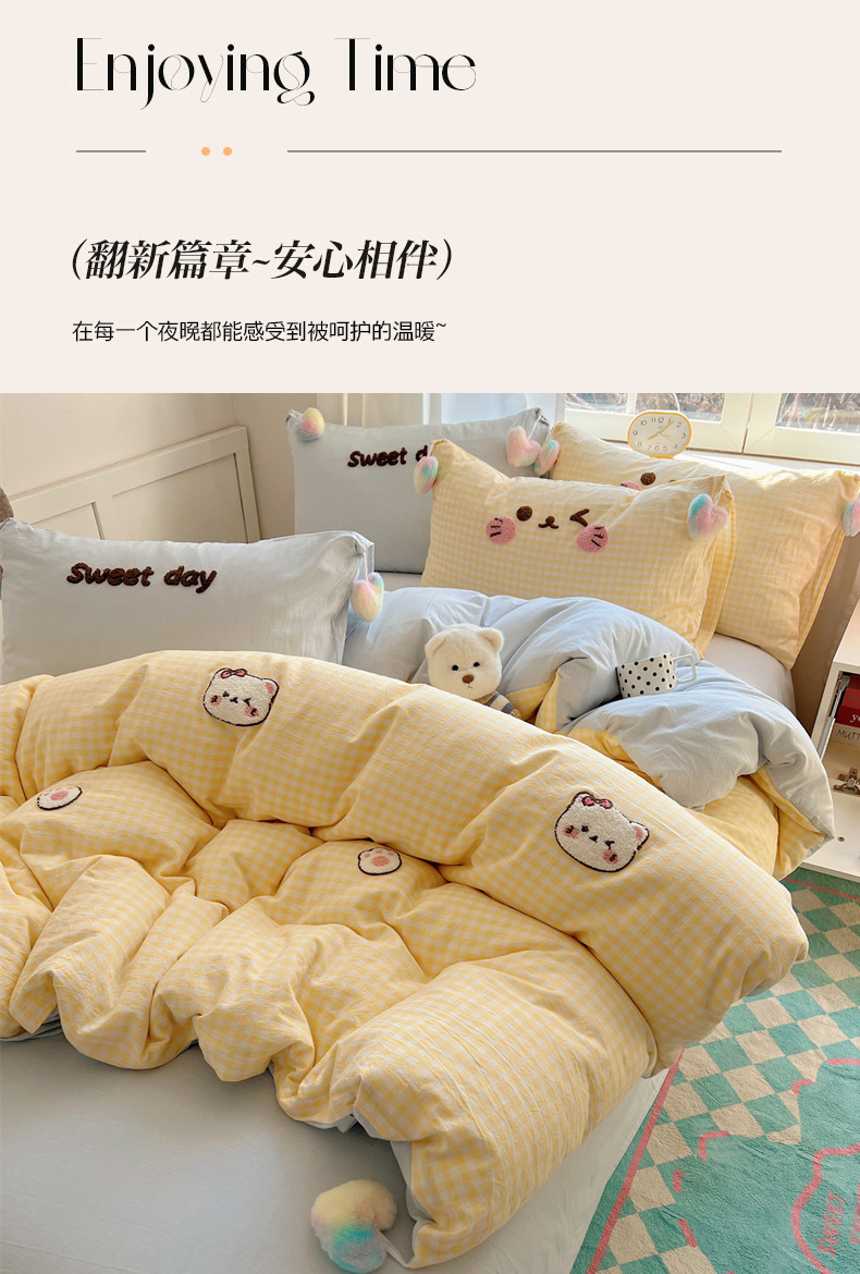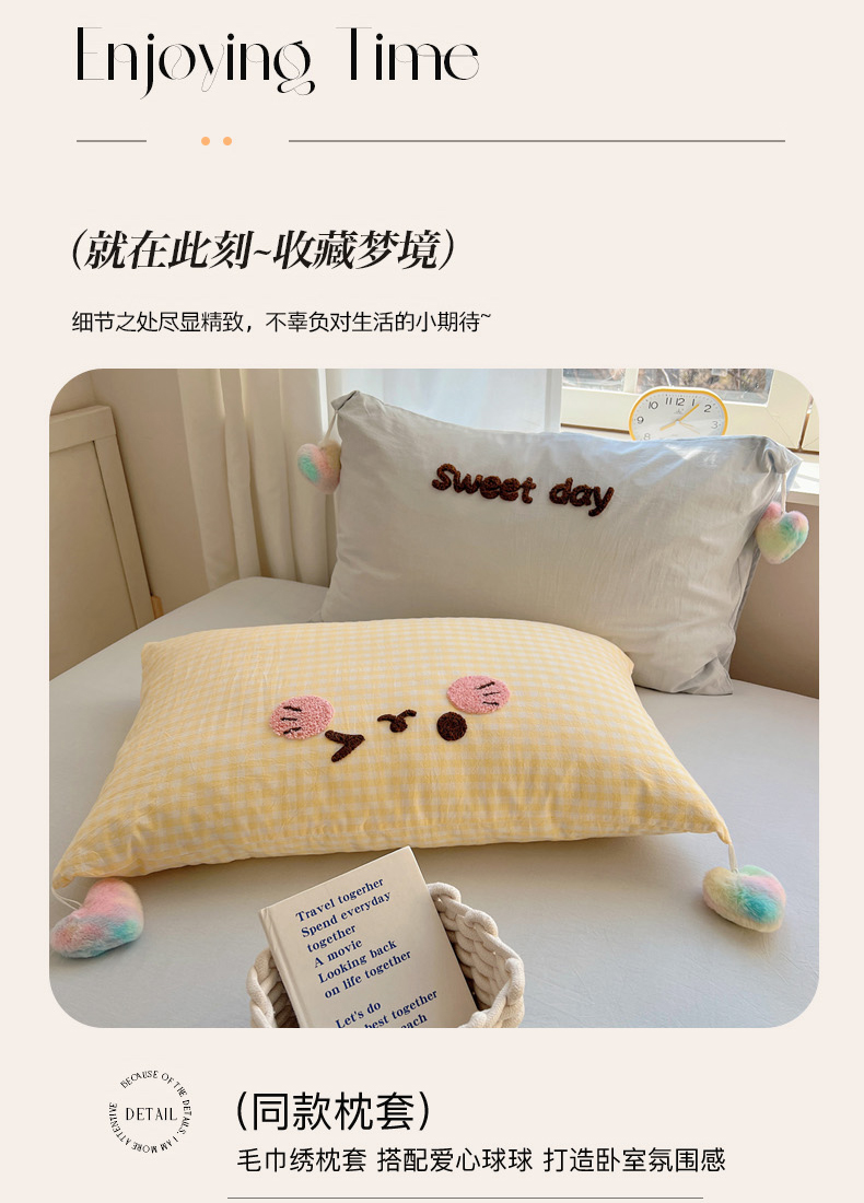 当前位置: 91家纺网 > 商品网购 > 床品套件 > 四件套 > 全棉普通四件套 > 丽涵家纺 2026新款全棉色织水洗棉毛巾绣四件套-甜心小猫 甜心小猫-黄格-简单款