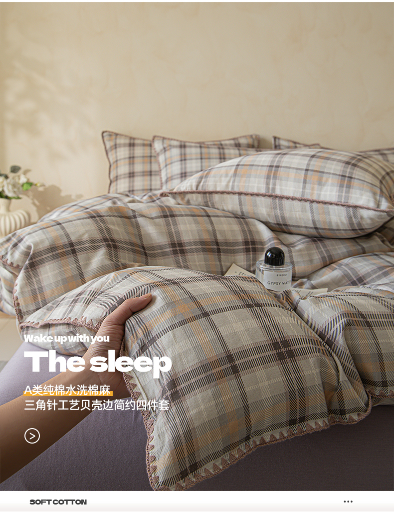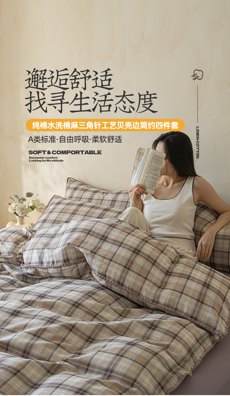 商品名称:(总)桃子家居 2026新款A类纯棉棉麻三角针工艺贝壳边简约水洗棉麻四件套系列