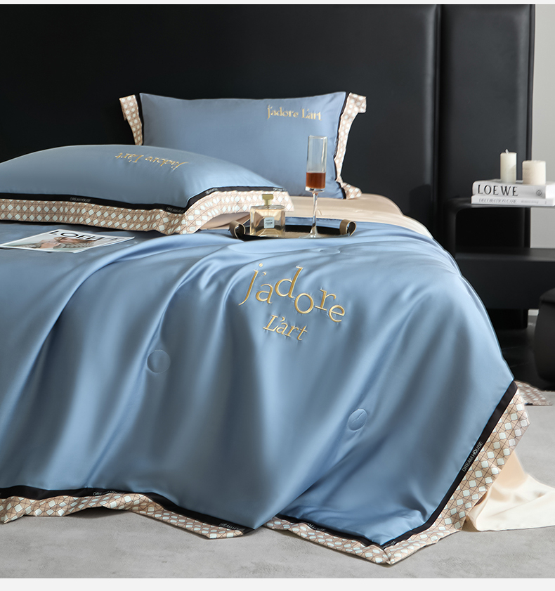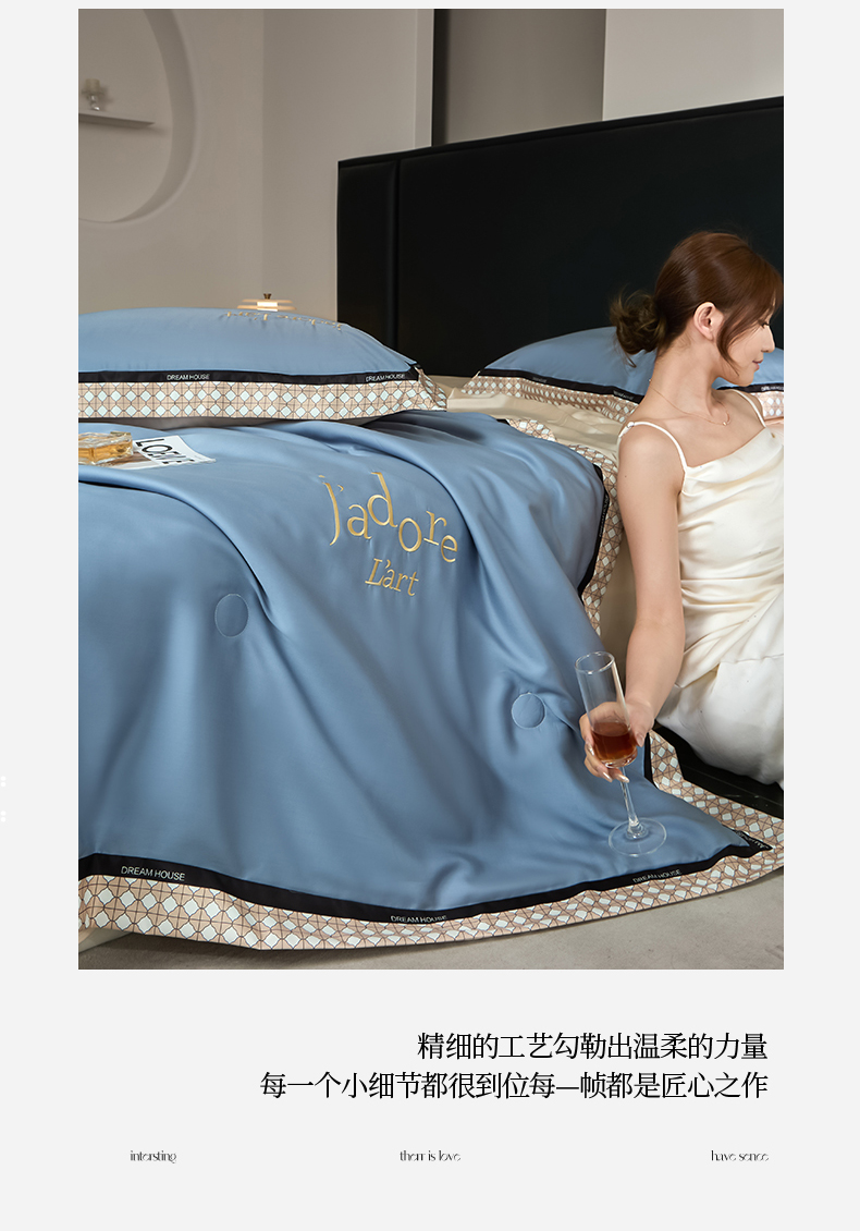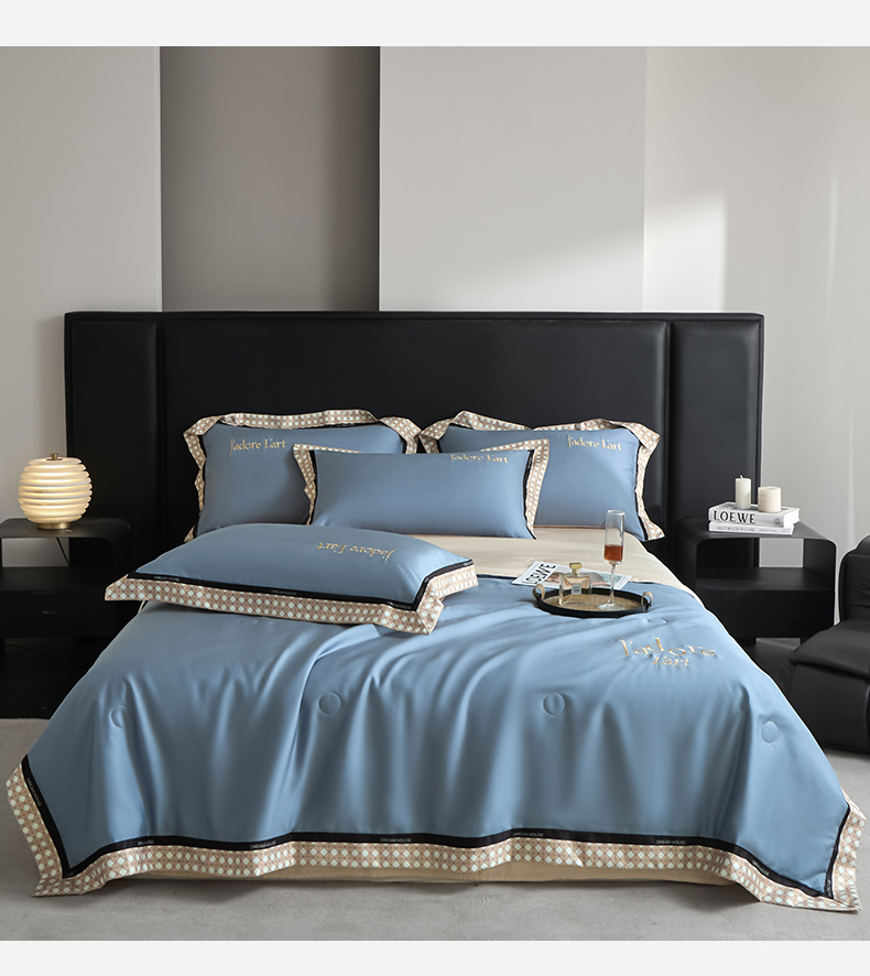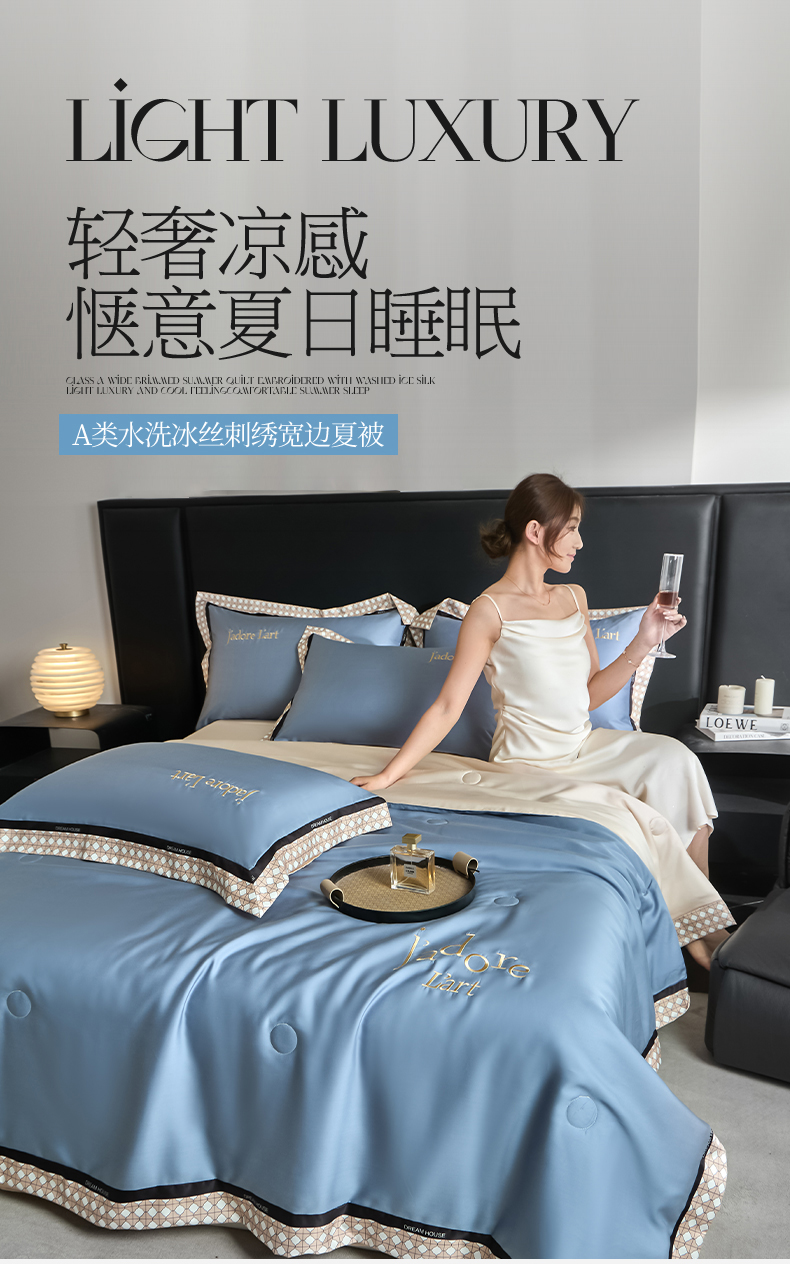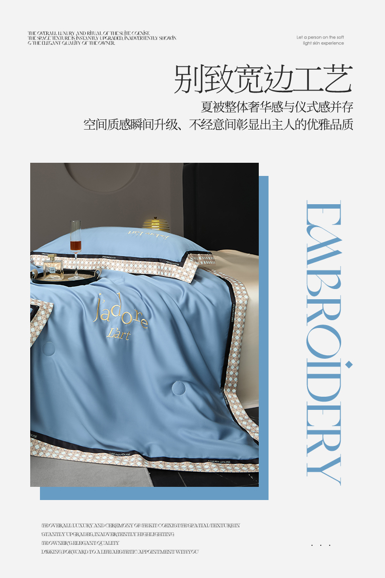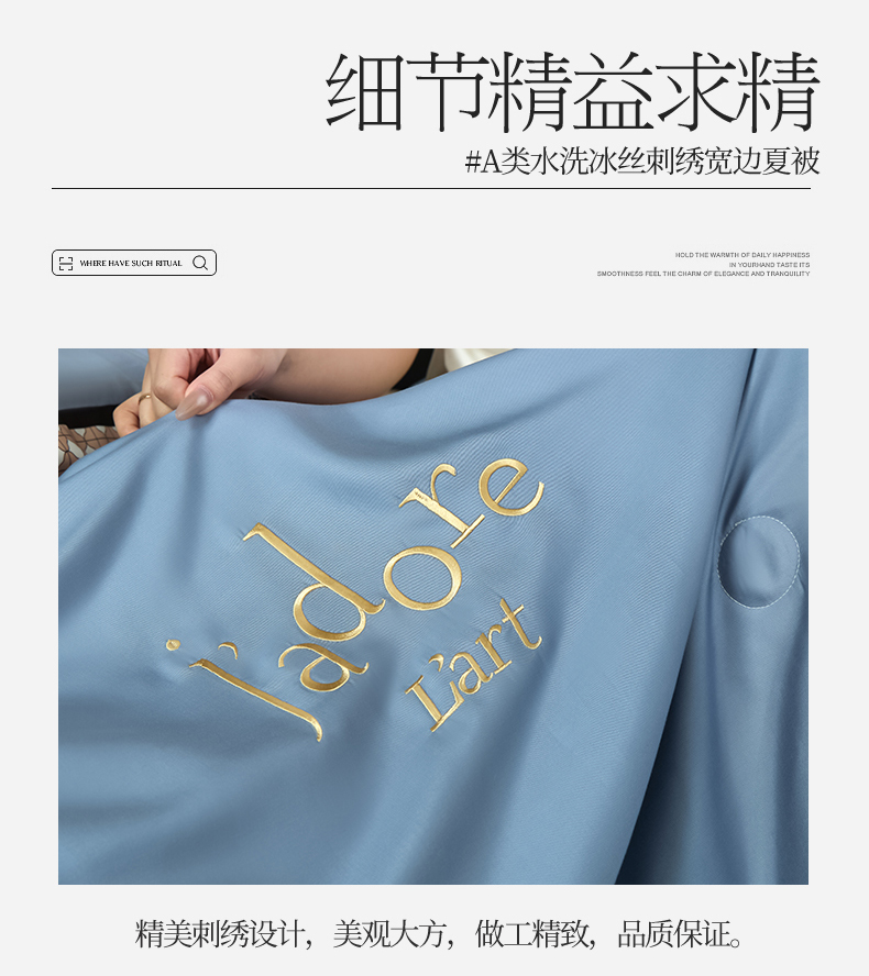 • 91家纺网 家纺一手货源 找家纺 笙意家纺 2026新款水洗冰丝刺绣宽边夏被四件套-艾斯系列 艾斯-宾利蓝+奶茶