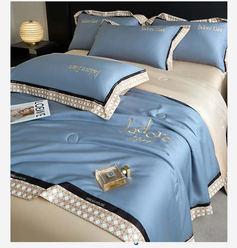 笙意家纺 2026新款水洗冰丝刺绣宽边夏被四件套-艾斯系列 艾斯-宾利蓝+奶茶