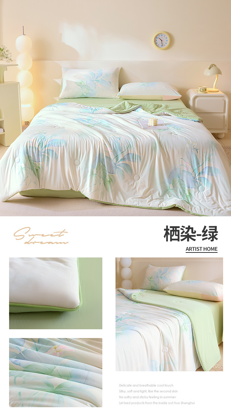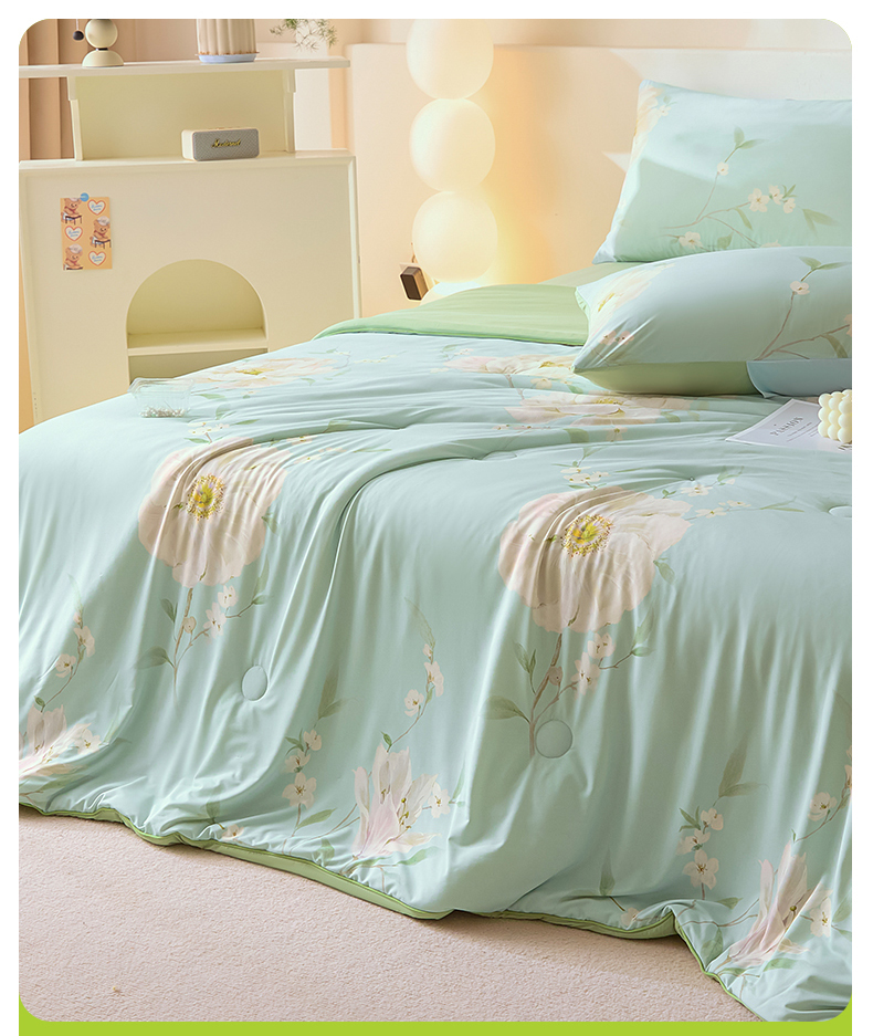 (总)恬思语家纺 2026春夏新品莱赛尔天丝印花蚕丝夏被夏凉被空调被,绮梦-玉,幸福里-绿