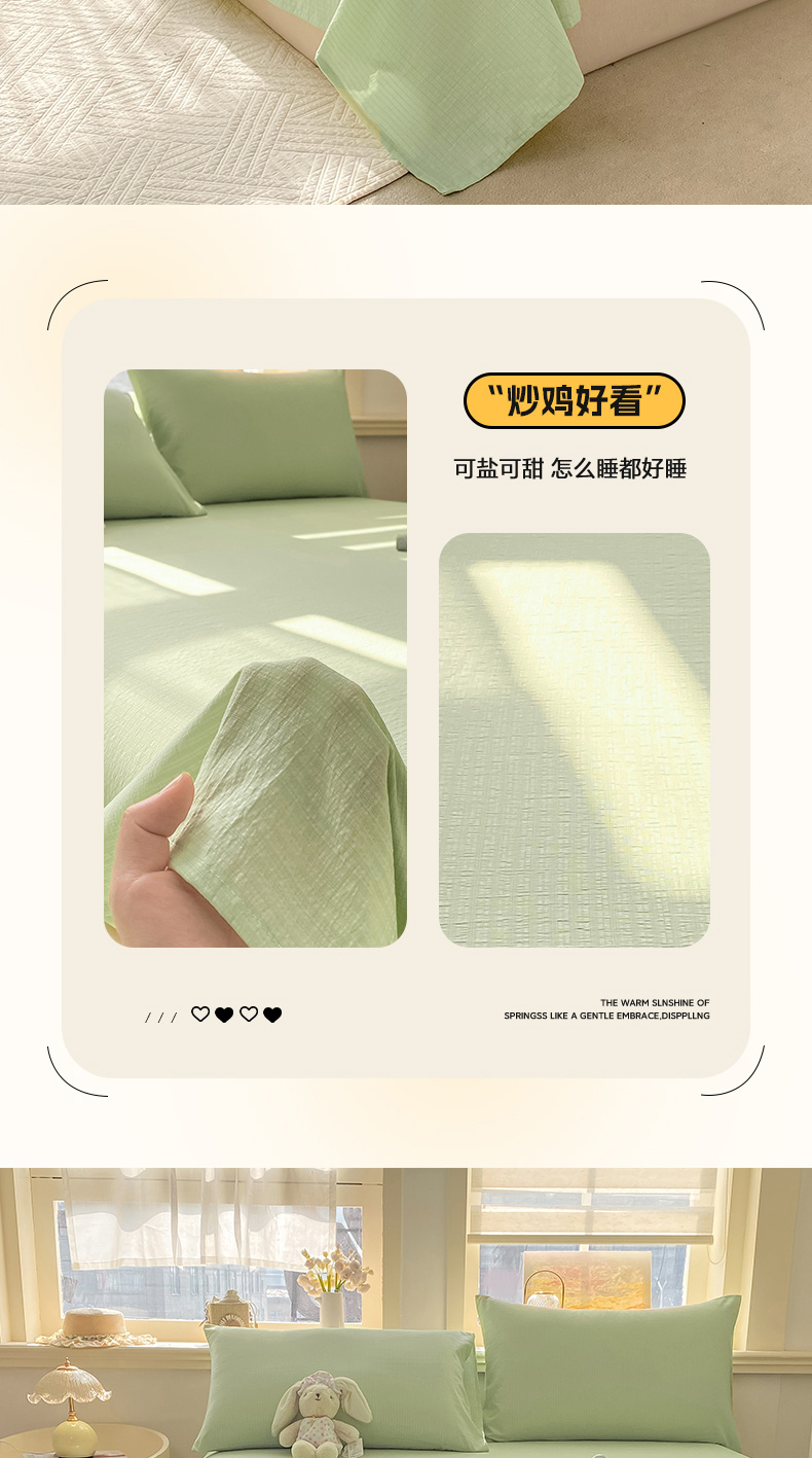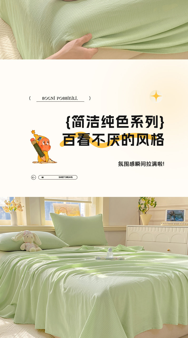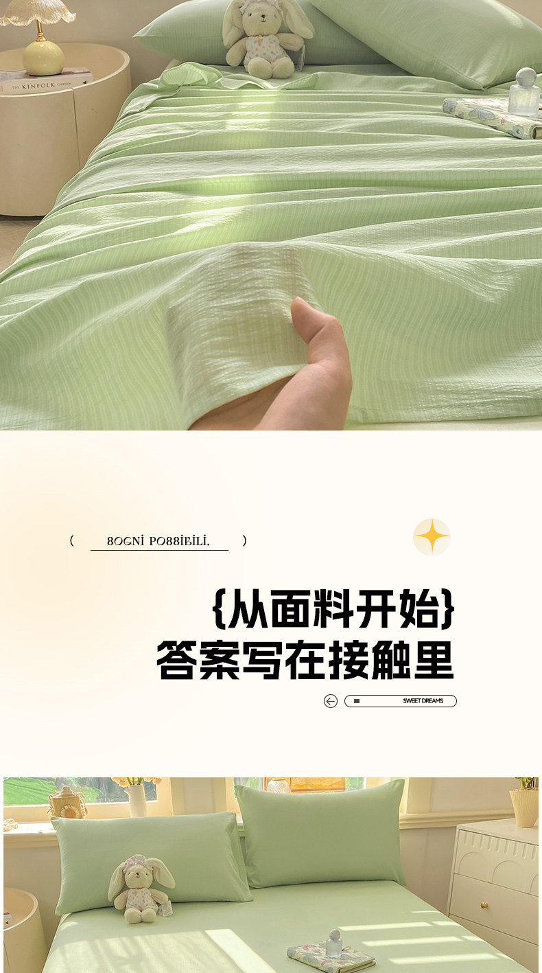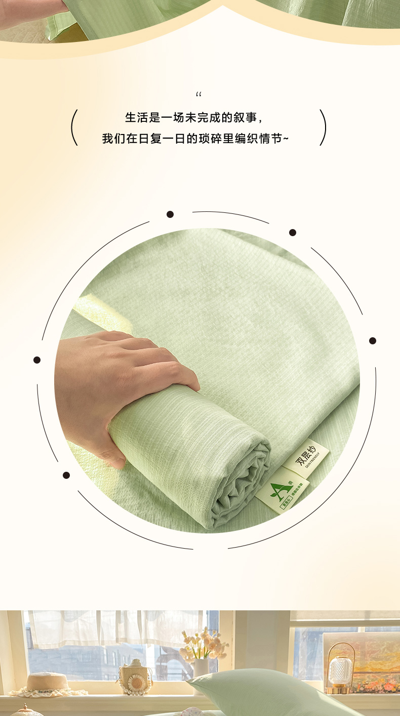 • 91家纺网 家纺一手货源 找家纺 晓时候 2026新款A类云感双层纱床单三件套单品单件床单 青竹绿