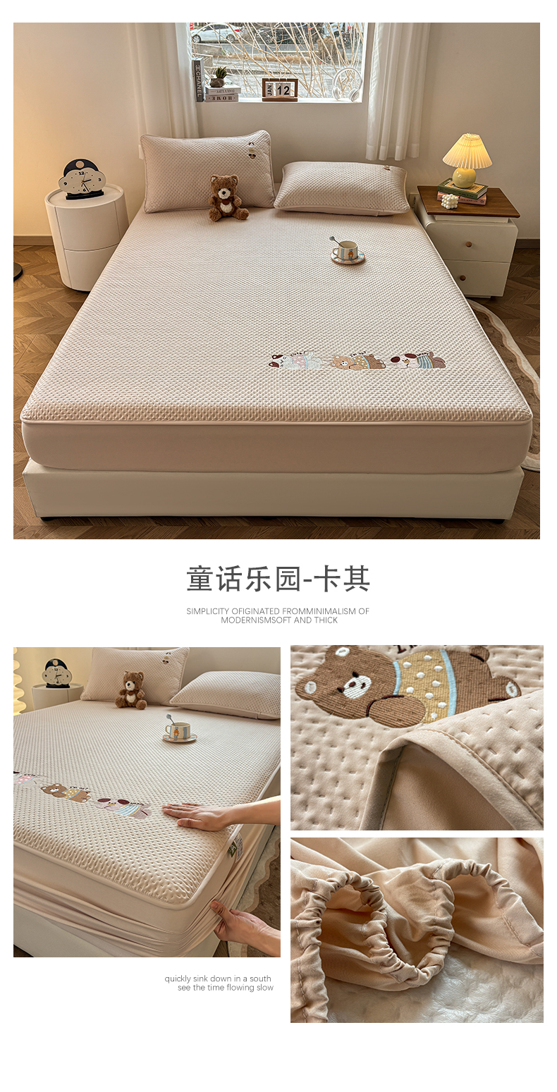 商品名称:居眠 2026新款卡通刺绣夹棉童话乐园防水床笠 童话乐园-卡其