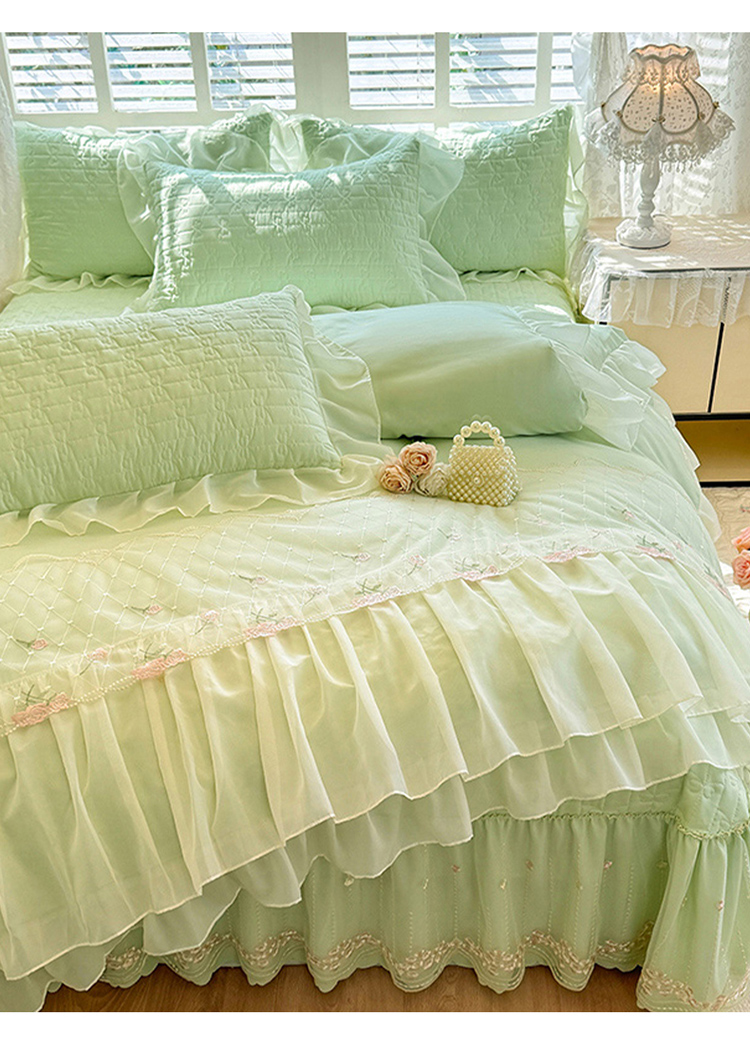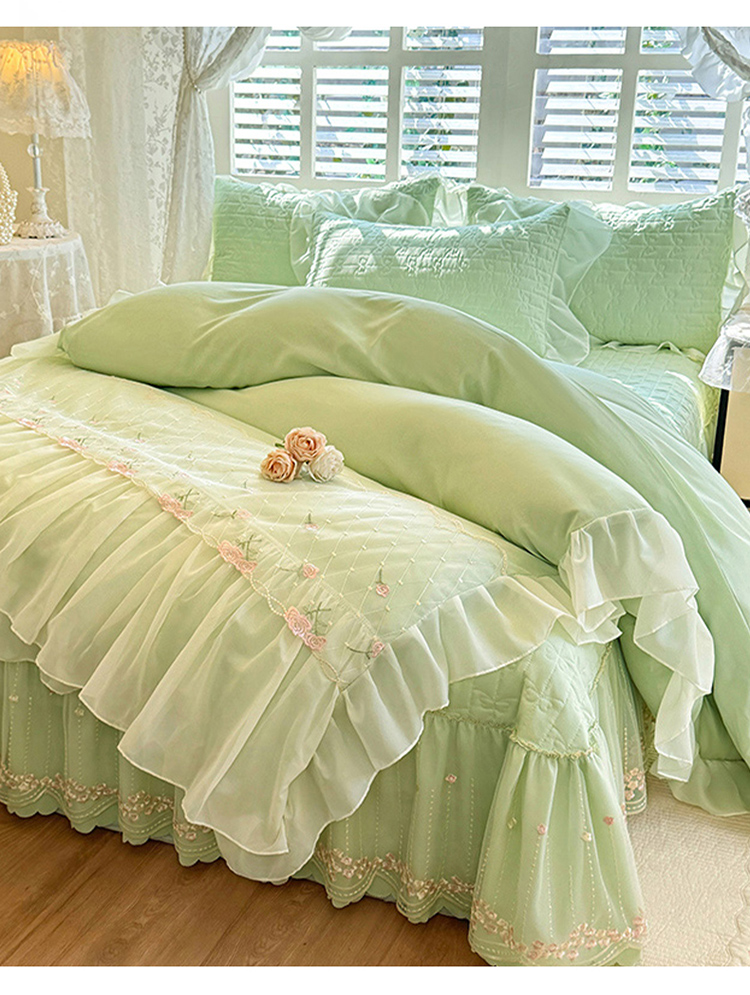苏米娜2026春夏新品韩版公主风超柔水洗棉床盖四件套刺绣针织棉双层纱纯棉棉麻全棉公主风床盖款四件套,秘密花园—樱花粉 ,秘密花园—嫩黄,秘密花园—奶昔白 ,秘密花园—新芽绿 ,秘密花园—婴儿蓝 ,秘密花园—梦幻紫